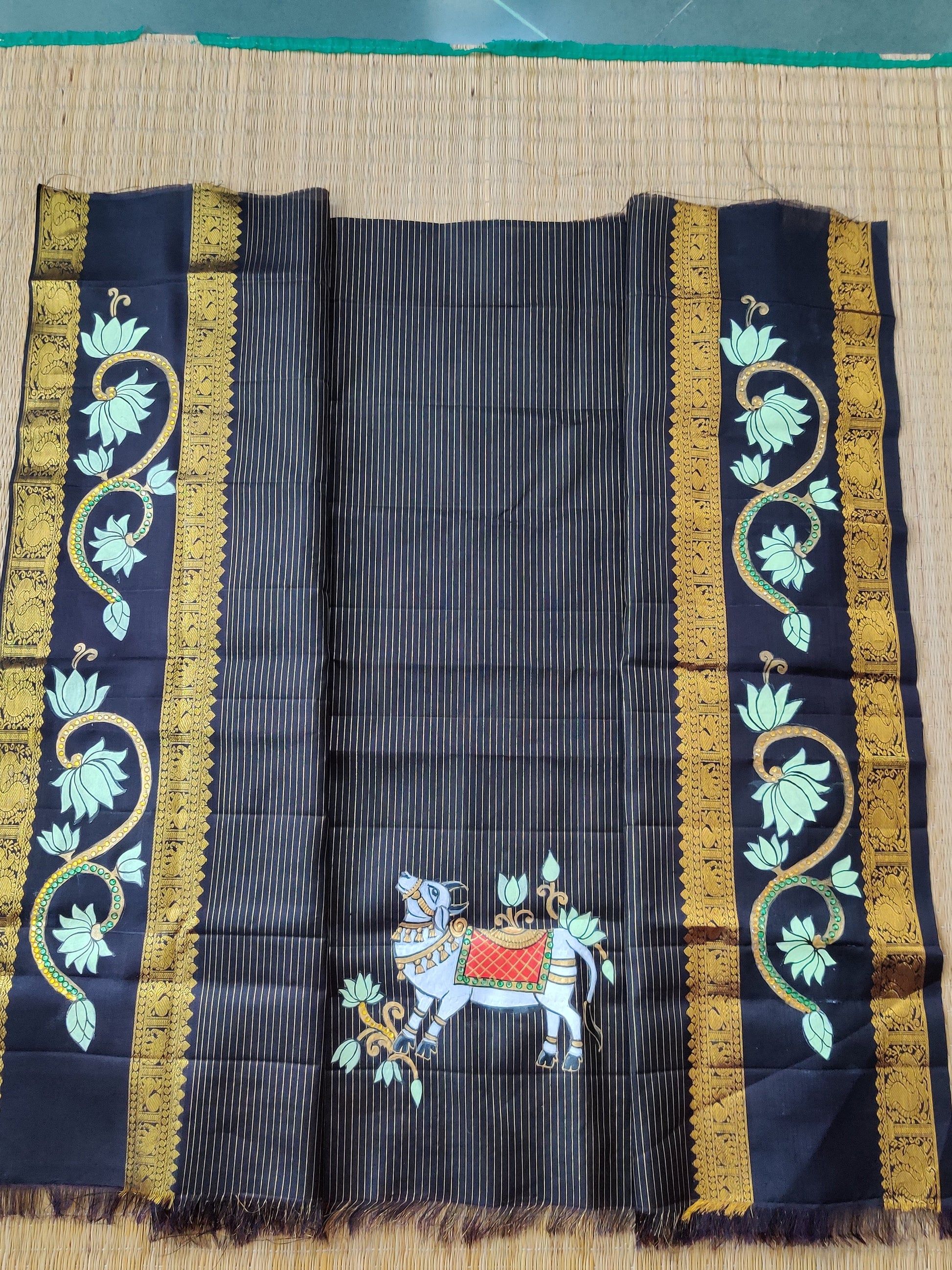Green Colour Kanchivaram Silk Saree With Thanjor Hand Painting Code : KA020