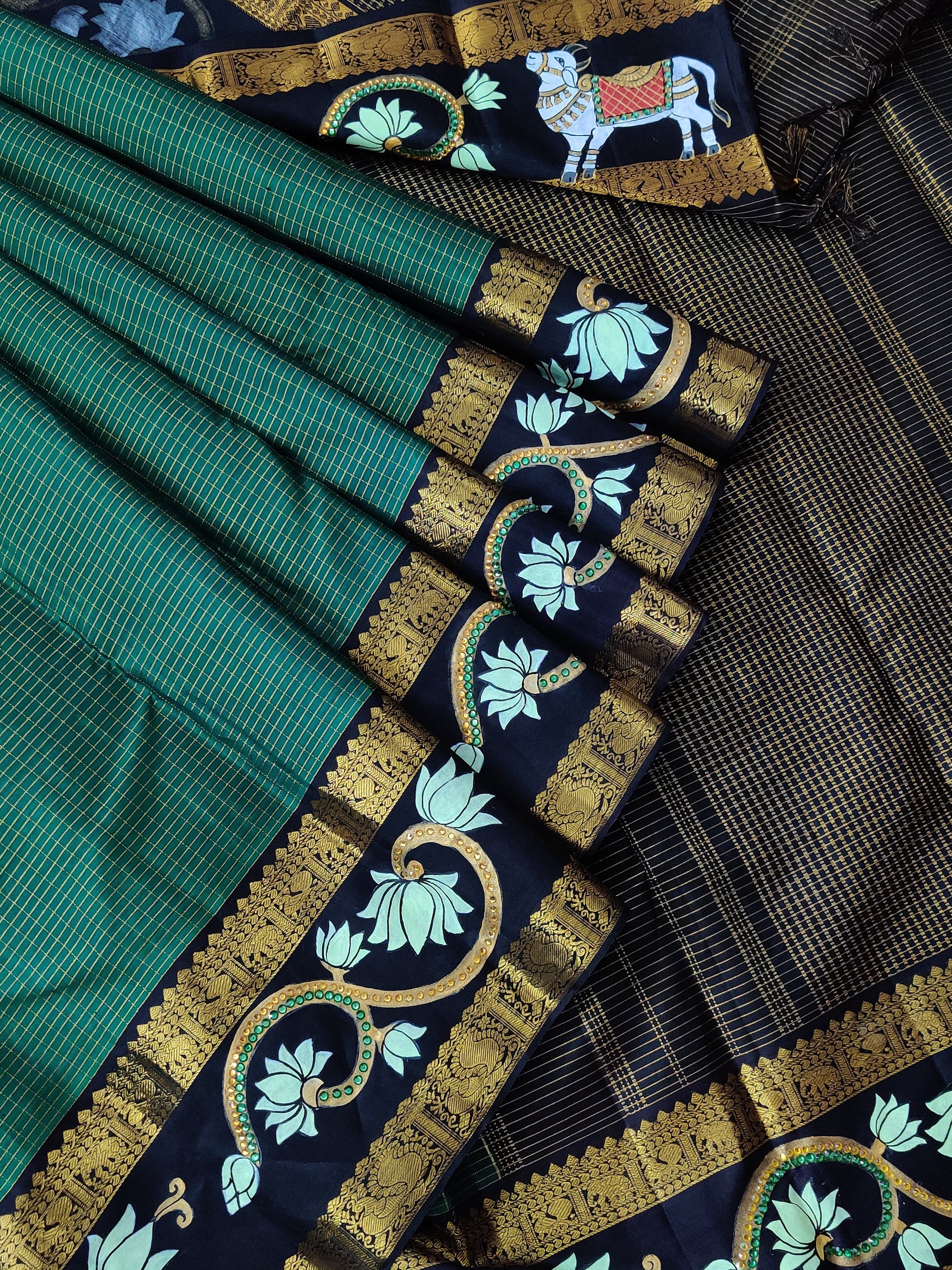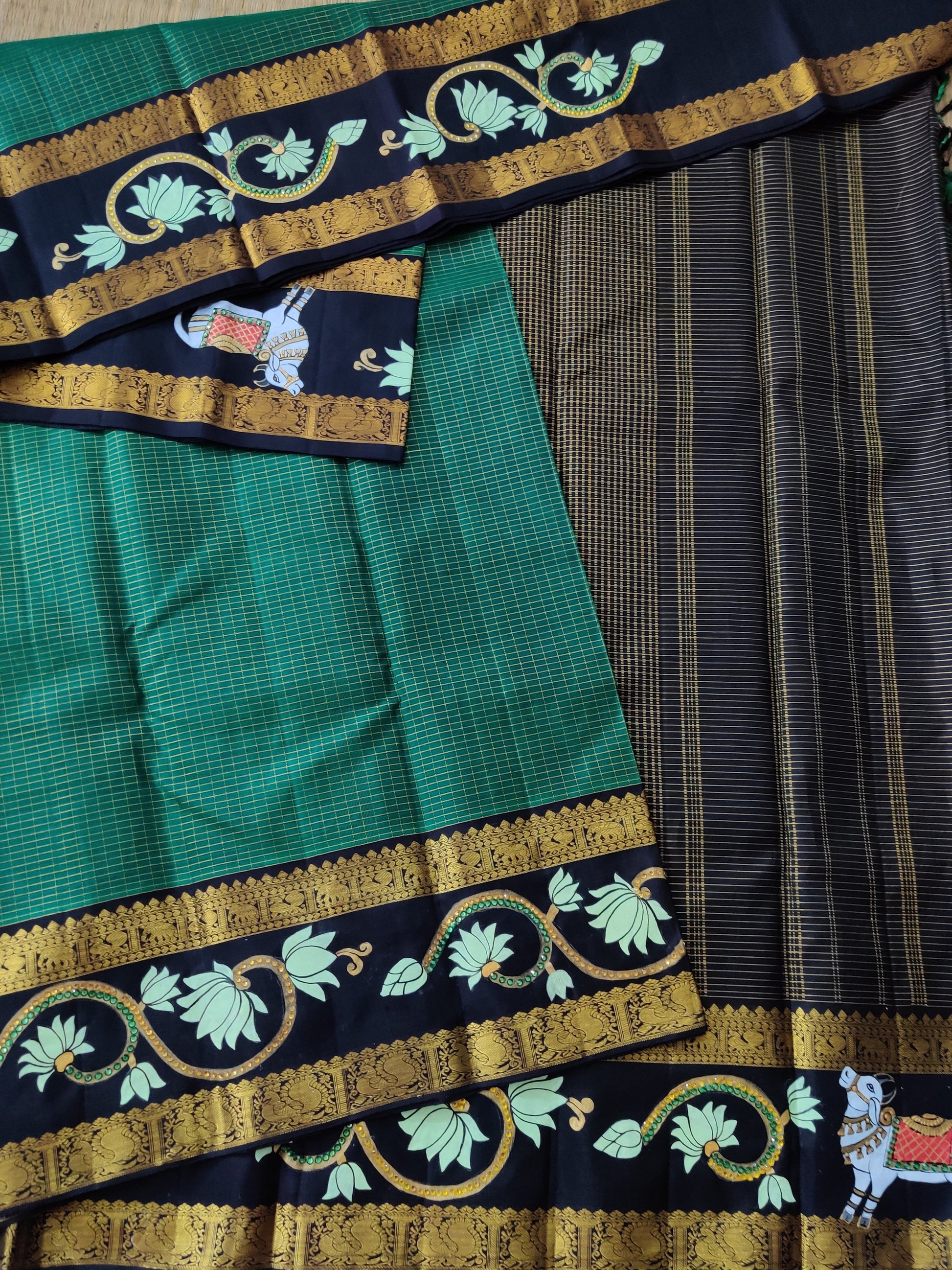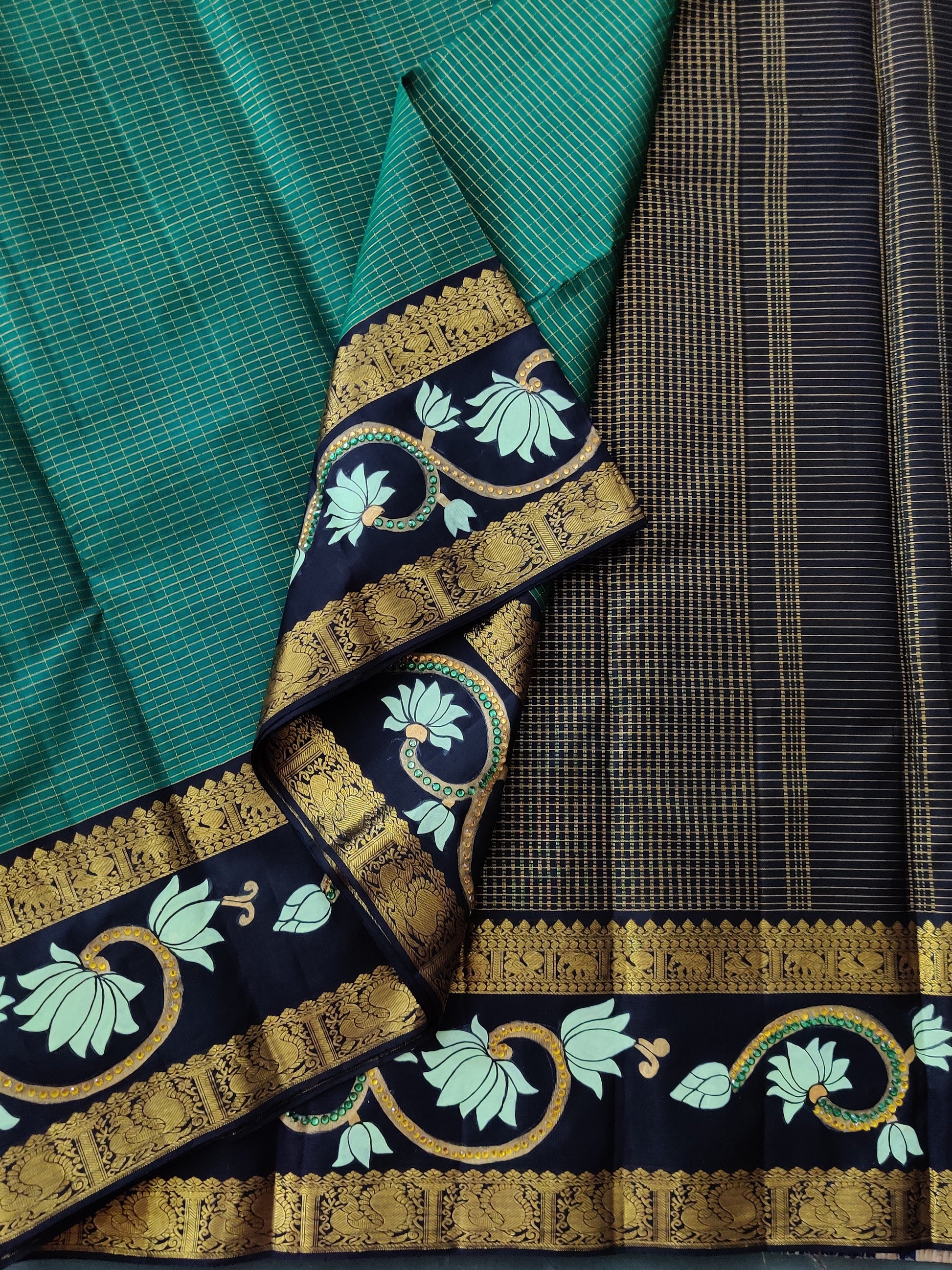 This exquisite green Kanchivaram silk saree features intricate zari checks throughout, complemented by a distinctive Thanjavur hand-painted border. The contrasting black zari pallu adds depth and elegance, while the matching blouse showcases coordinated checks and Thanjavur painting, creating a harmonious and sophisticated ensemble perfect for special occasions.