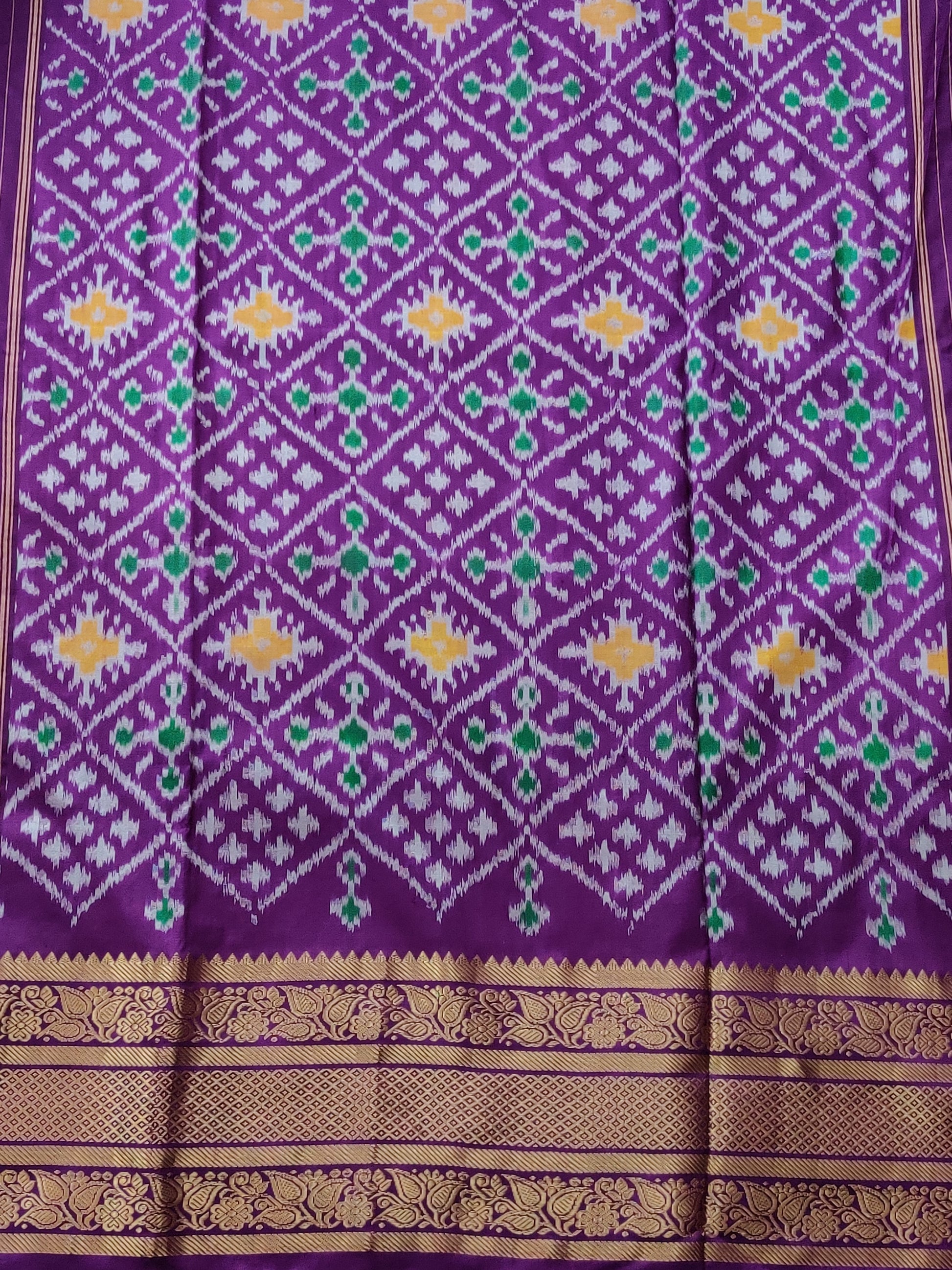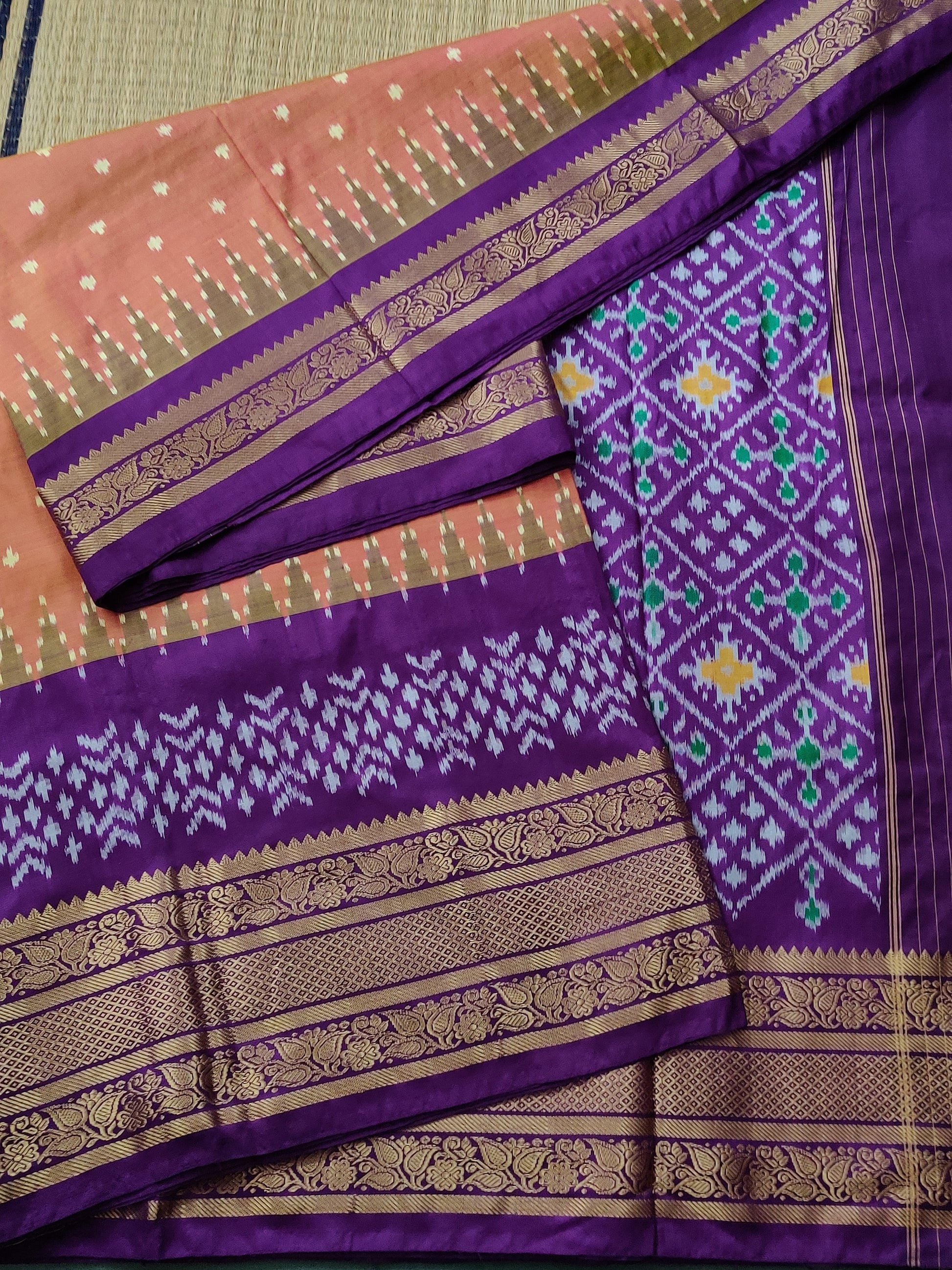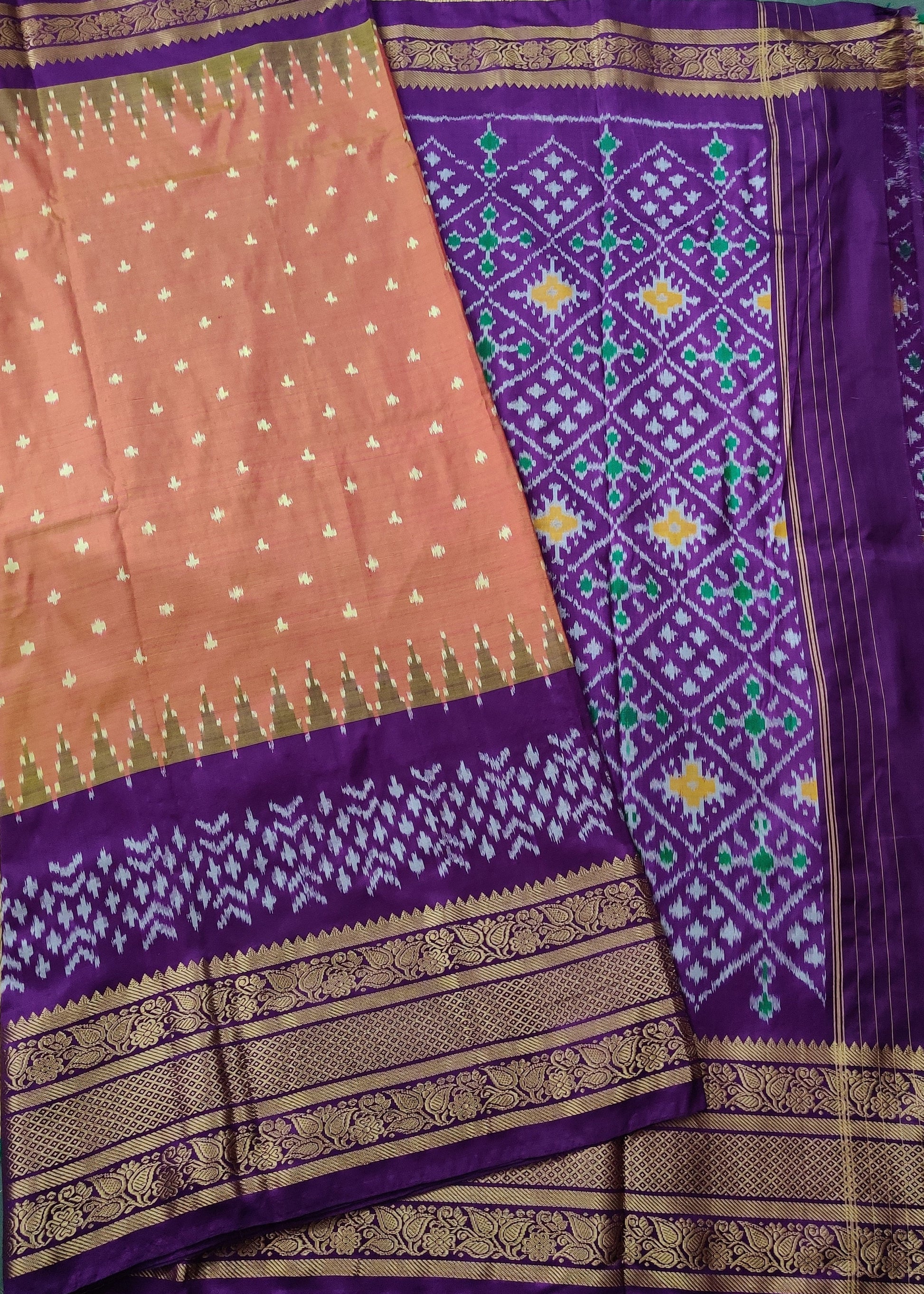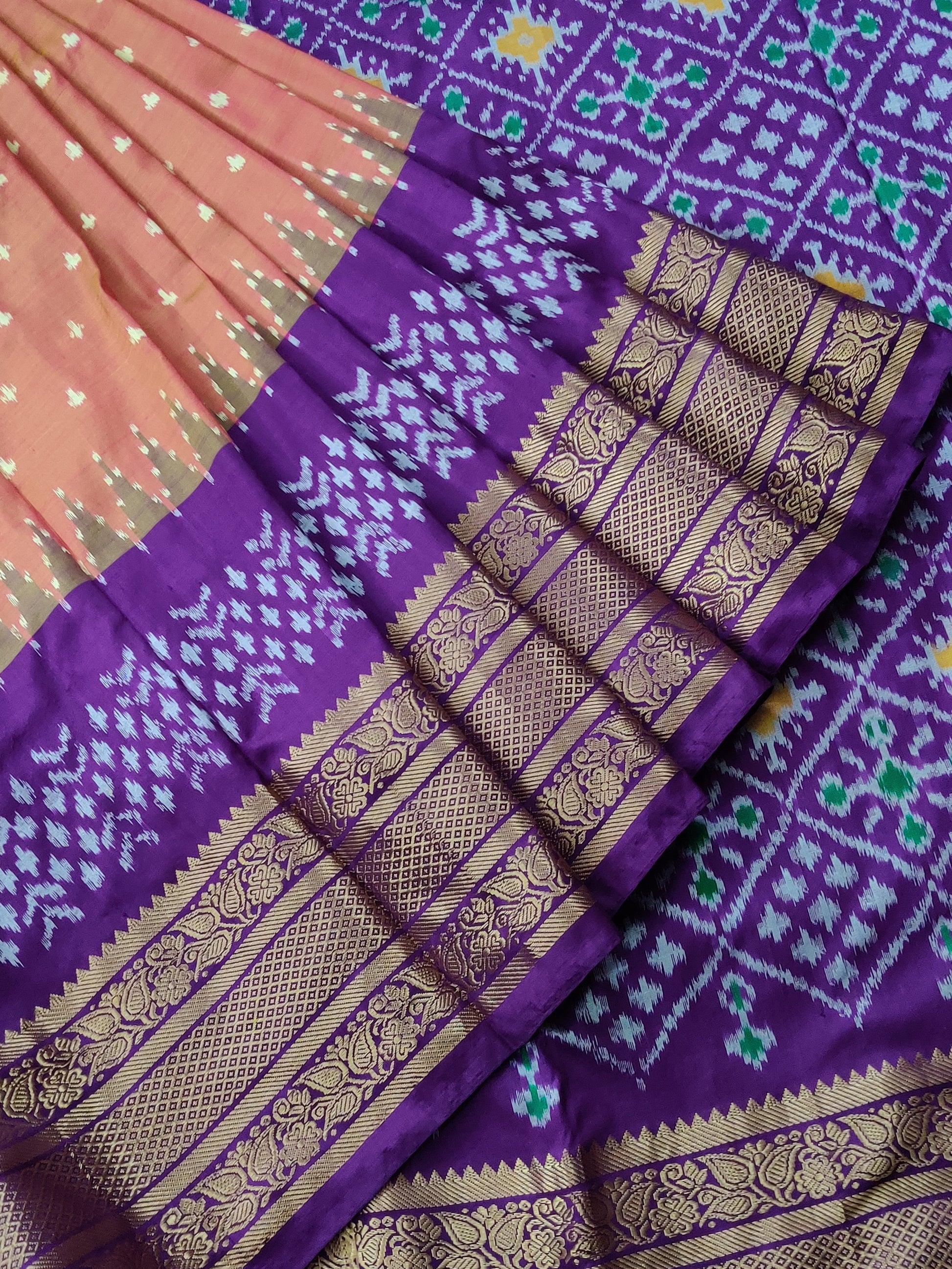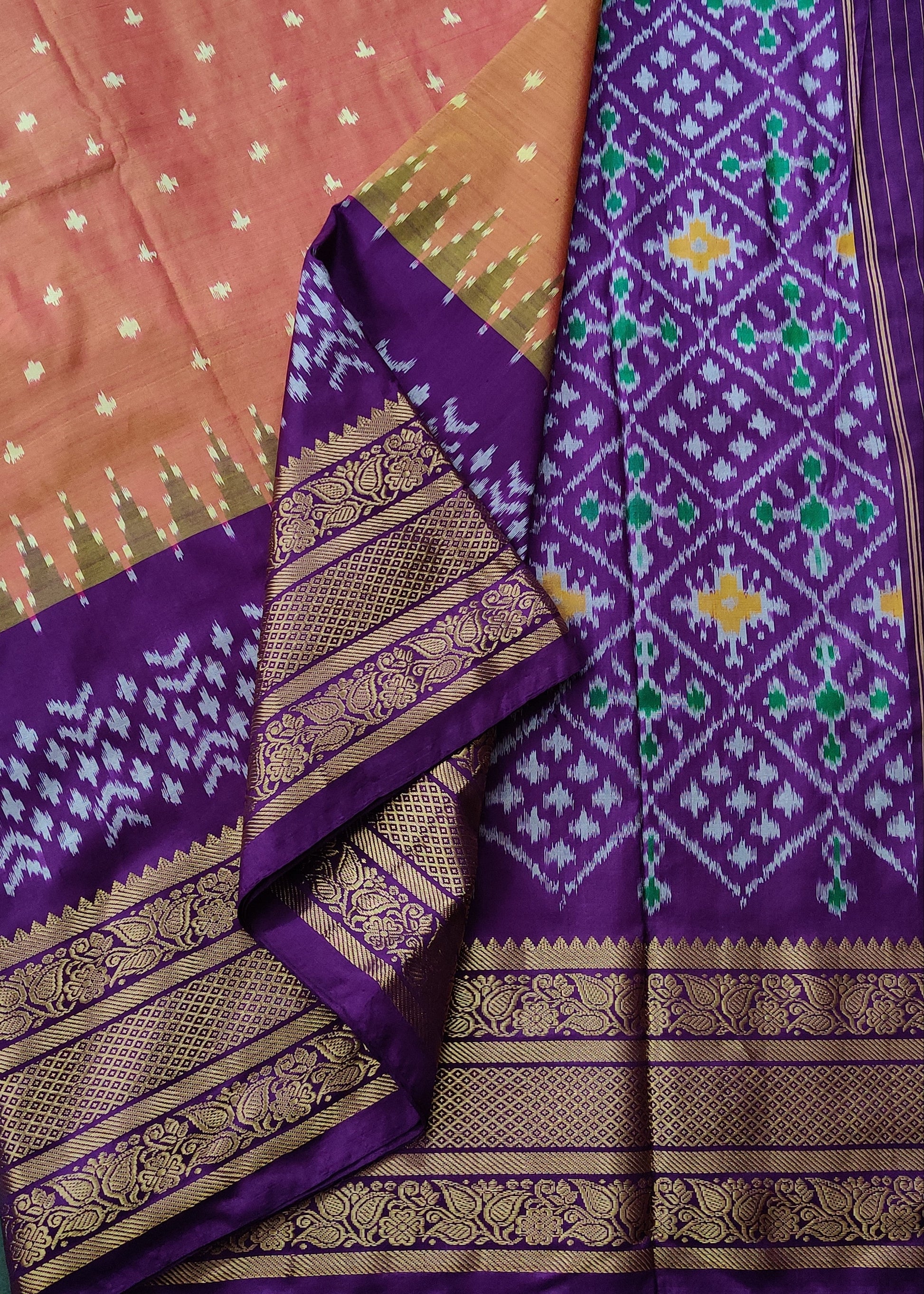 This dual-tone onion-colored ikkat silk saree features intricate ikkat weaving throughout, showcasing expert craftsmanship. The saree is elegantly complemented by a contrasting purple zari border and a beautifully woven ikkat pallu, adding depth and richness to its design. Paired with a matching ikkat blouse, this saree offers a sophisticated and timeless look perfect for special occasions.
