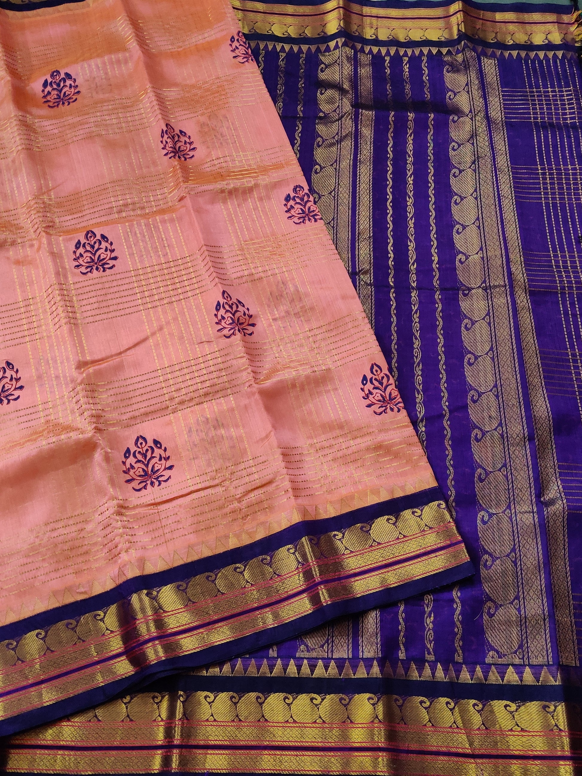Dual Tone Orang Colour Silk Cotton Saree With Zari Checks & Hand Block Print All Over Code : SC026