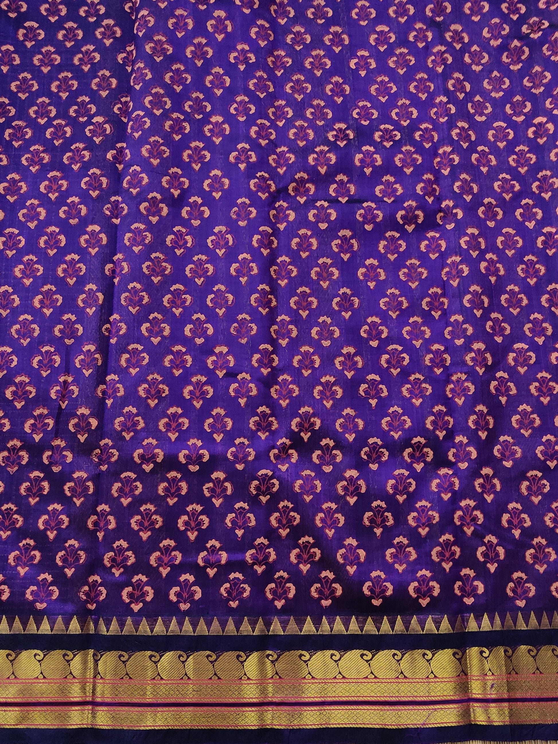 This elegant dual-tone orange silk cotton saree features intricate zari checks complemented by hand block prints all over, creating a refined texture and visual appeal. The contrasting blue zari border adds a striking edge, enhancing its traditional charm. Paired with a hand block print blouse, this saree offers a sophisticated blend of craftsmanship and style, perfect for festive occasions and formal events. Its breathable silk cotton fabric ensures comfort while maintaining an exquisite look.