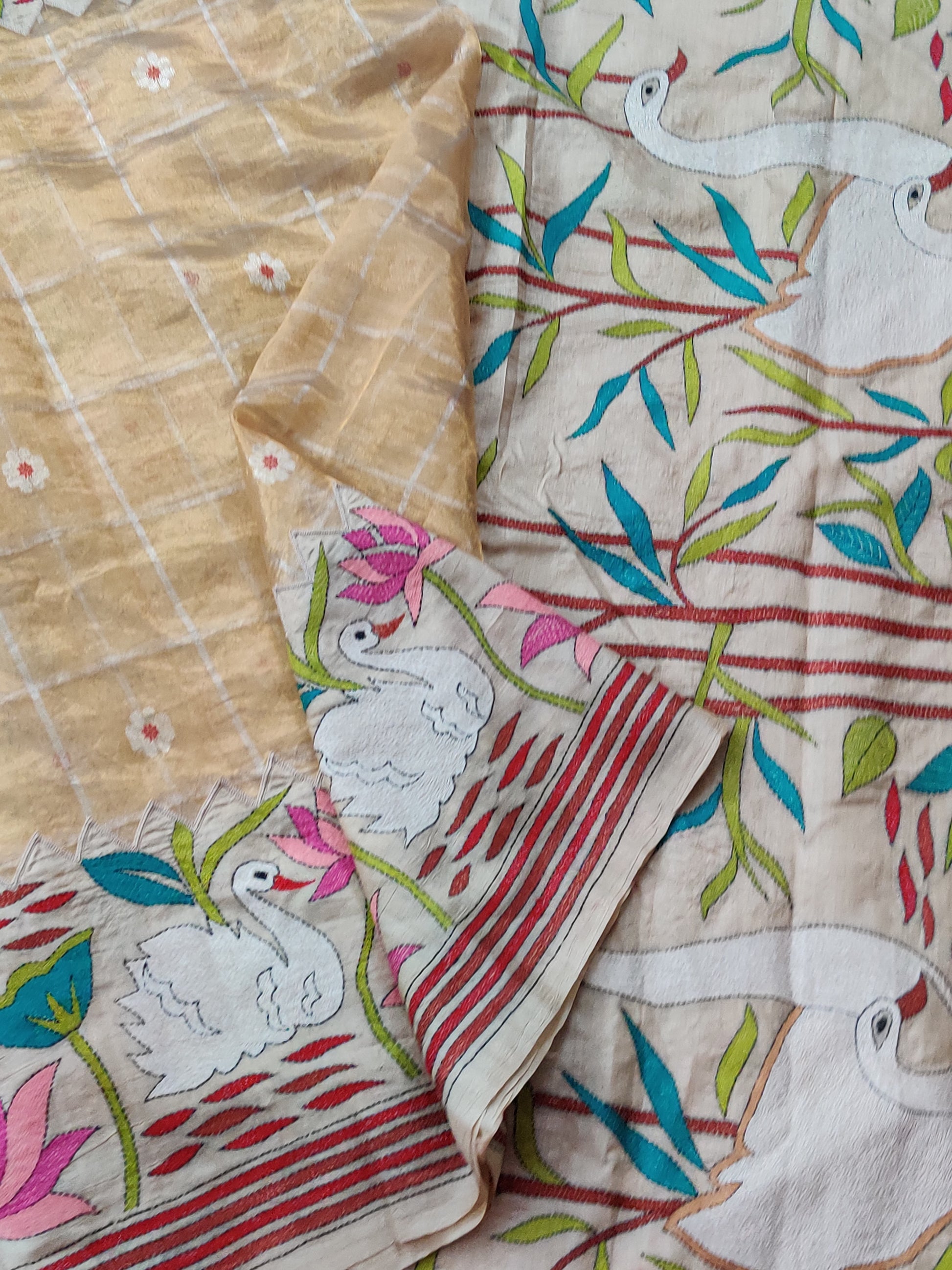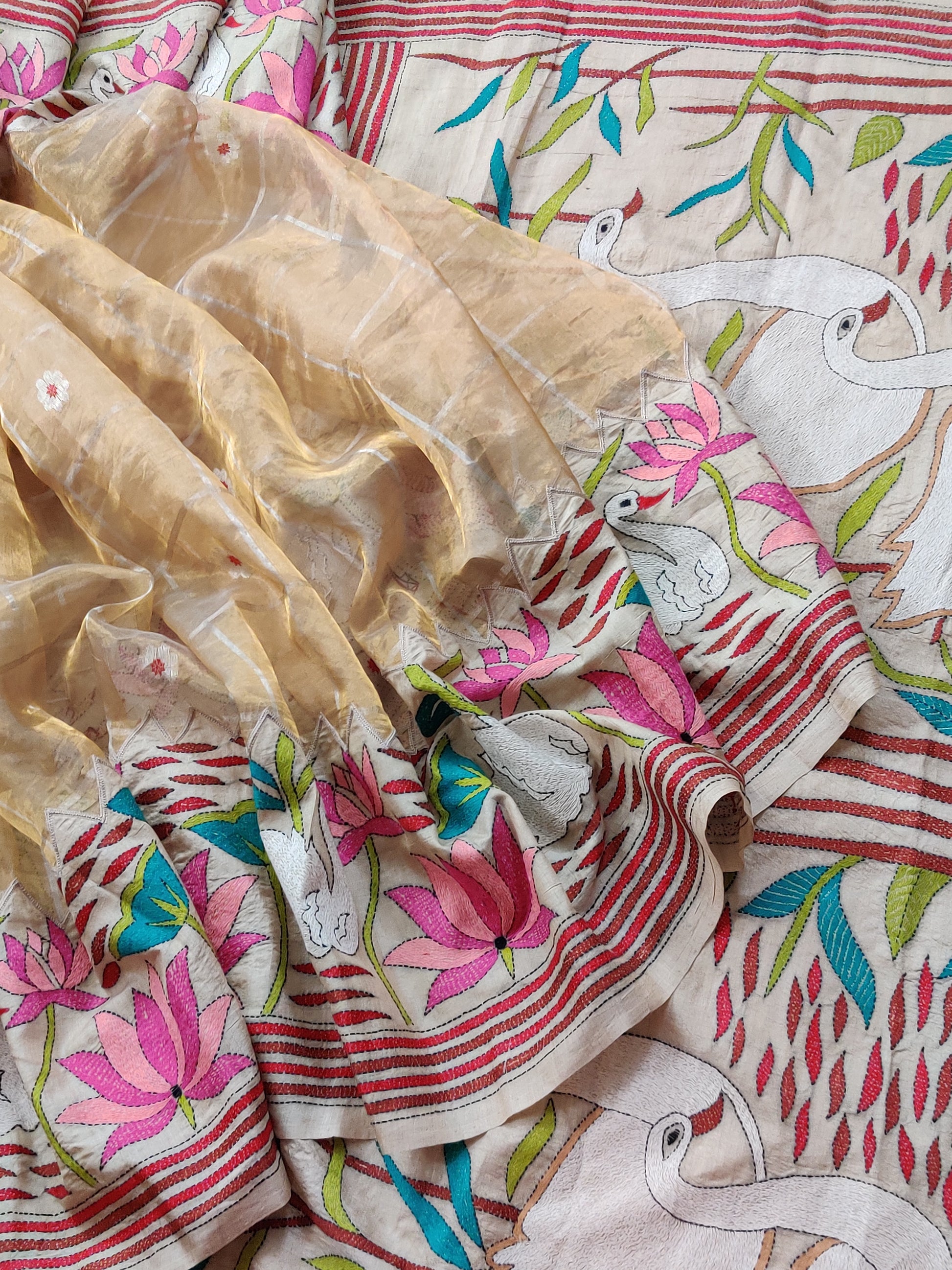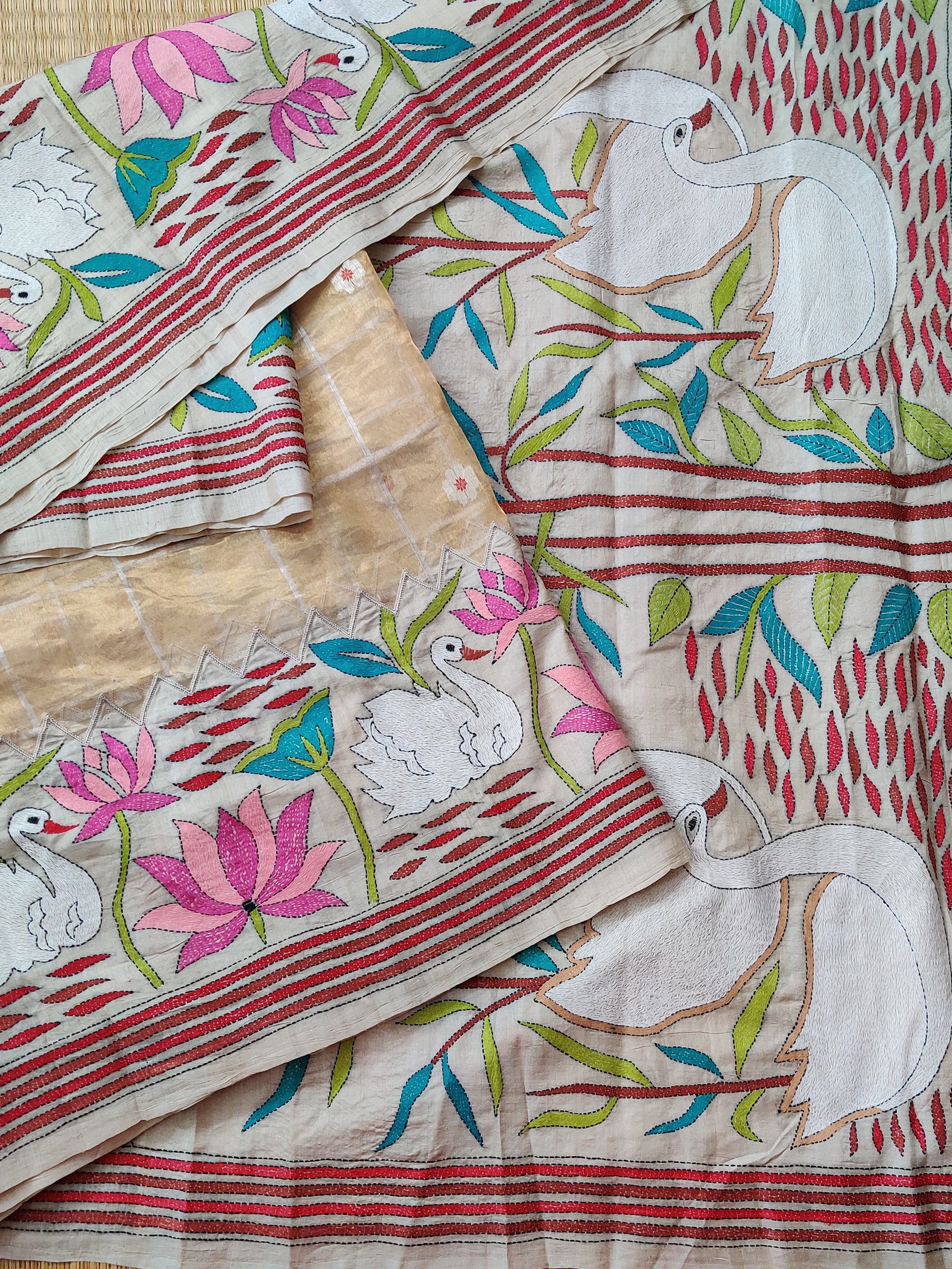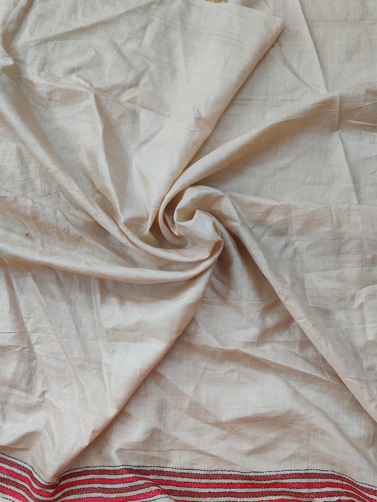 This unique Gold Colour Chanderi & Tussar Fusion Saree boasts a stunning combination of zari work and kantha borders, making it a showstopper in any occasion. The saree is expertly crafted from luxurious materials and comes with a plain blouse for added convenience. Elevate your wardrobe with this must-have saree.