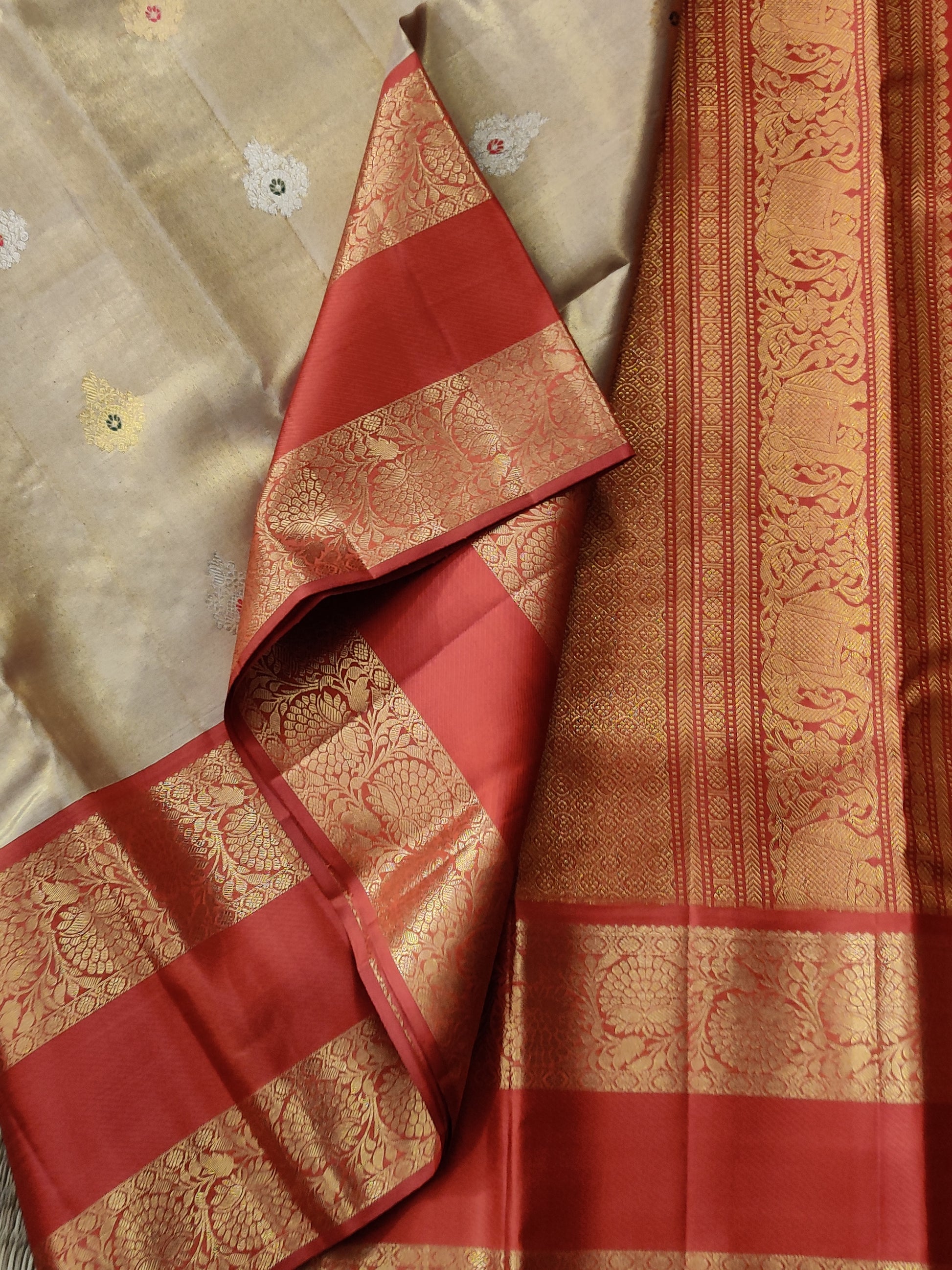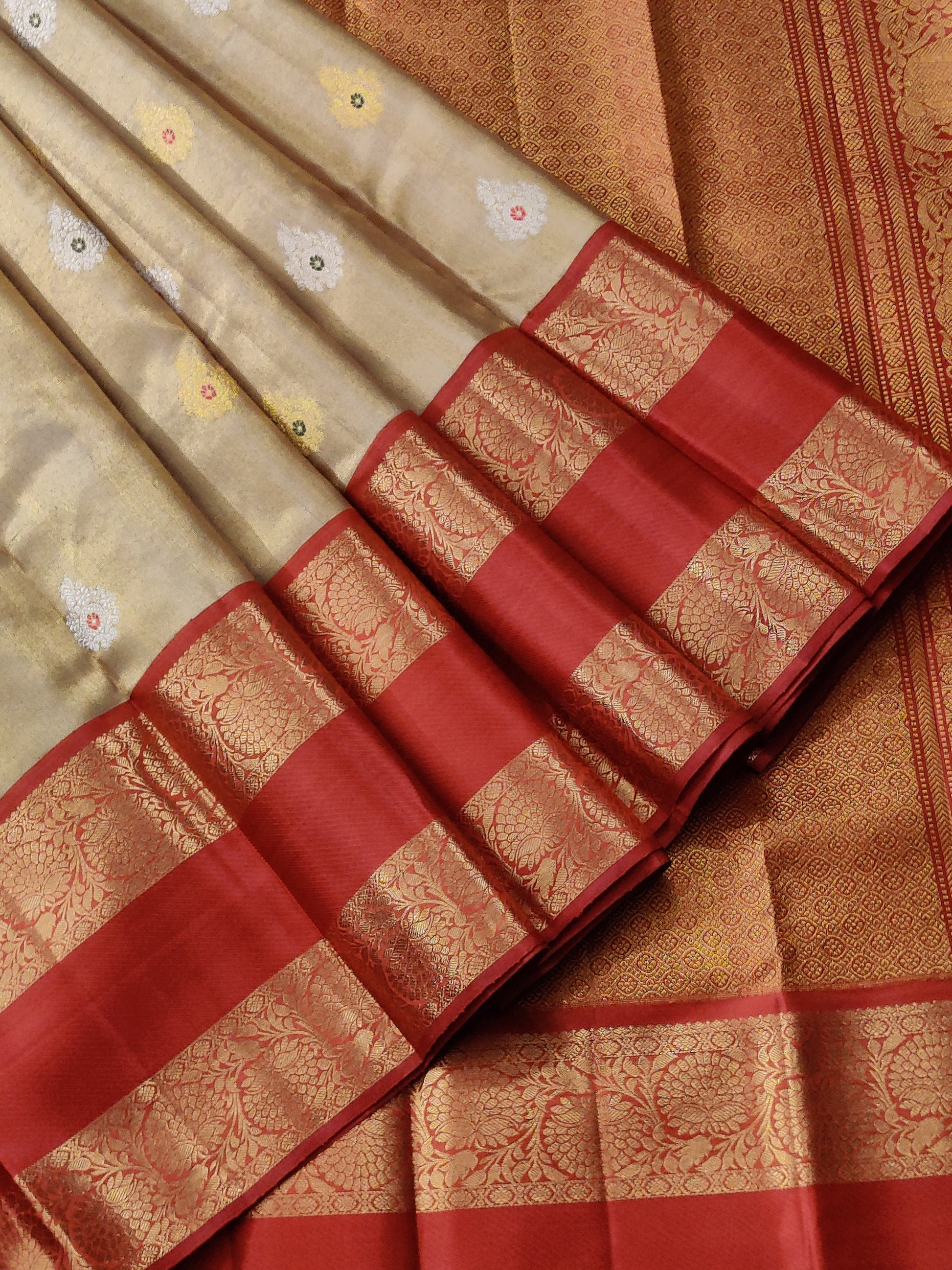 Gold Colour Tissue Kanchivaram Silk Saree With Gold & Silver Zari Butta All Over Code : KA0260