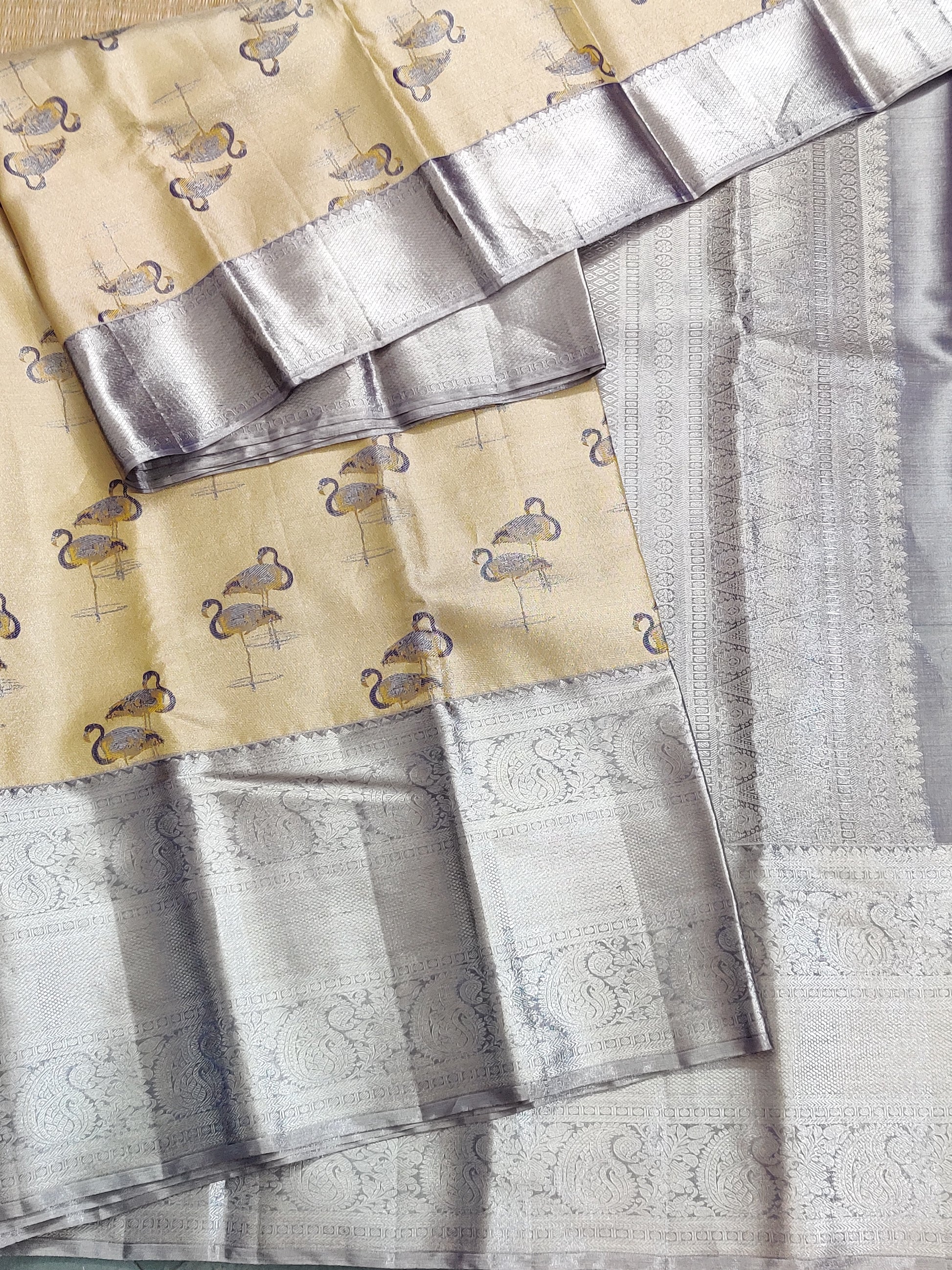 This exquisite gold tissue Kanchivaram silk saree features delicate thread-woven swan motifs throughout, adding a timeless elegance. Enhanced by a contrasting grey zari border and intricately crafted zari pallu, it offers a harmonious blend of tradition and sophistication. The saree comes with a plain blouse, allowing the rich textures and motifs to stand out beautifully. Ideal for festive occasions and celebrations, this saree showcases expert craftsmanship synonymous with authentic Kanchivaram silk.