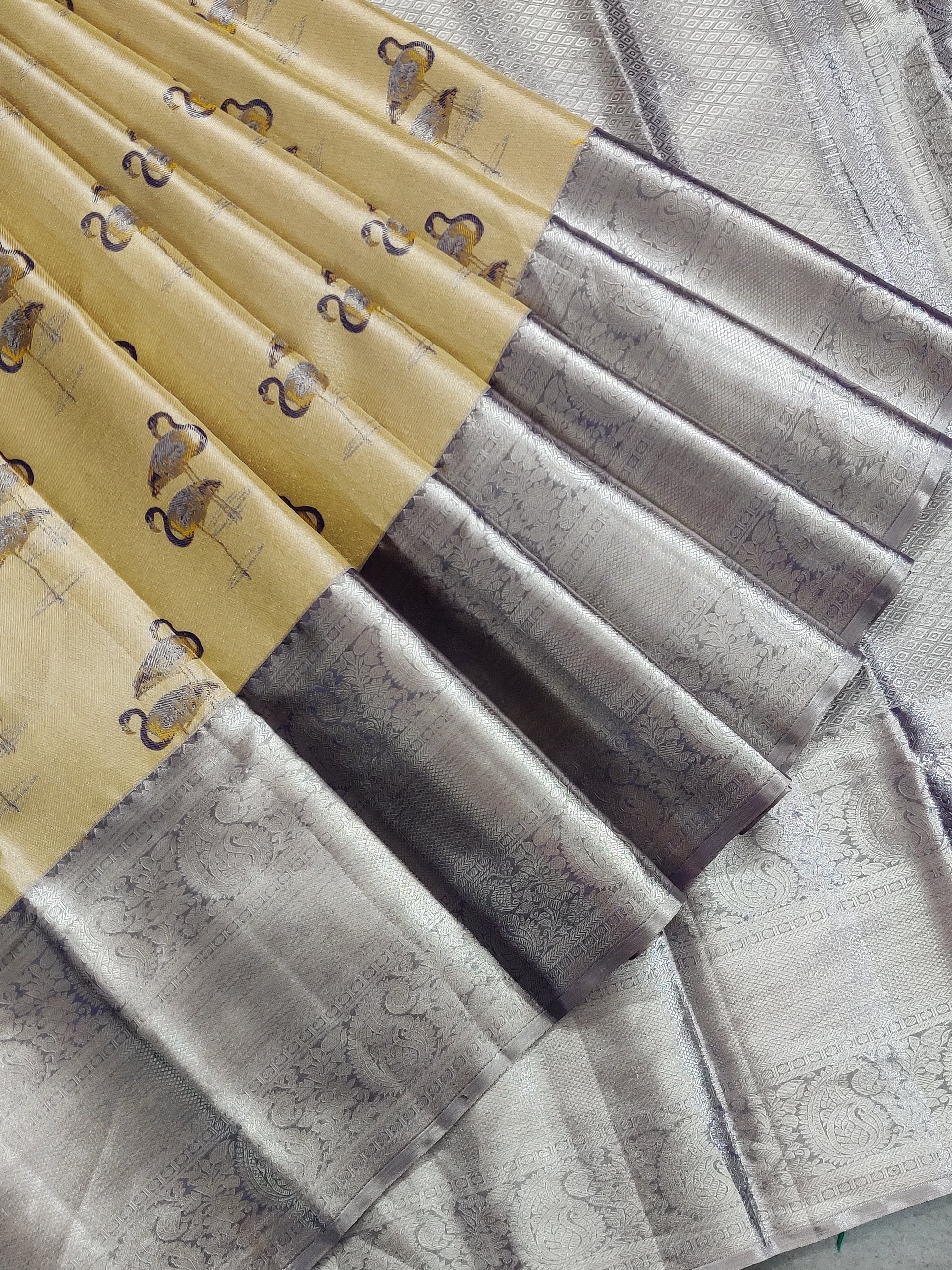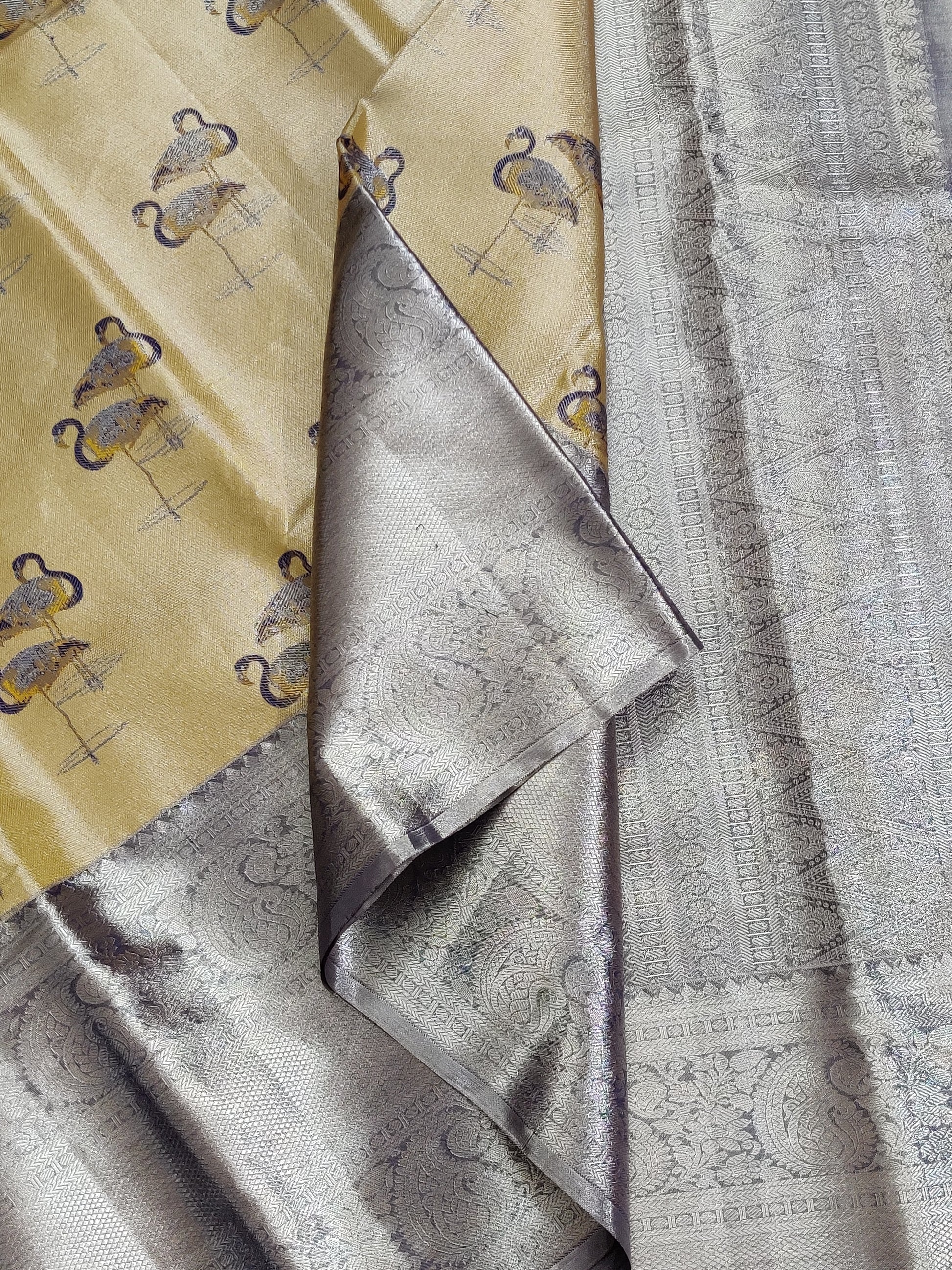 Gold Colour Tissue PL Kanchivaram Silk Saree With Thread Woven Swan Motif All Over Code : KA0284