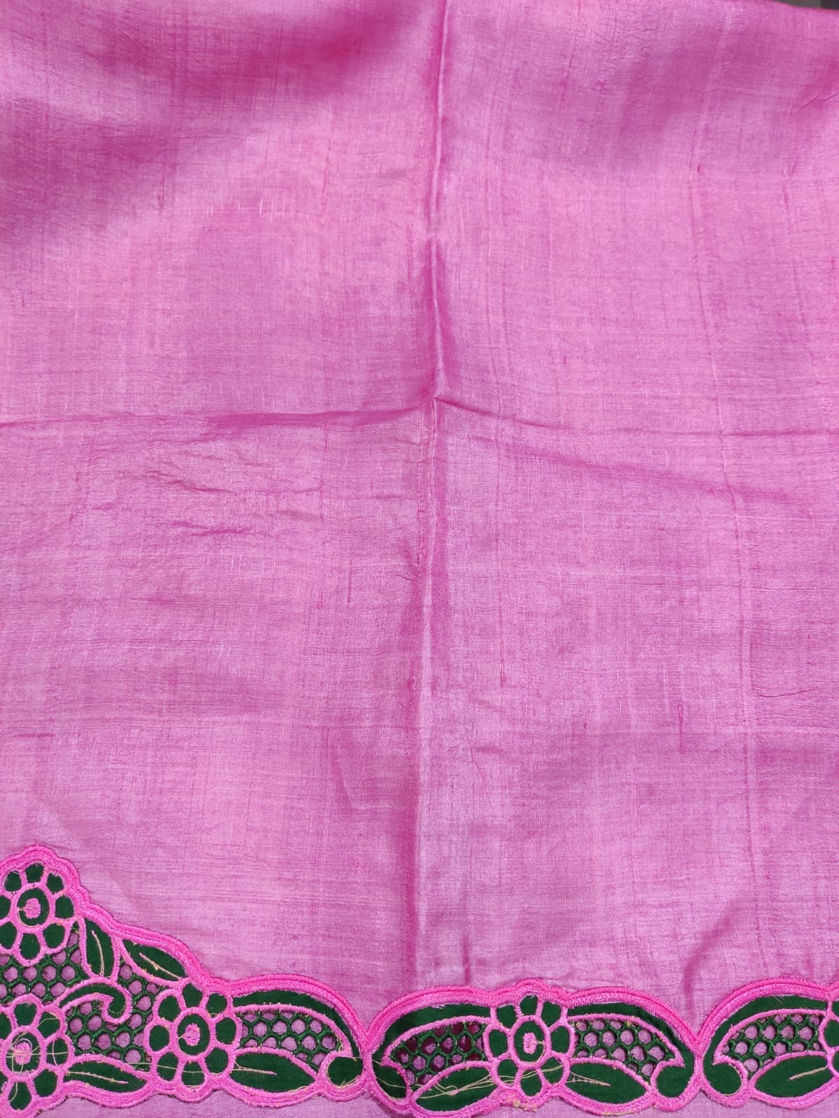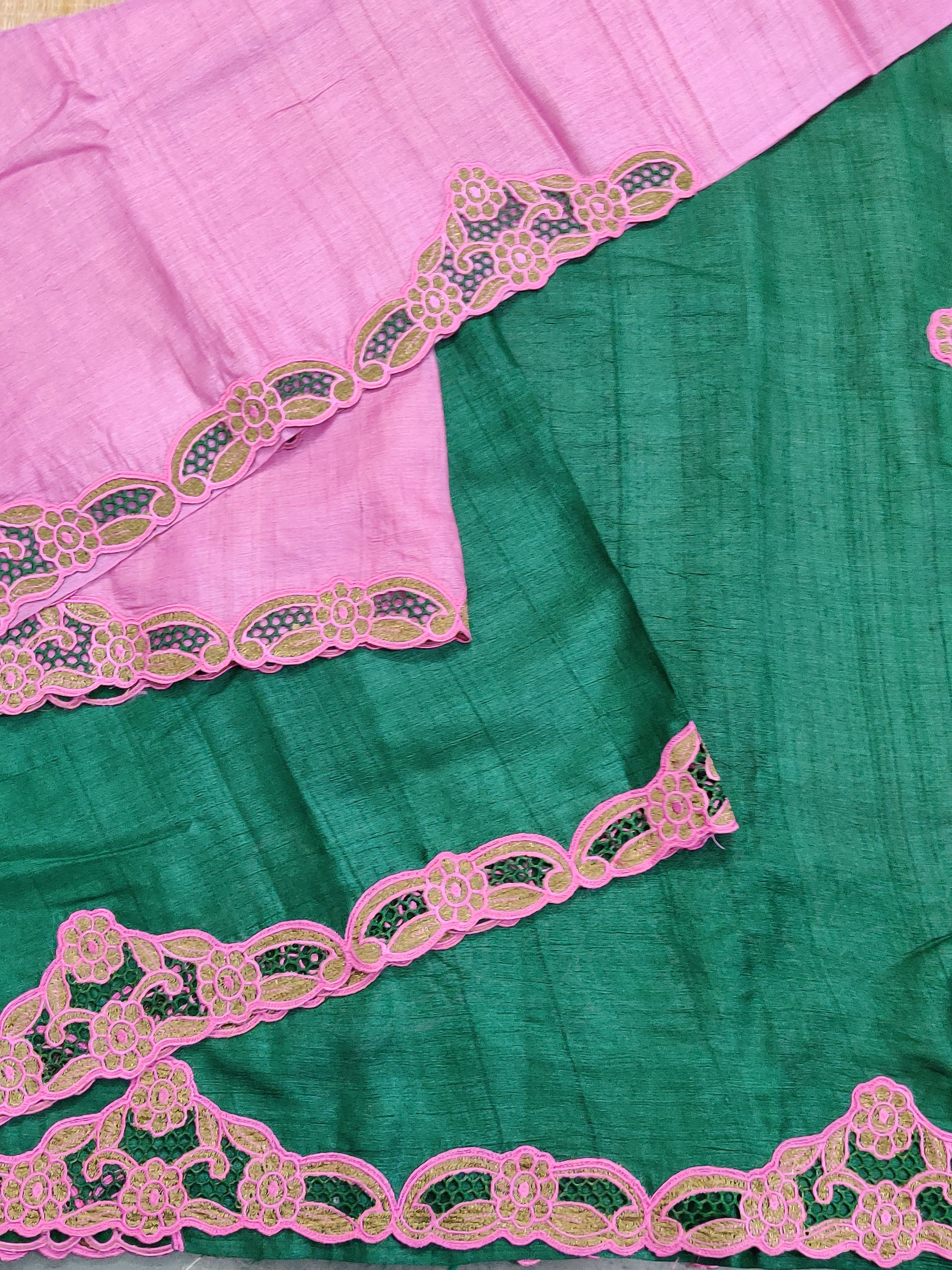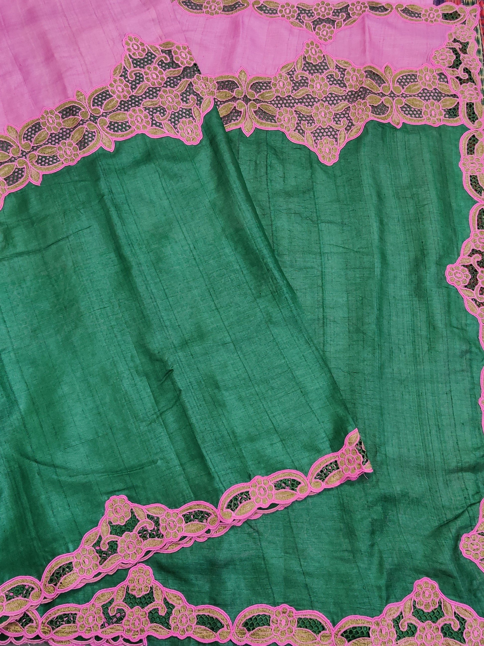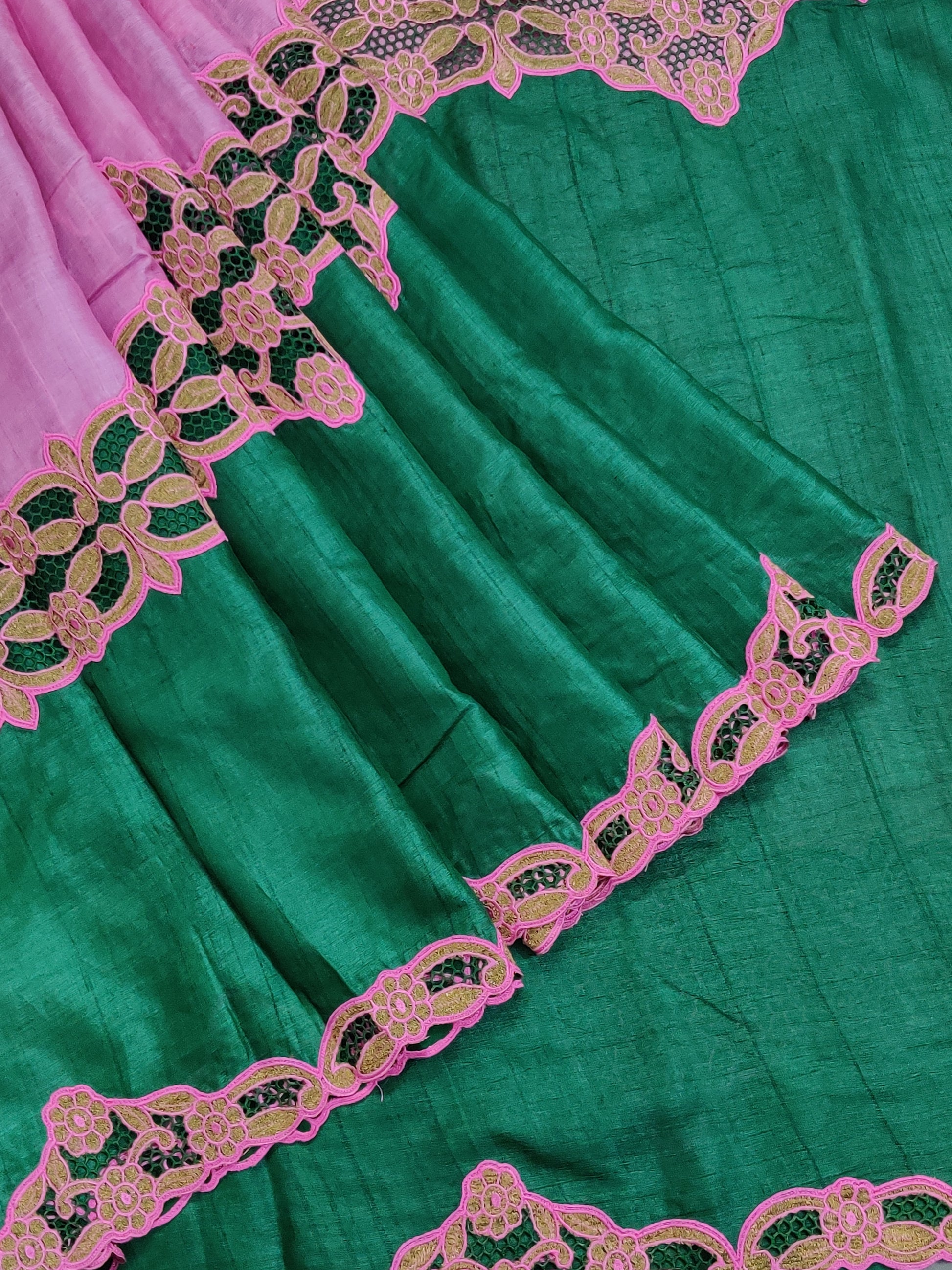 Green & Pink Colour Tussar Silk Saree With Cut Work Body Code : VB0306