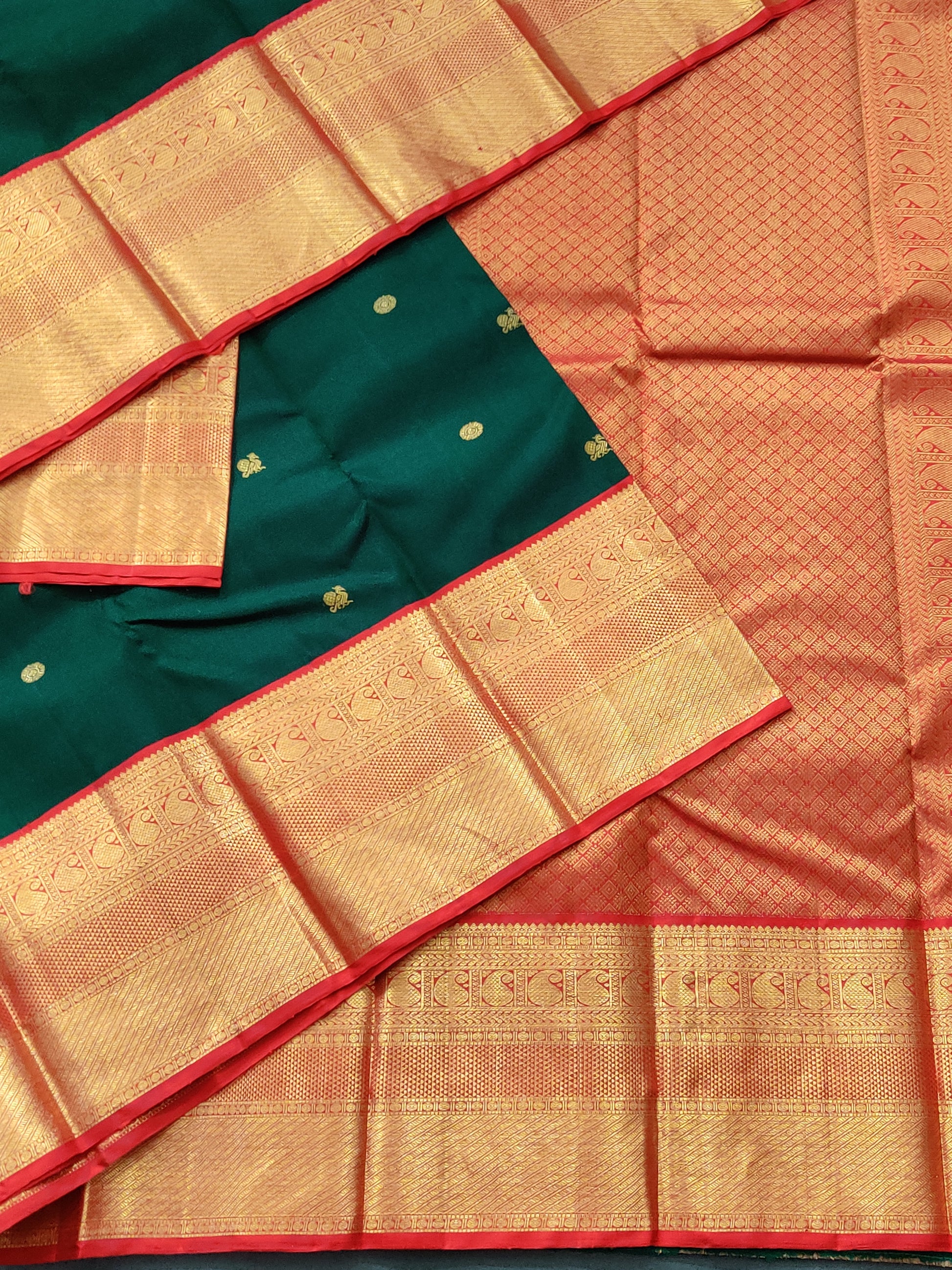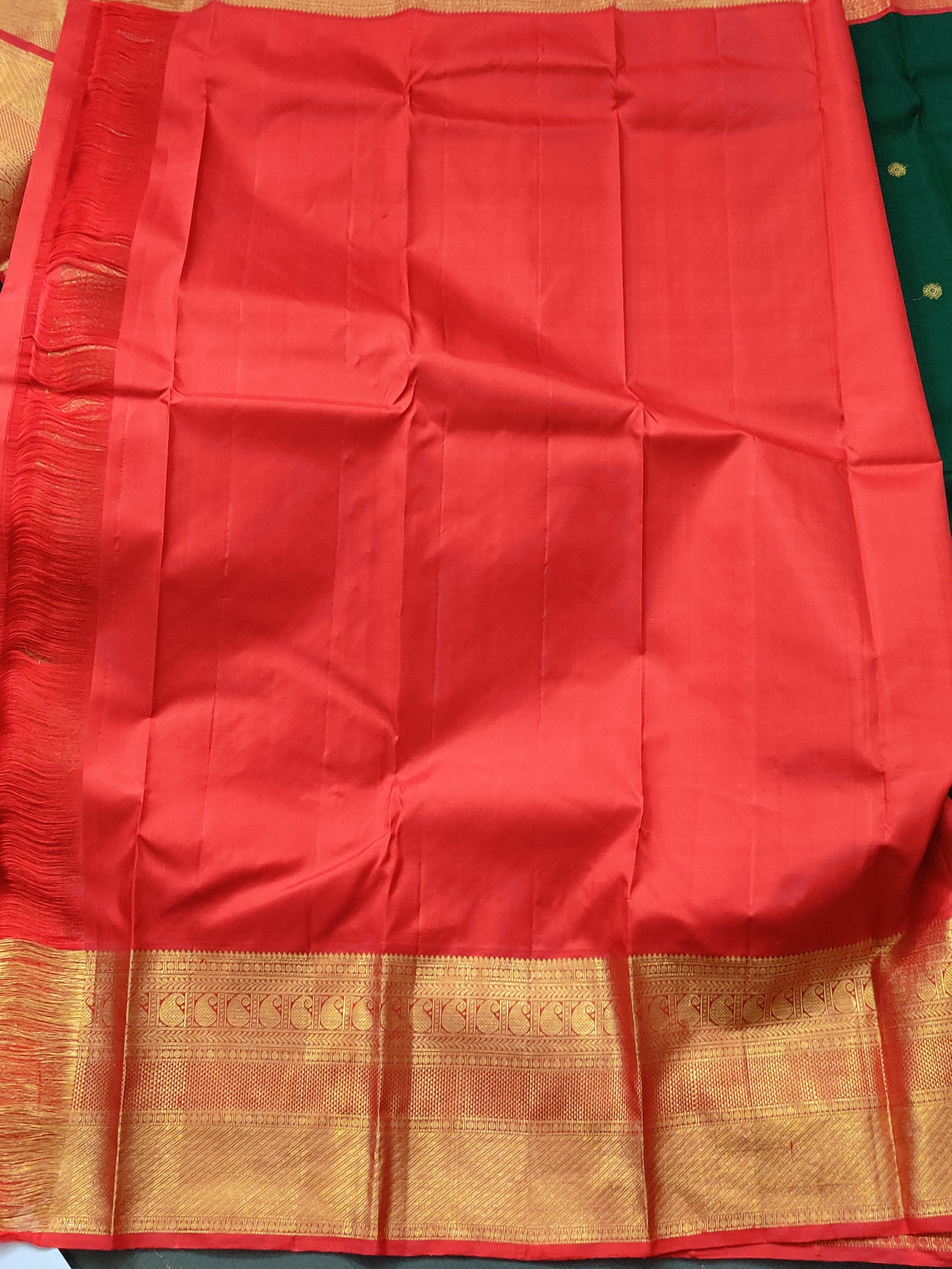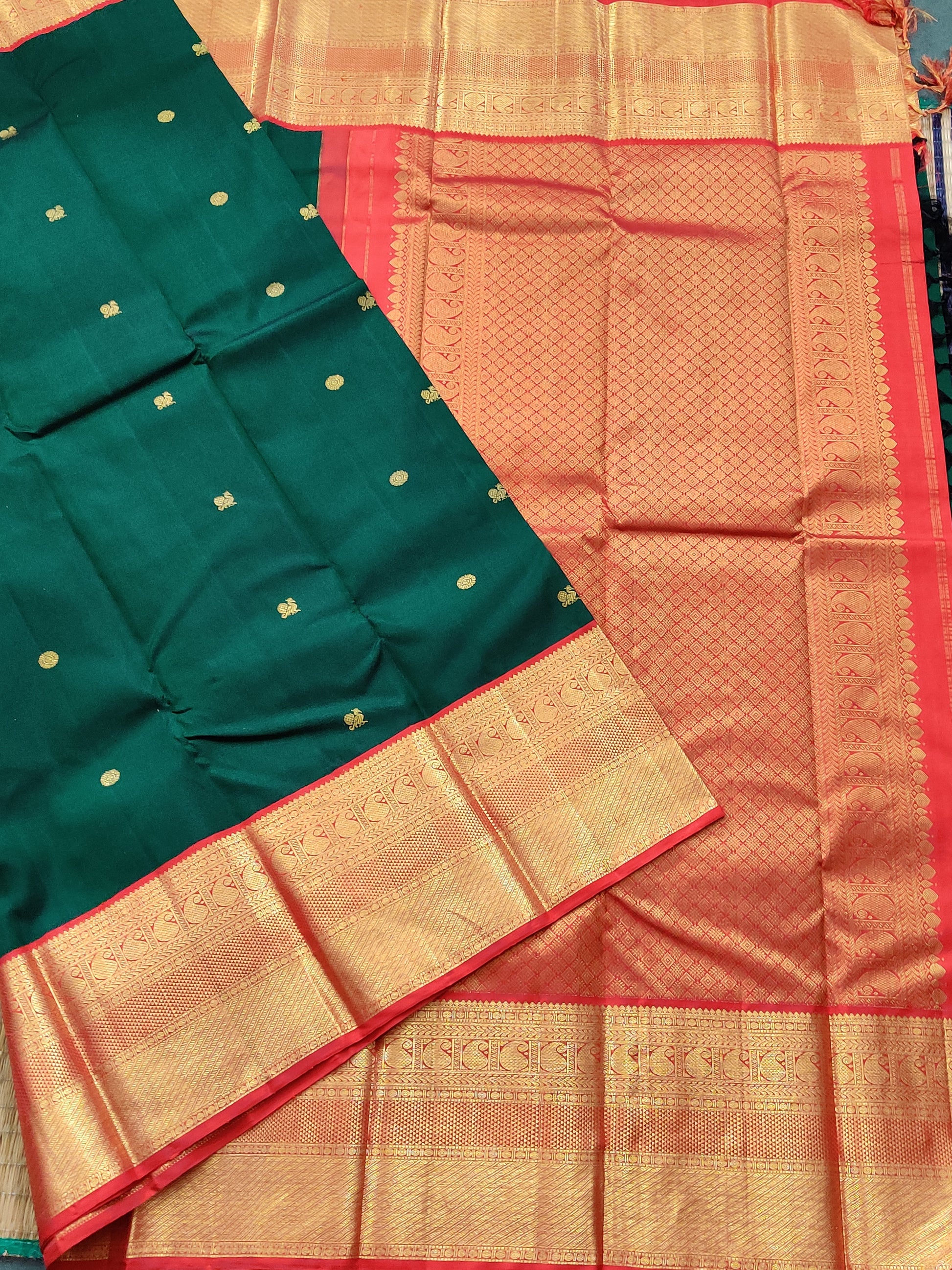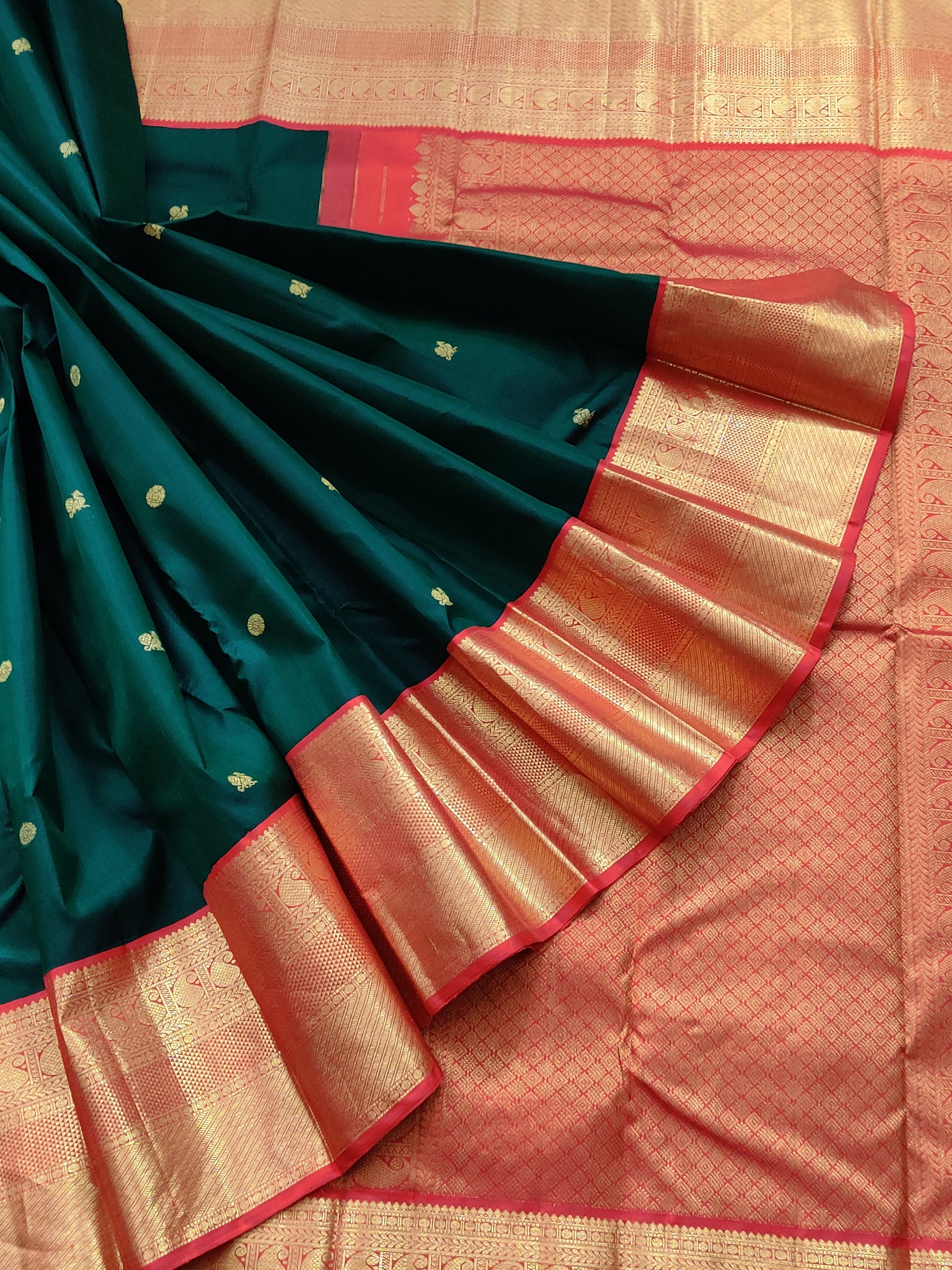 Indulge in the timeless elegance of our Kanchivaram Silk saree. Adorned with intricate zari butta detailing in a rich green hue, it features a contrasting orange zari border and luxurious pallu. Elevate any occasion with this traditional piece that exudes class and sophistication.