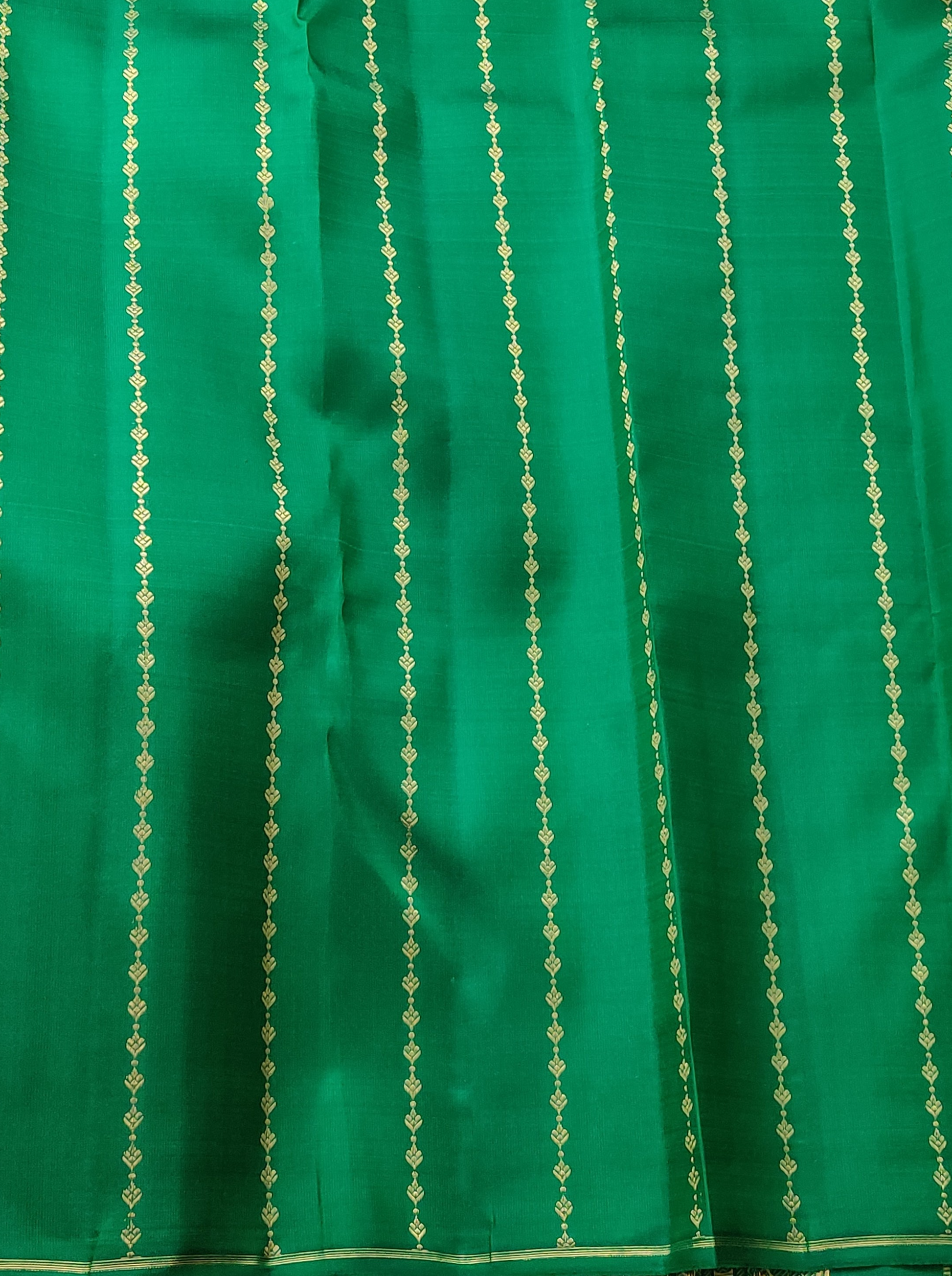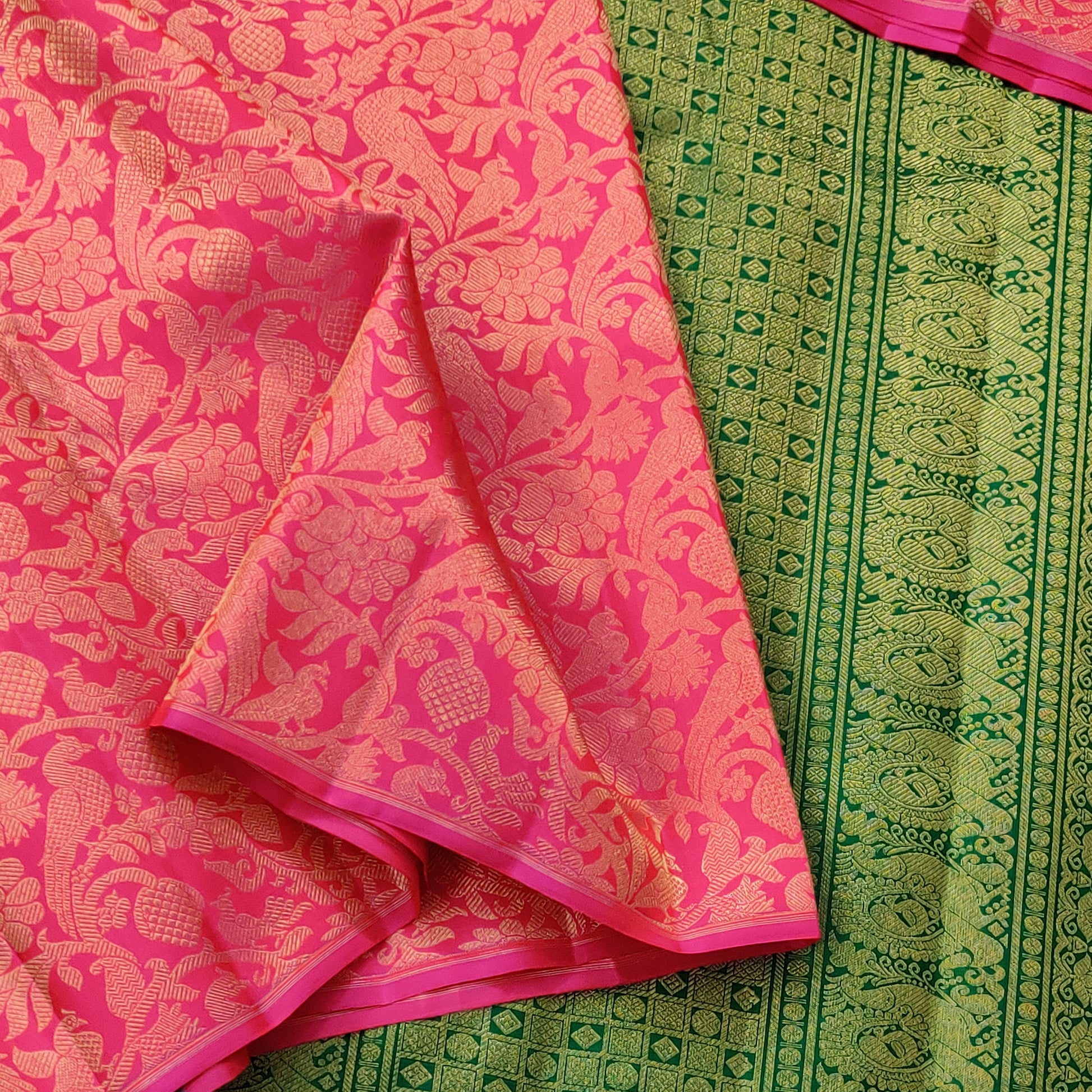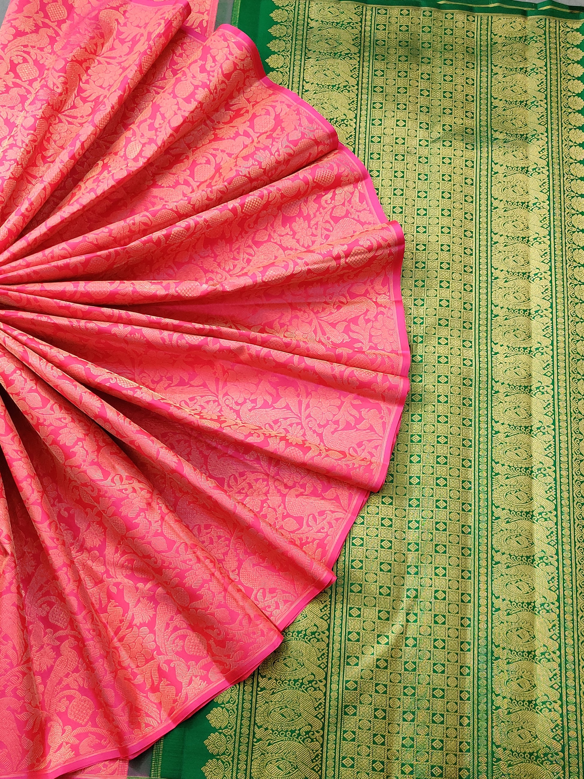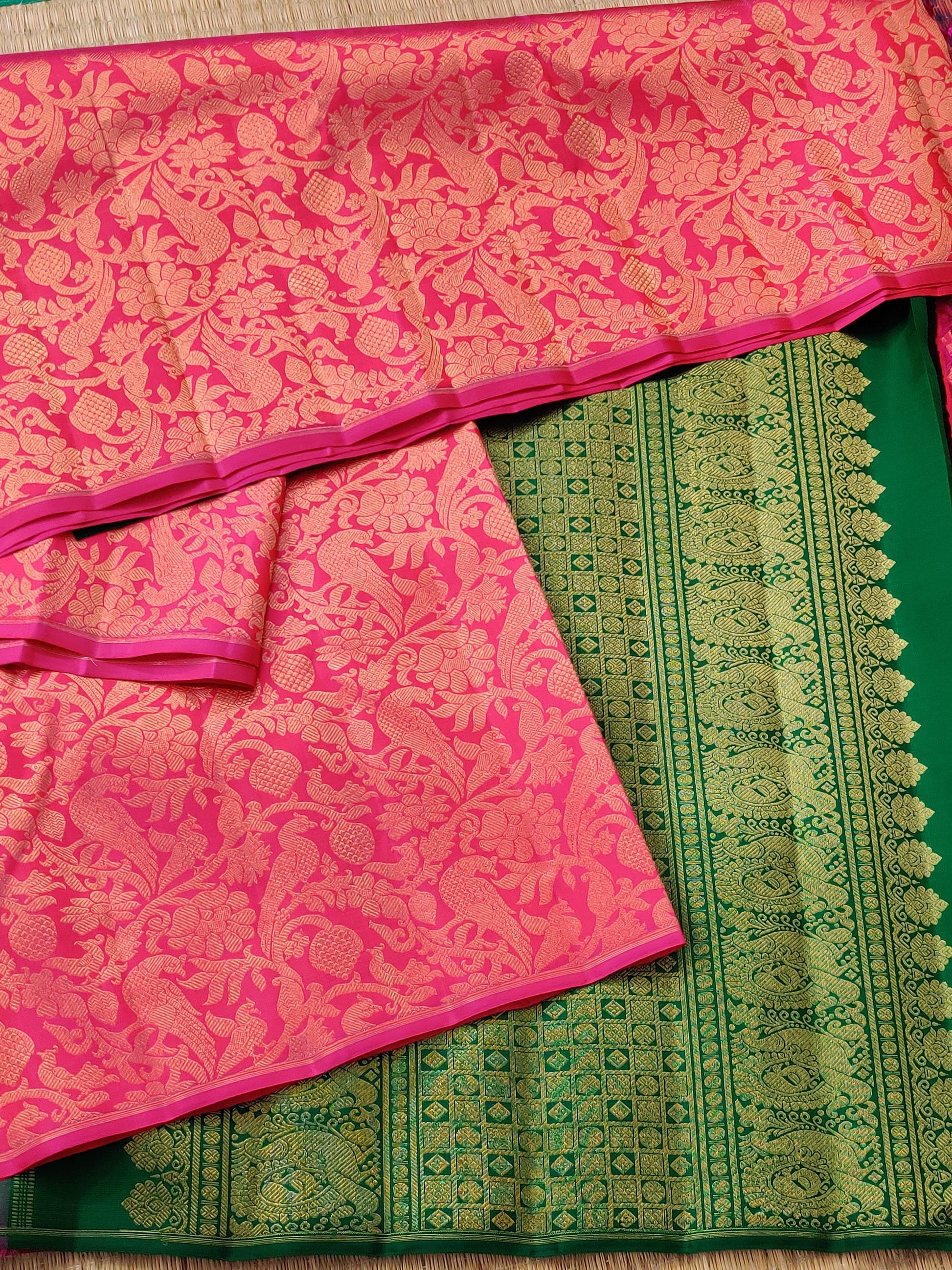This pink pure silk kanchivaram saree features the stunning vanasingaram concept all over, accented by a contrasting green zari pallu. The complementing green zari butta blouse completes the look. Elevate your style with this elegant and sophisticated saree.