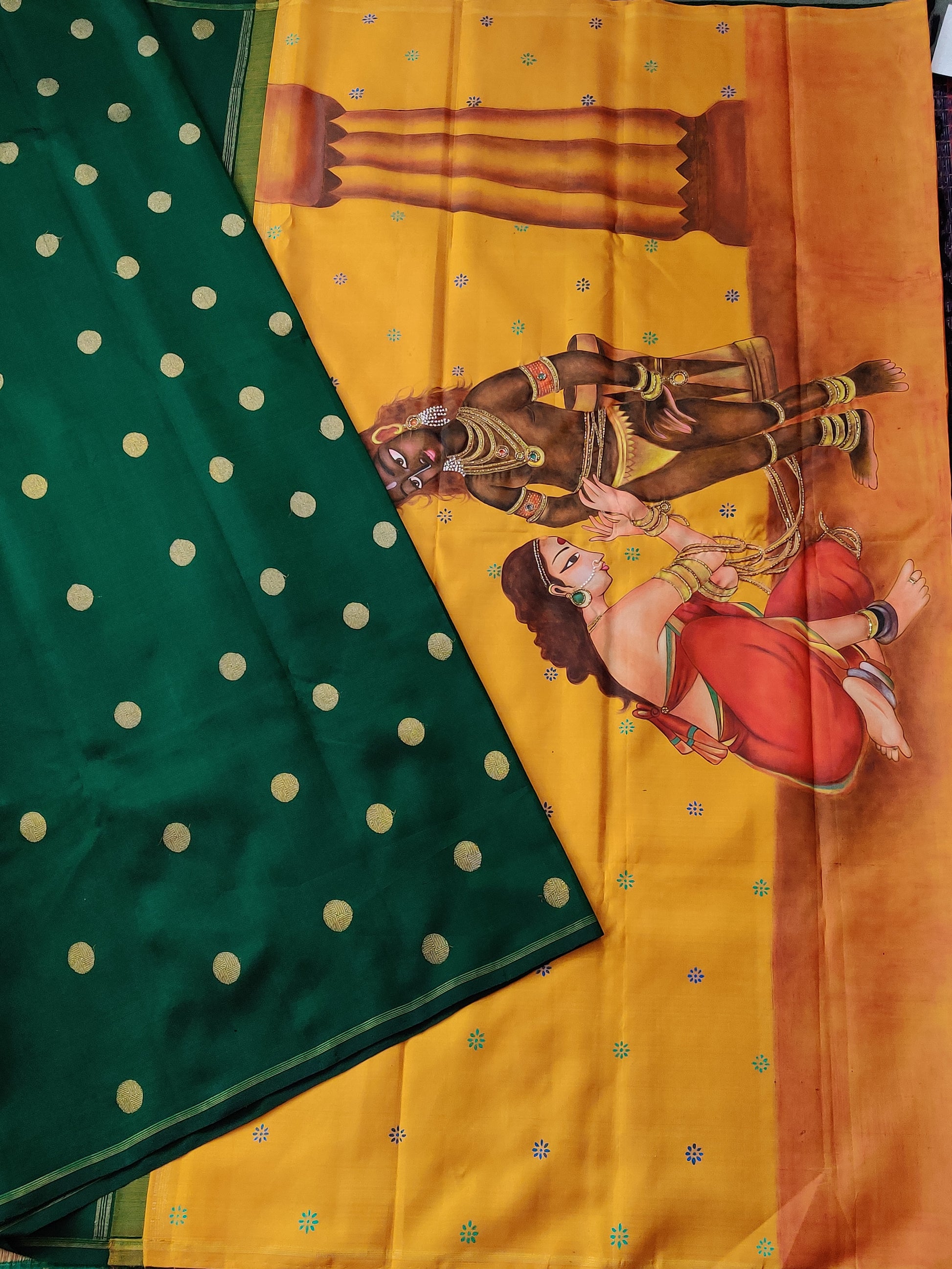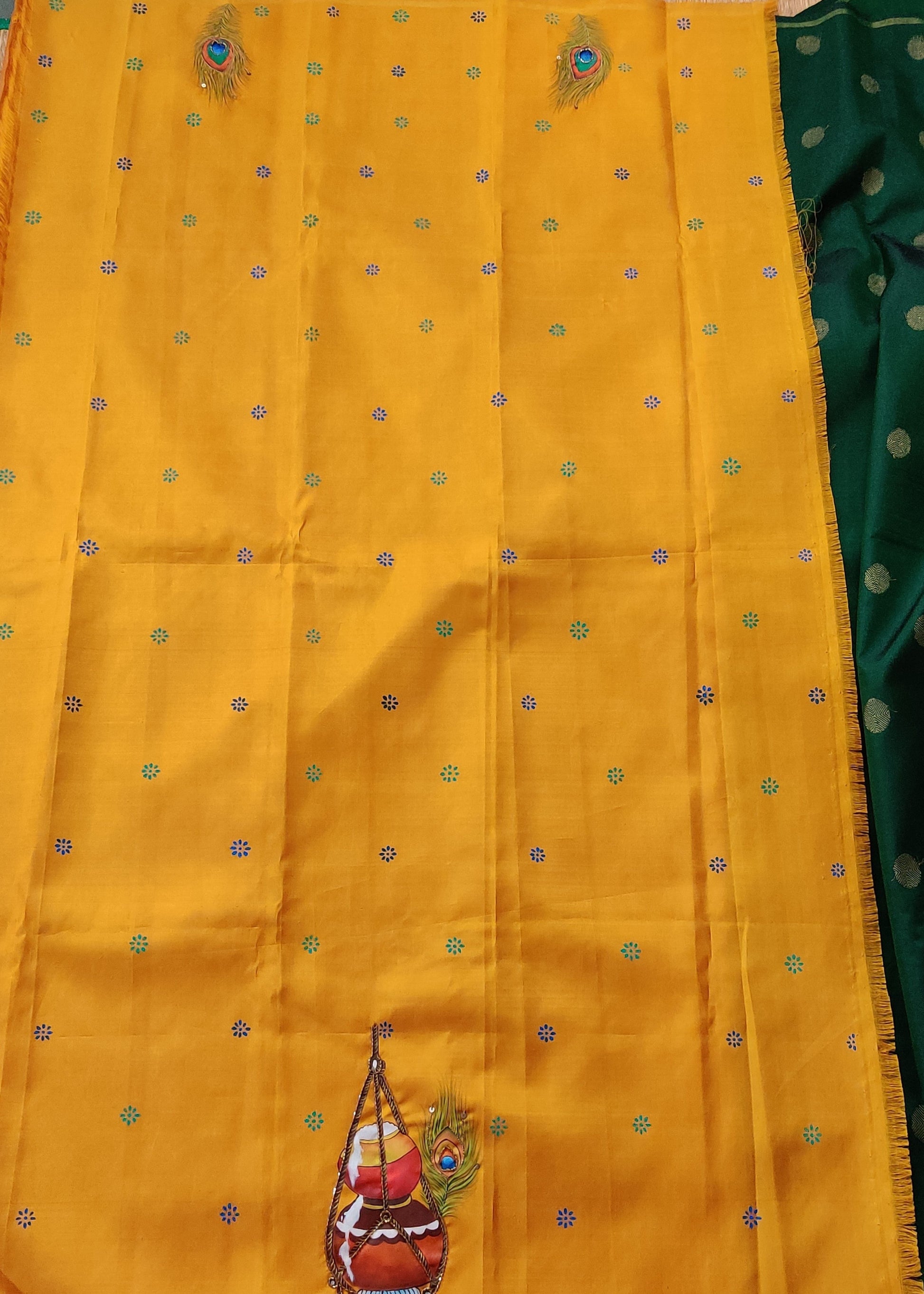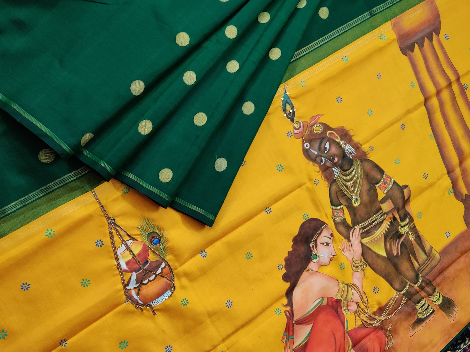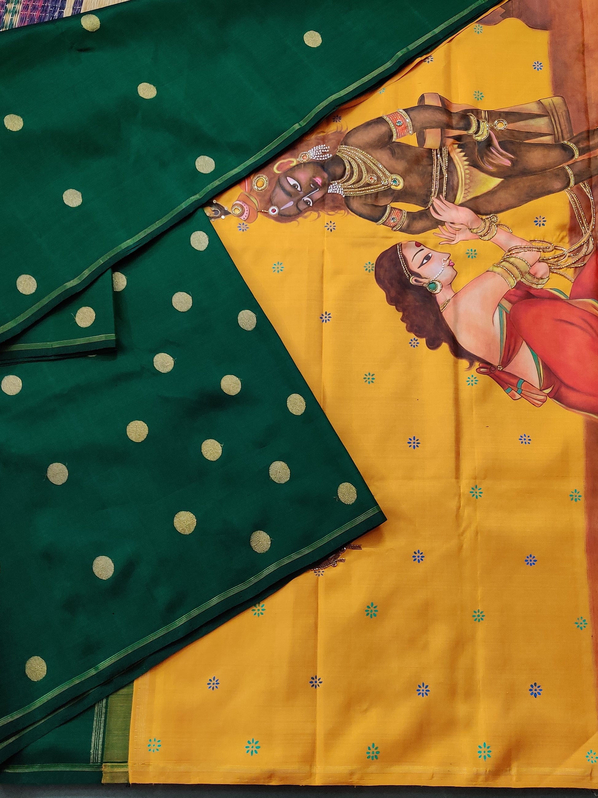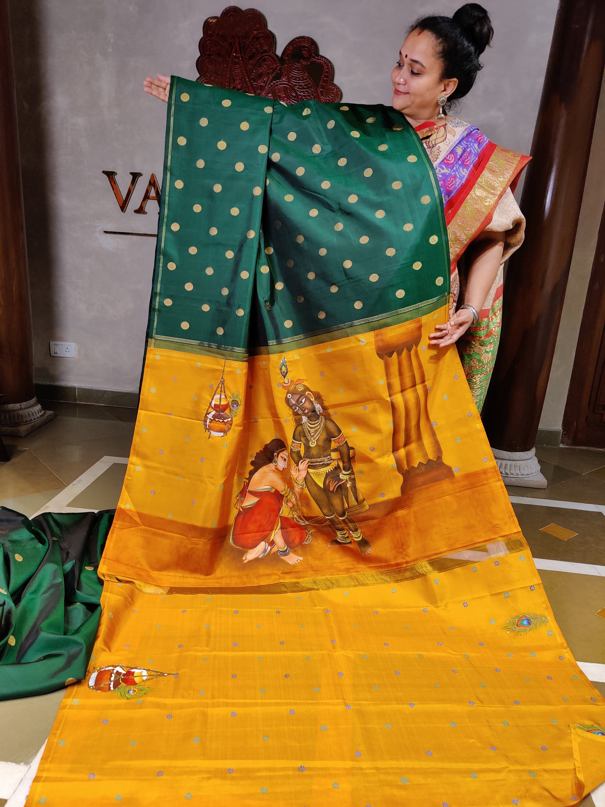 Indulge in pure luxury with our expertly crafted green saree, made from pure zari kanchivaram silk. Its intricate zari butta design is complemented by elegant hand painting and hand kundhan work on the pallu. Complete the look with the hand-painted butta blouse for a one-of-a-kind ensemble.