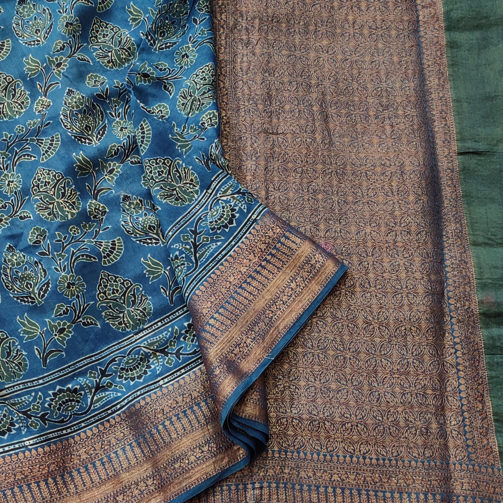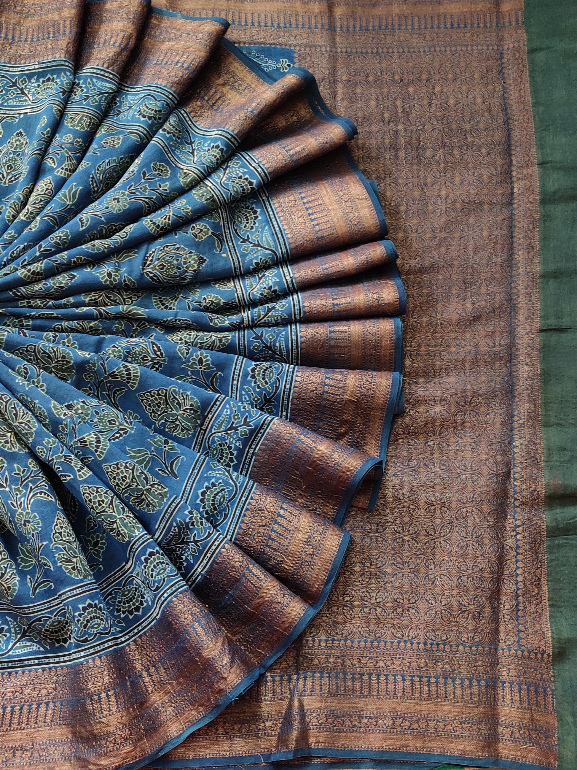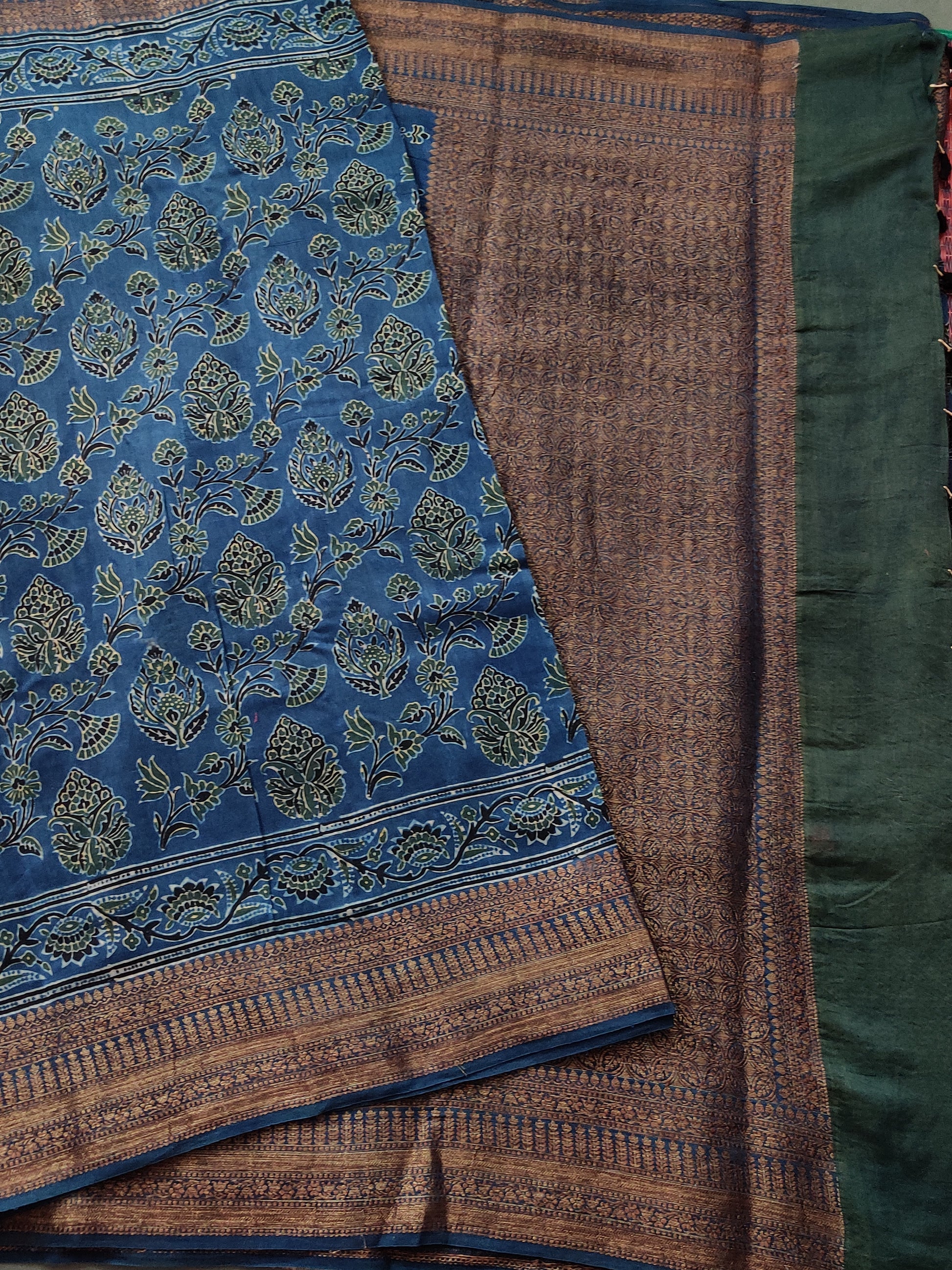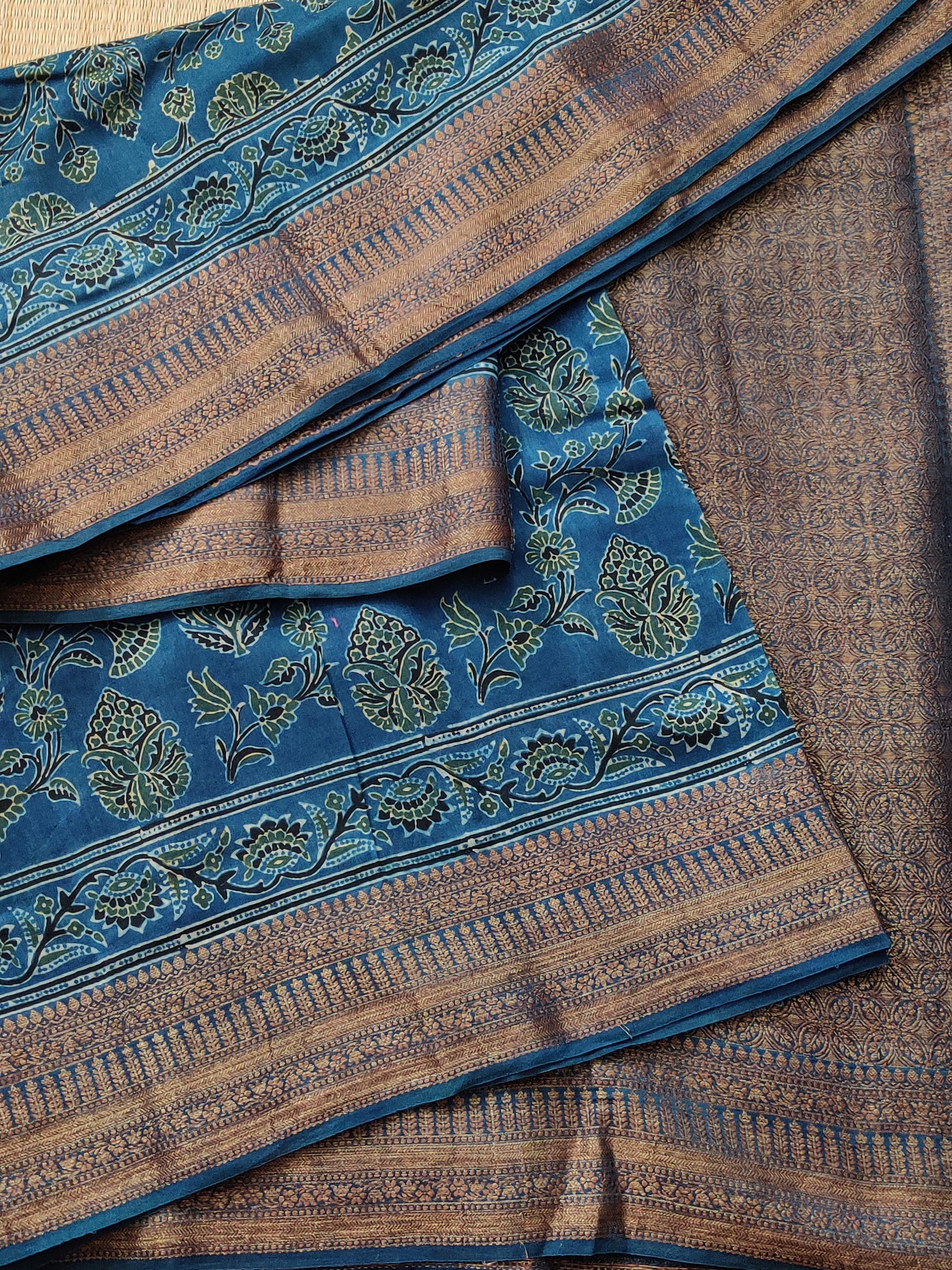 Experience traditional Indian fashion with our Blue Cotton Saree. This saree features a beautiful ajrakh print all-over for a unique and eye-catching look. The banarasi zari border adds a touch of luxury while the brocade banarasi blouse completes the ensemble. Elevate your style with this must-have saree.