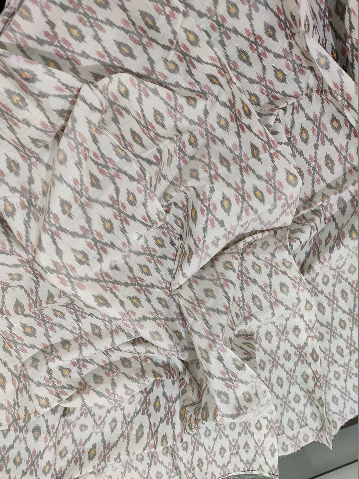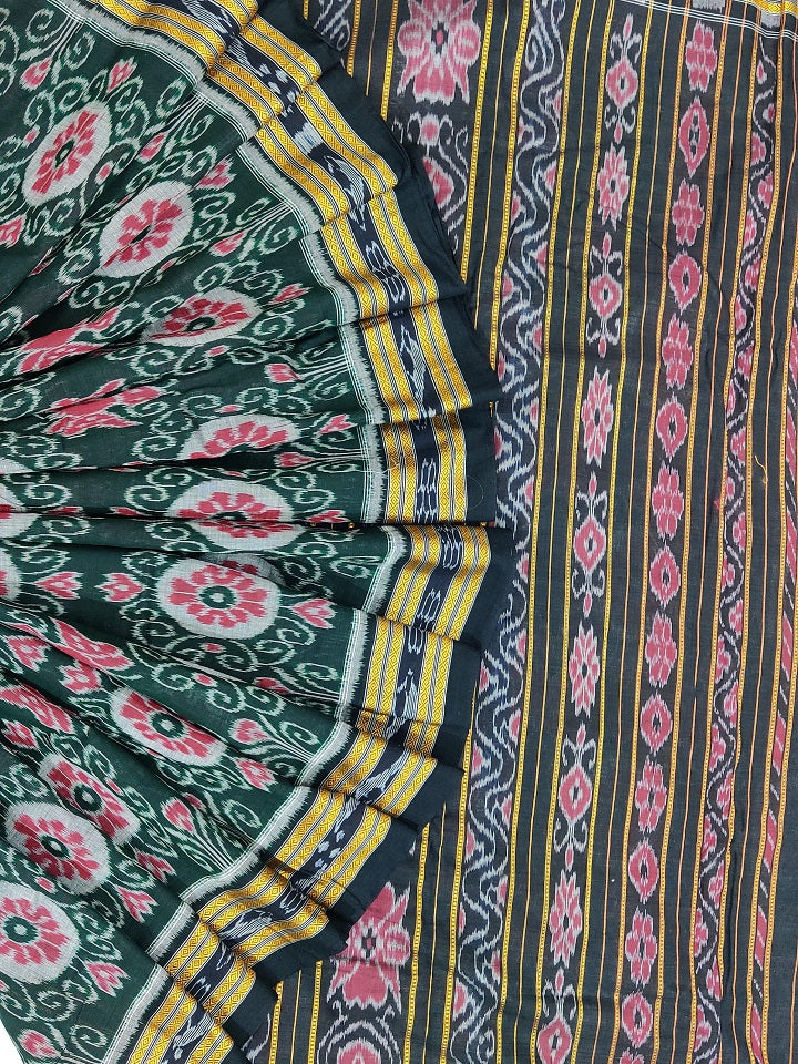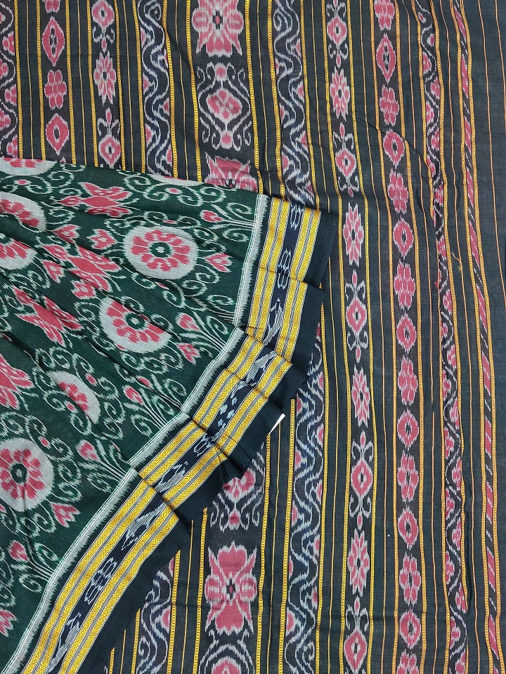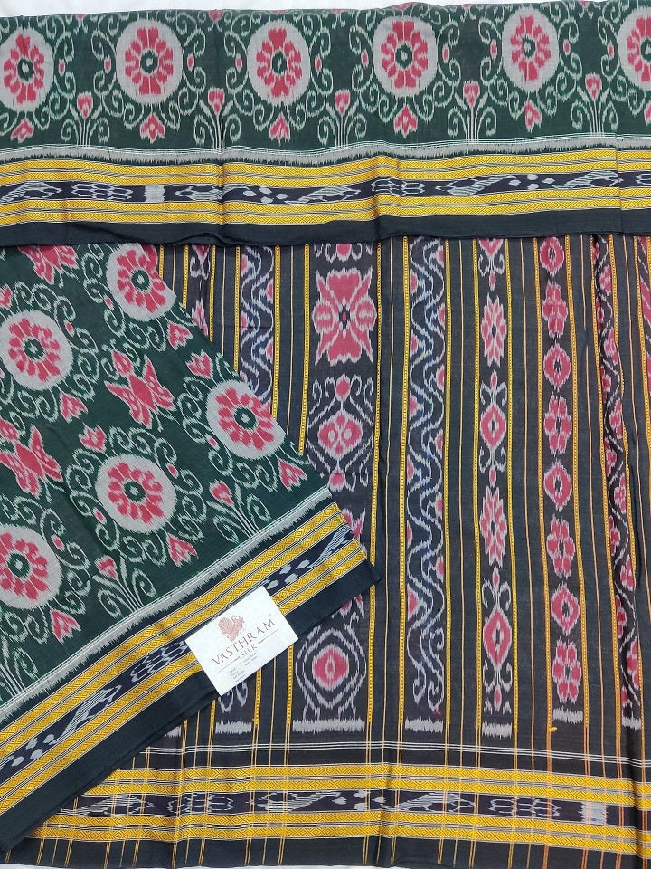 This black cotton silk saree features an elegant ikkat thread woven motif all over, adding a touch of traditional charm to any outfit. The self border and pallu enhance the overall look, while the contrasting ikkat white colour blouse completes the ensemble. Elevate your style with this exquisite saree.