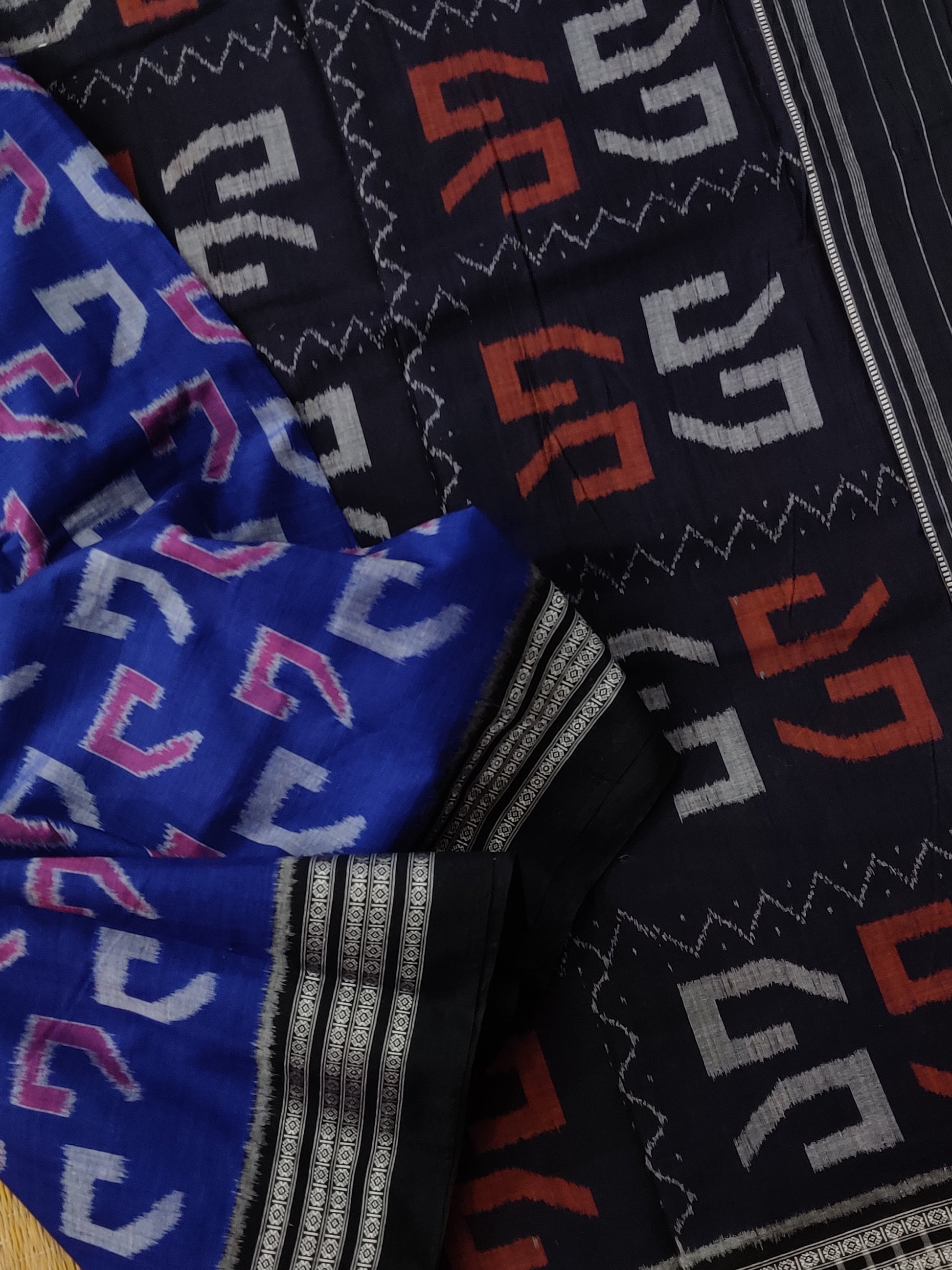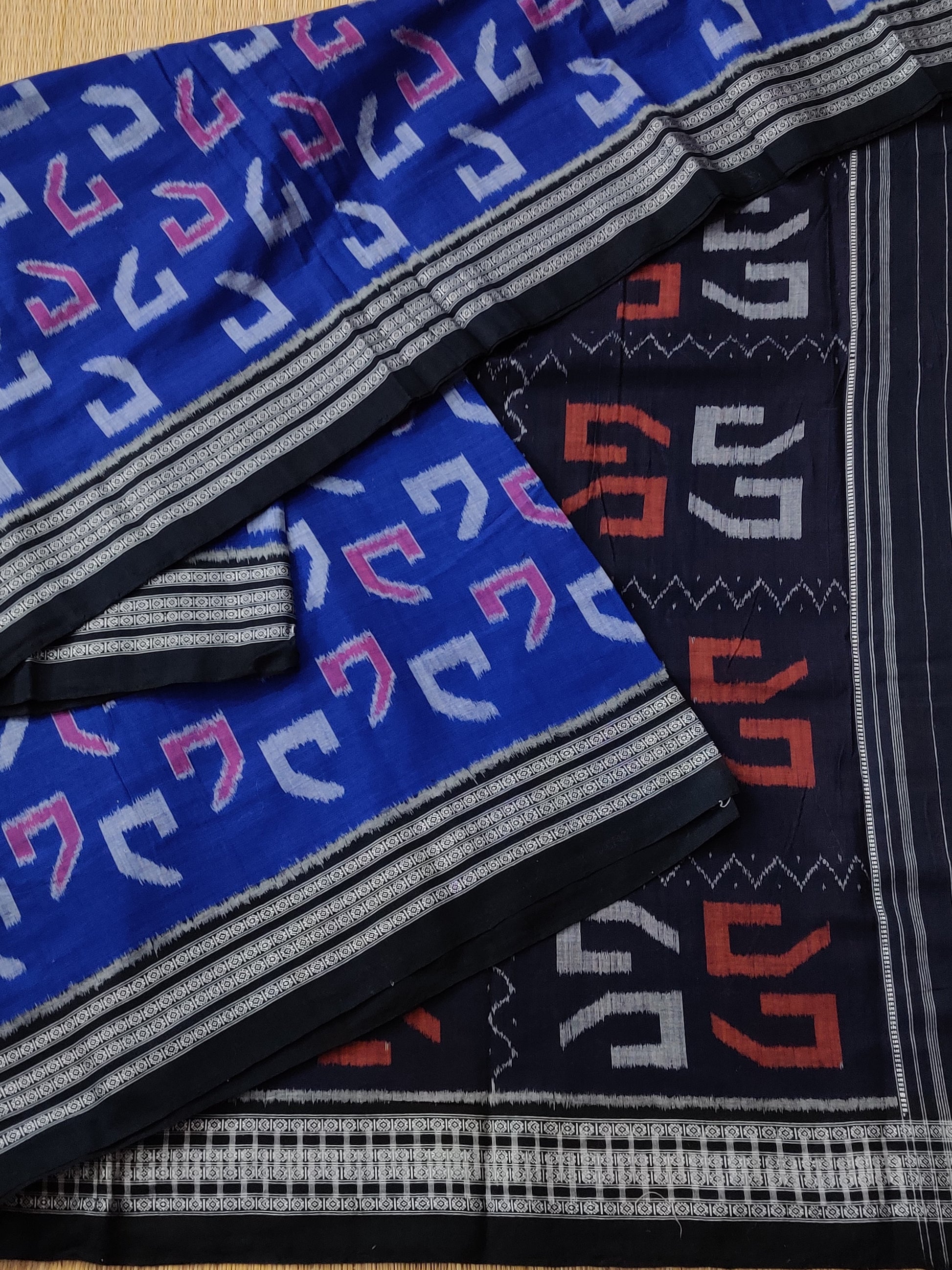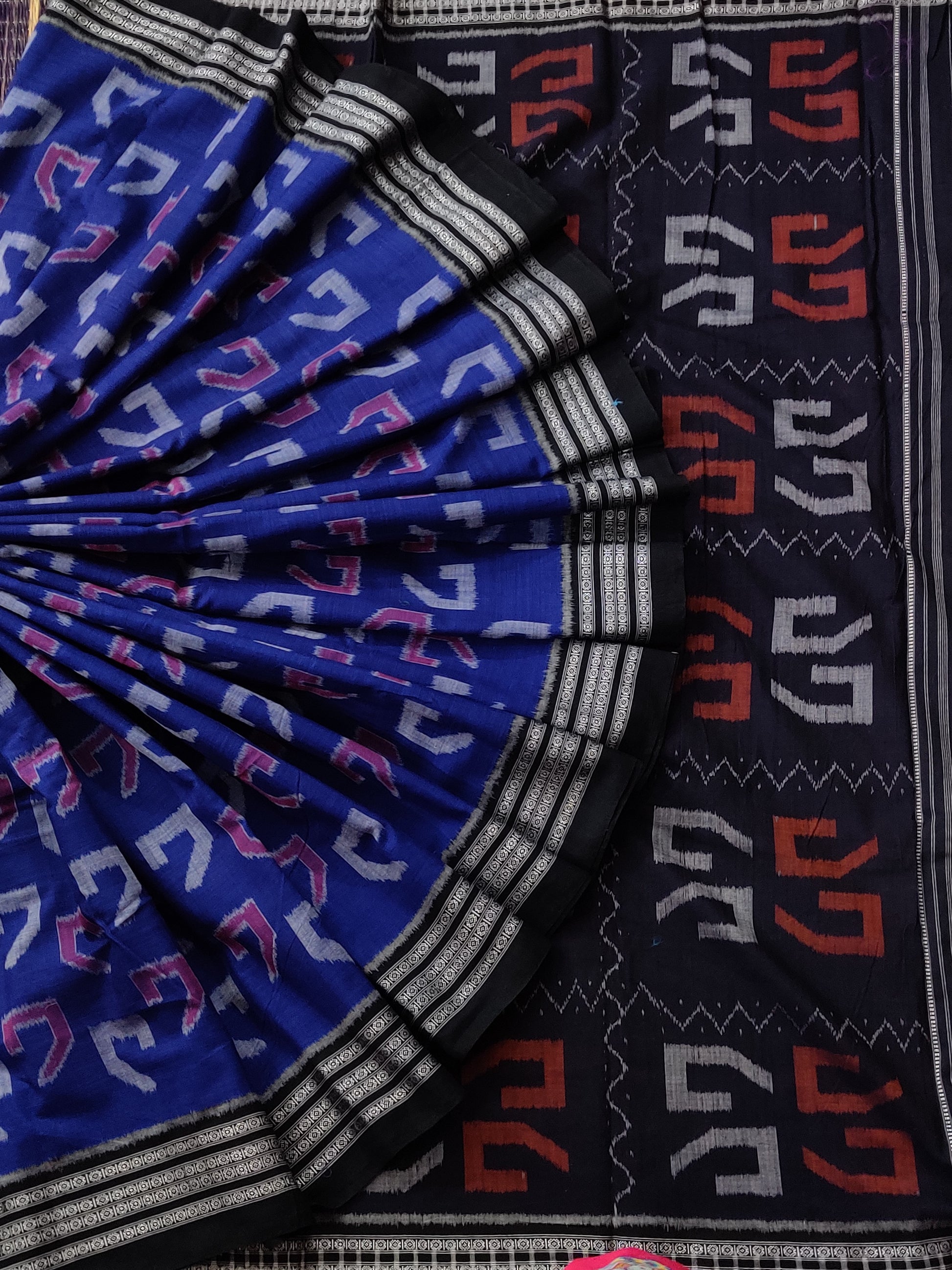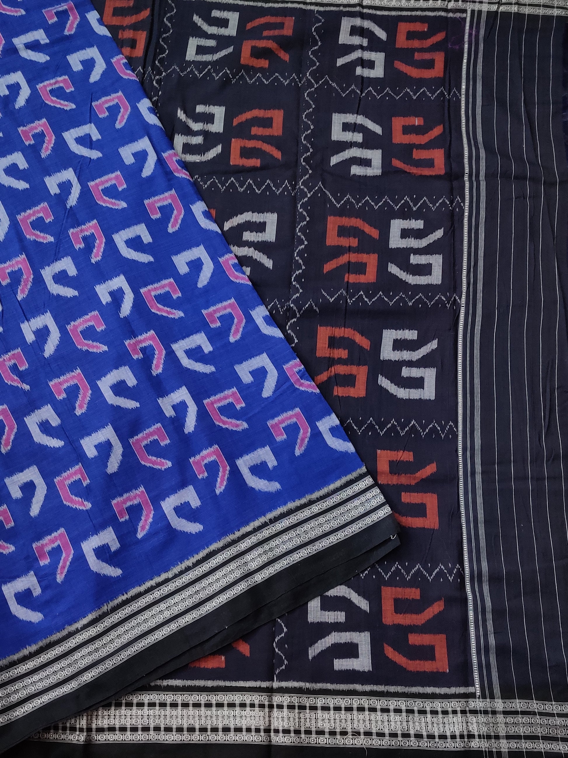 Expertly crafted from soft cotton, this stunning blue saree features beautiful thread woven motifs throughout. The bold black thread woven border and pallu provide a striking contrast. Perfect for any occasion, this saree effortlessly combines comfort and style.