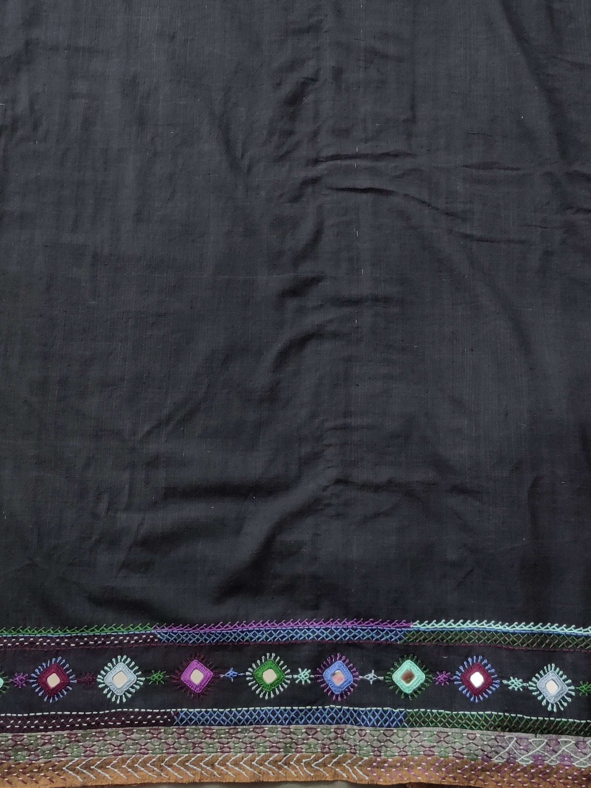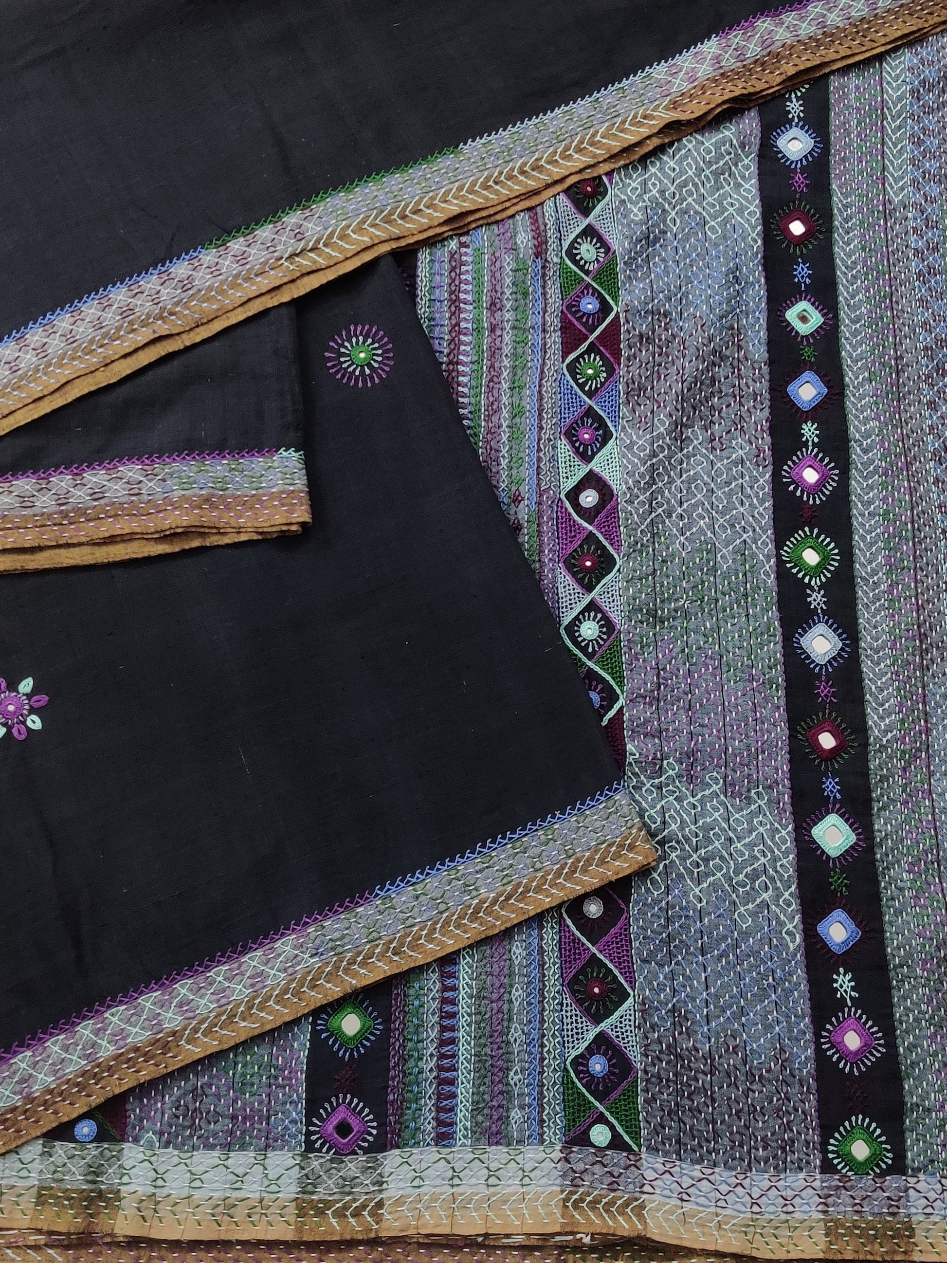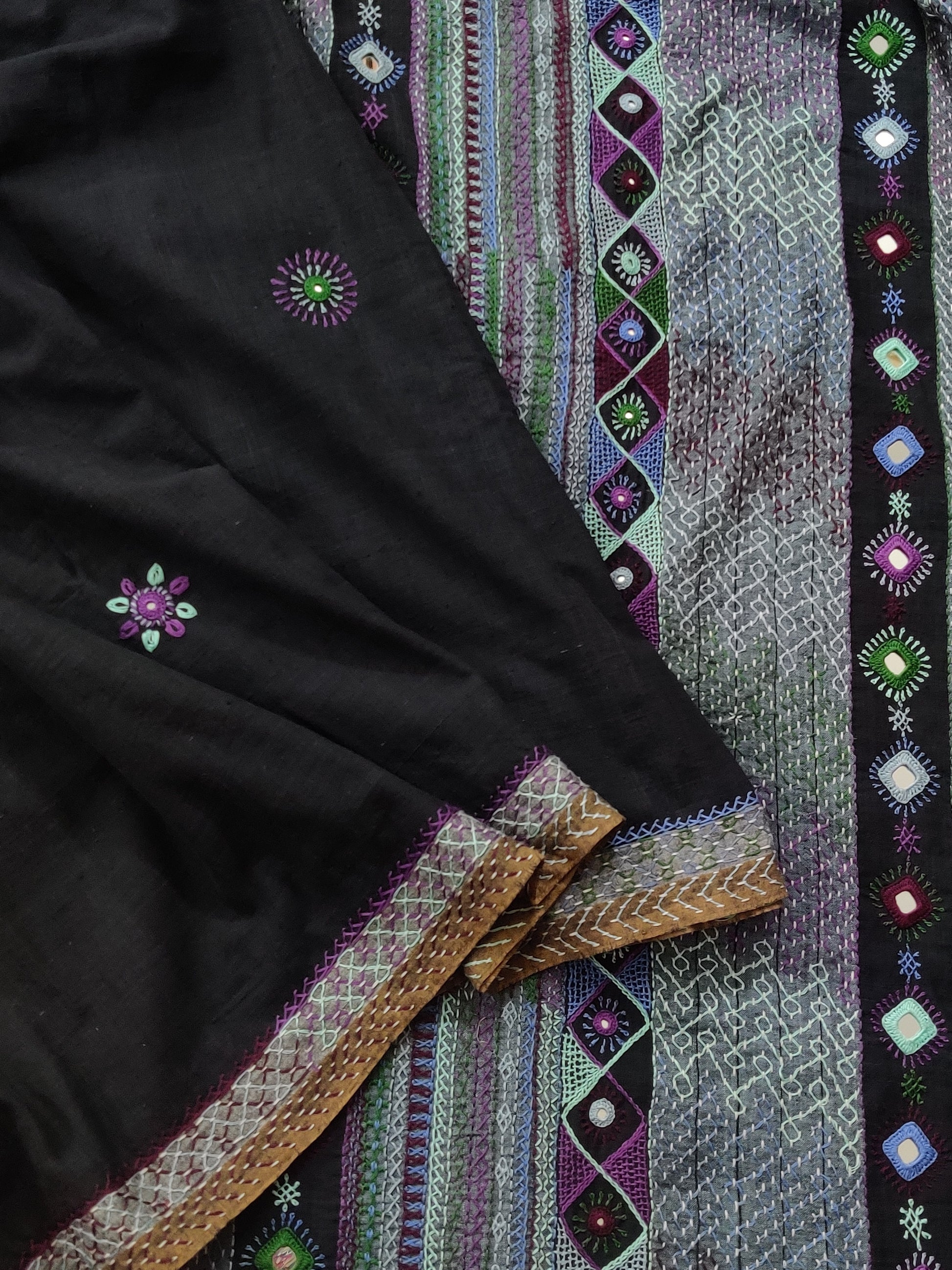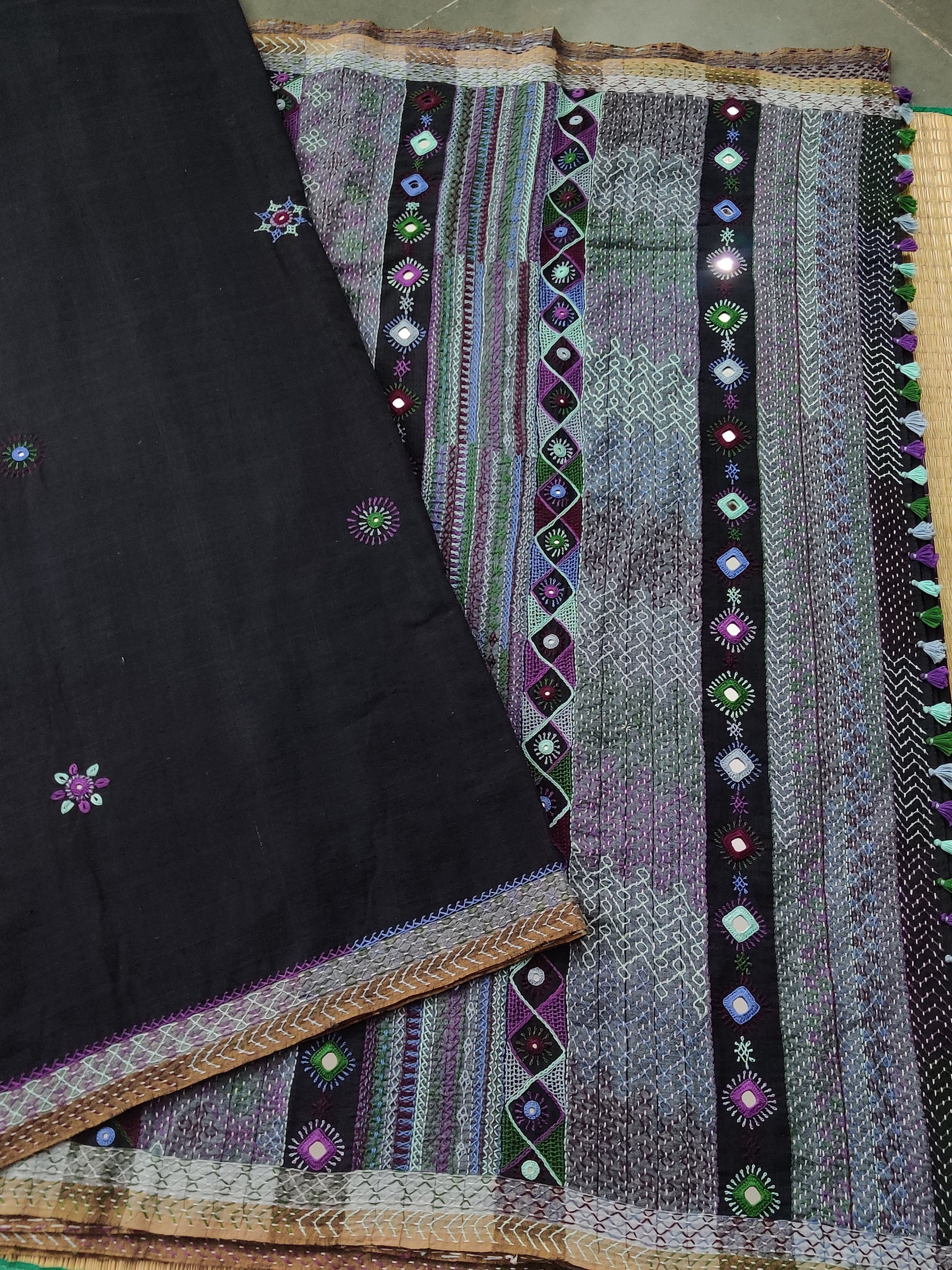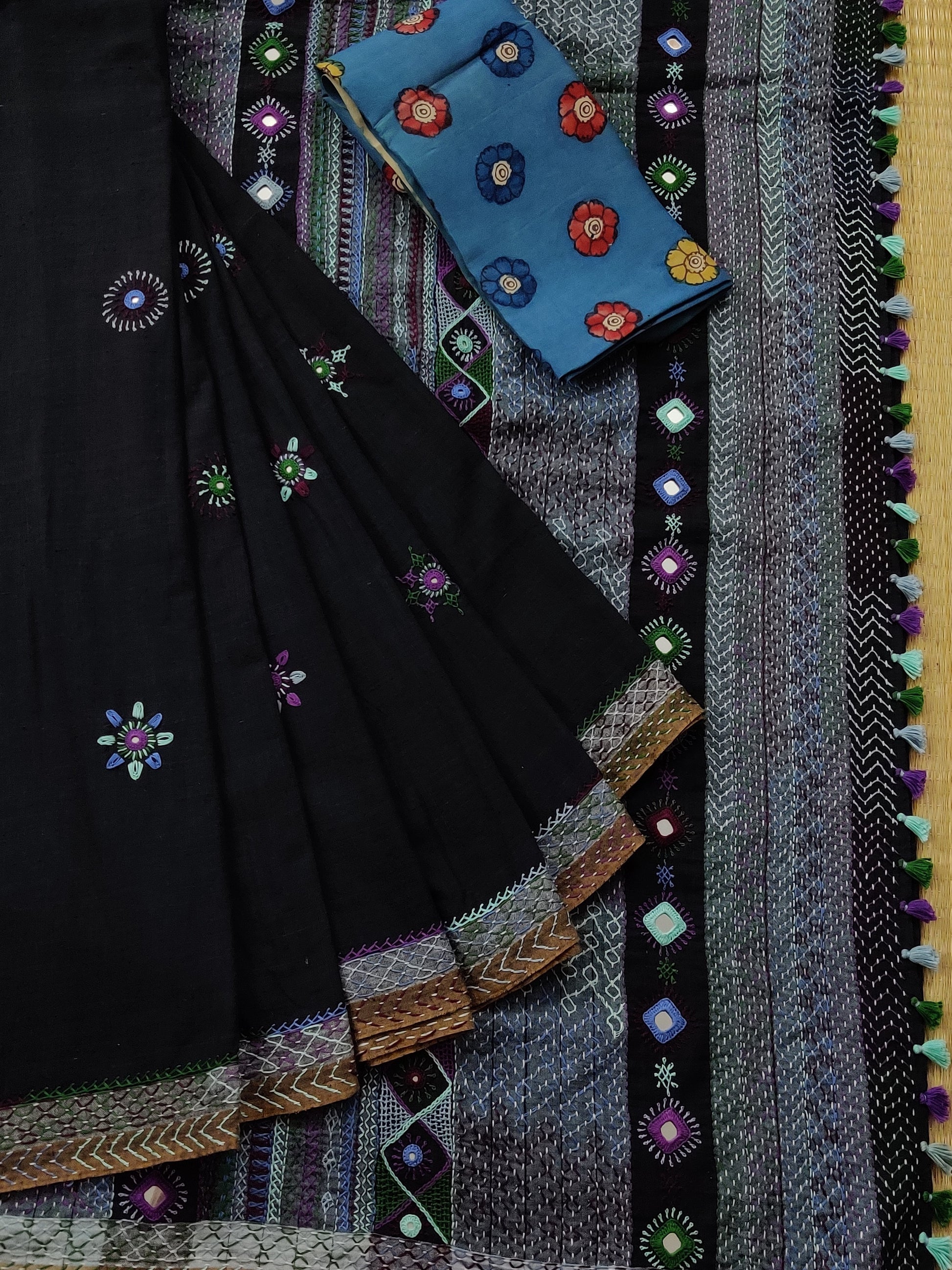 Made from luxurious Khadi cotton, this black saree features intricate Lambani embroidery all over, along with a stunning Kantha work border and pallu. Complete with a self-coloured blouse, this saree exudes elegance and timeless beauty. Upgrade to a contrasting Kalamkari blouse for an additional cost. Invest in this unique and expertly crafted saree today.