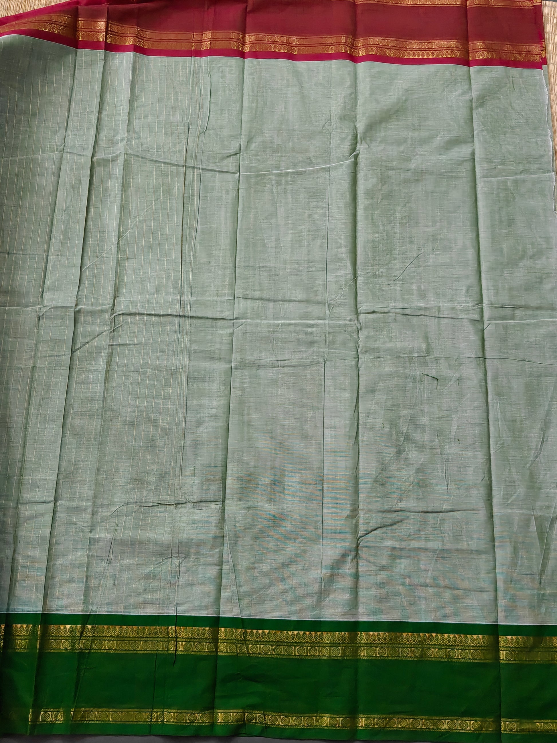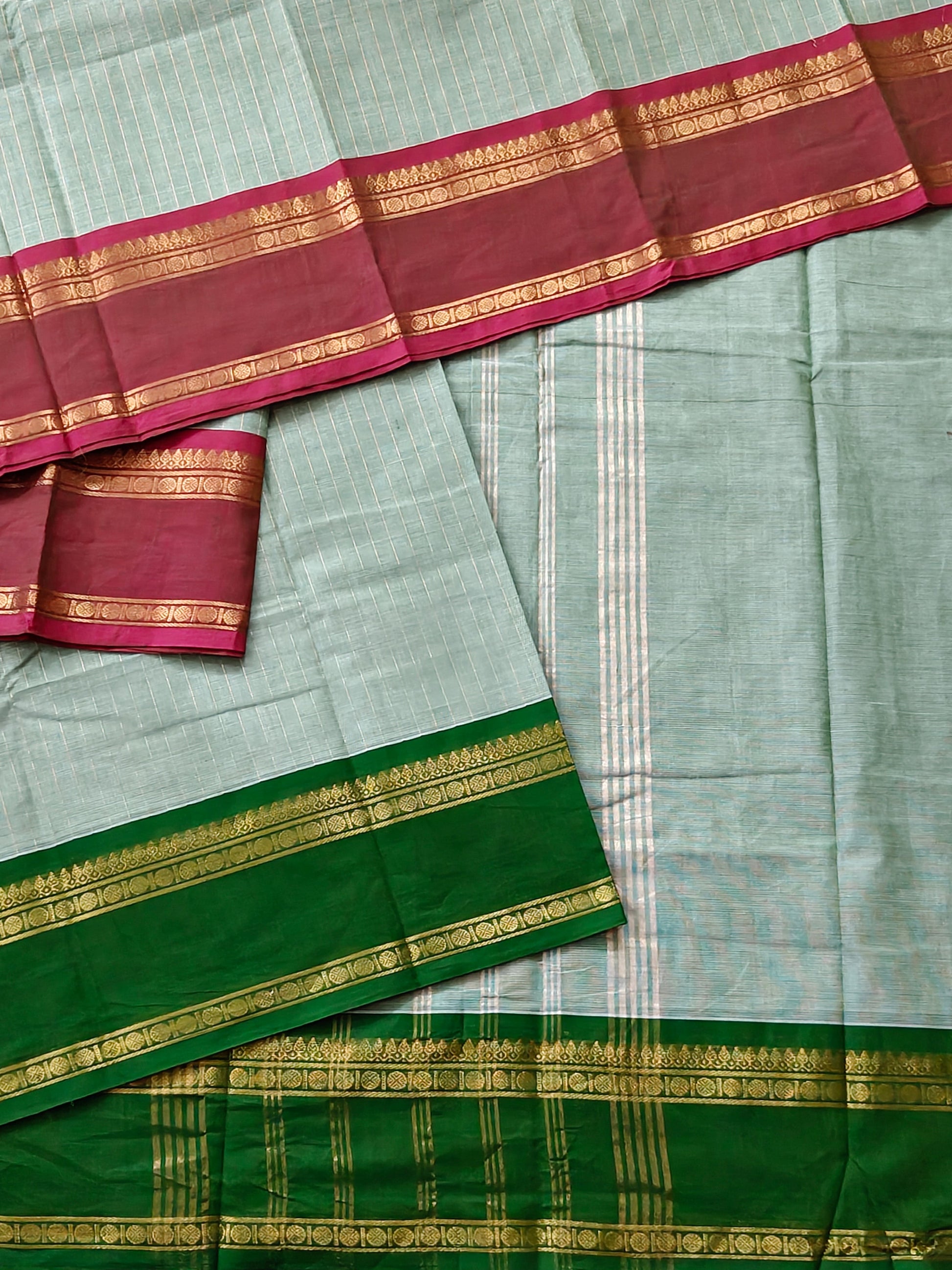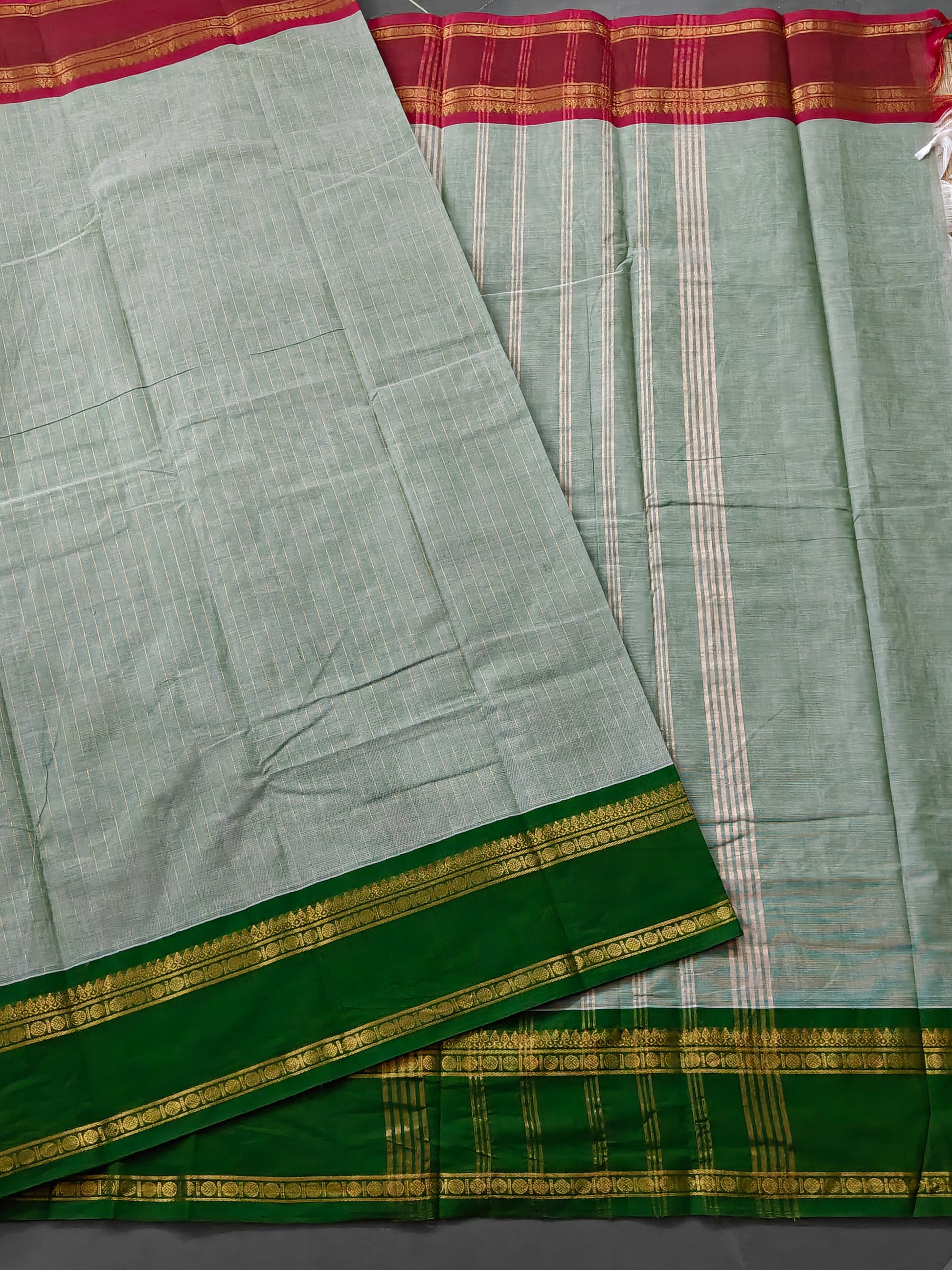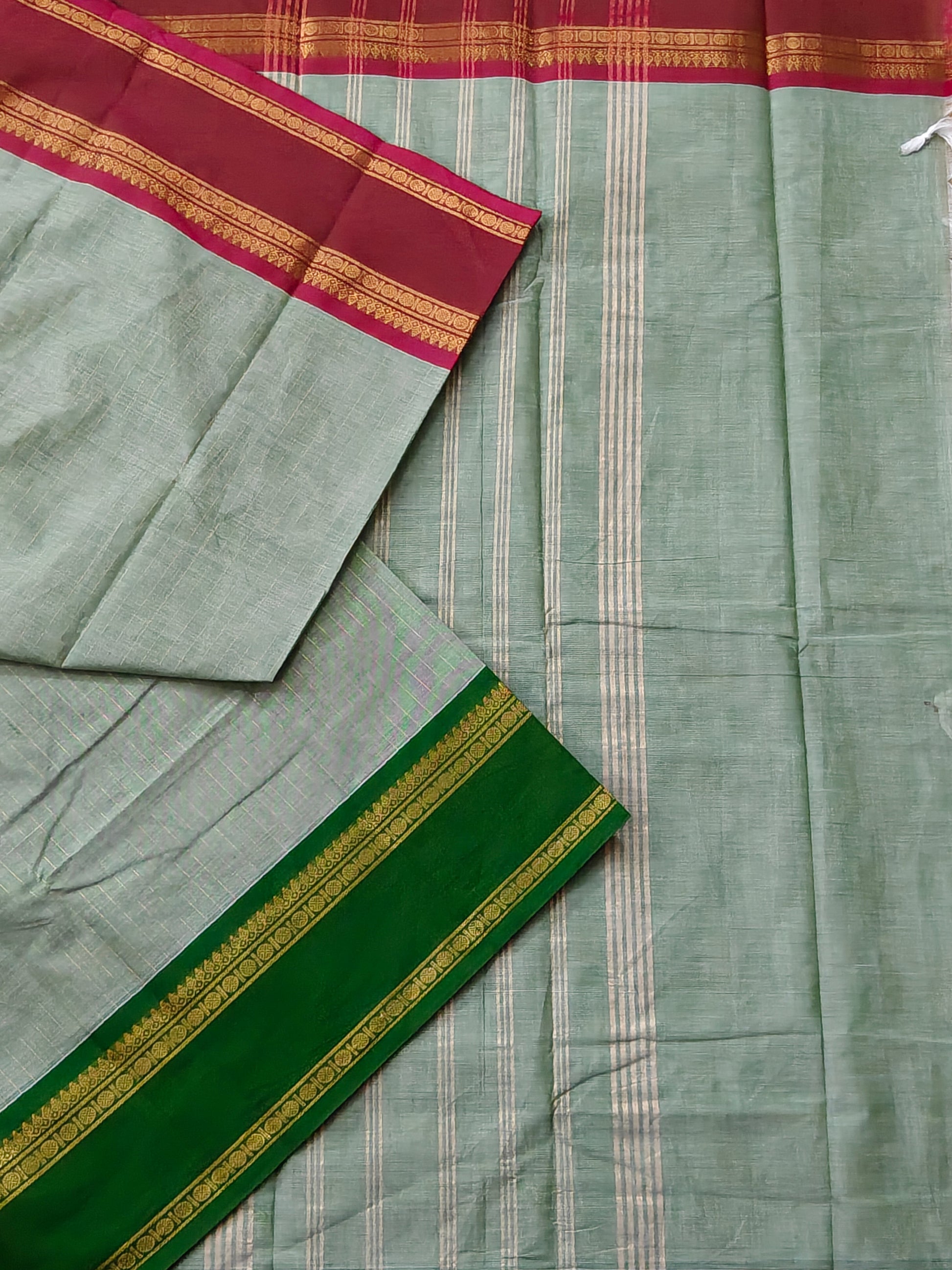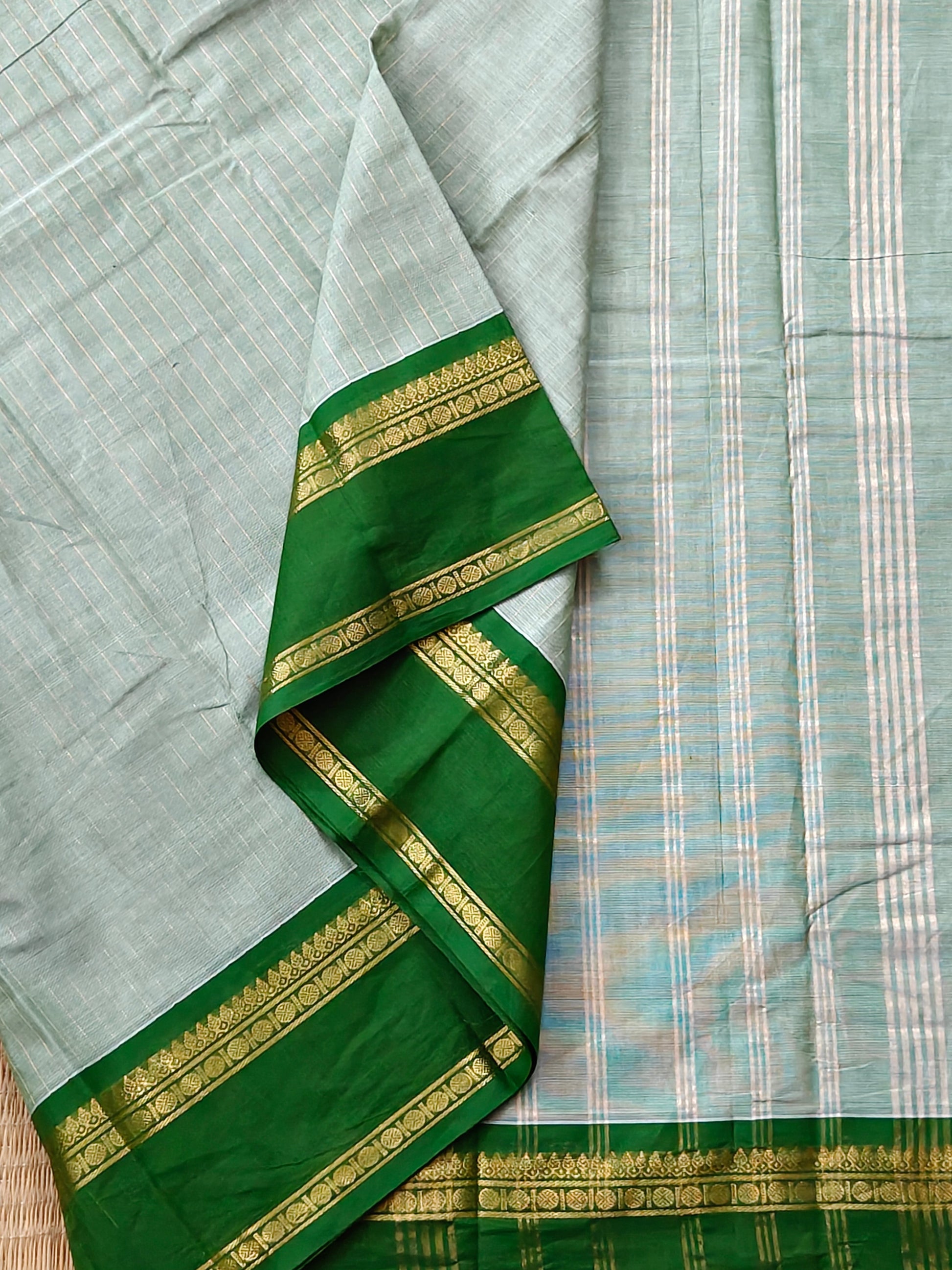Elevate your ethnic wardrobe with this exquisite pista green cotton saree, a timeless piece that seamlessly blends tradition with understated elegance. Crafted from premium cotton, this saree features intricate zari stripes woven throughout, creating a sophisticated all-over pattern that catches light beautifully. The standout ganga jamuna zari border adds a regal touch, showcasing contrasting metallic threads that frame the drape gracefully. Paired with a plain blouse, this versatile saree works perfectly for festive occasions, family gatherings, or everyday celebrations. The breathable cotton fabric ensures comfort during extended wear, while the zari embellishments provide that special occasion appeal. An investment piece for the discerning wearer who appreciates quality craftsmanship and timeless design.
