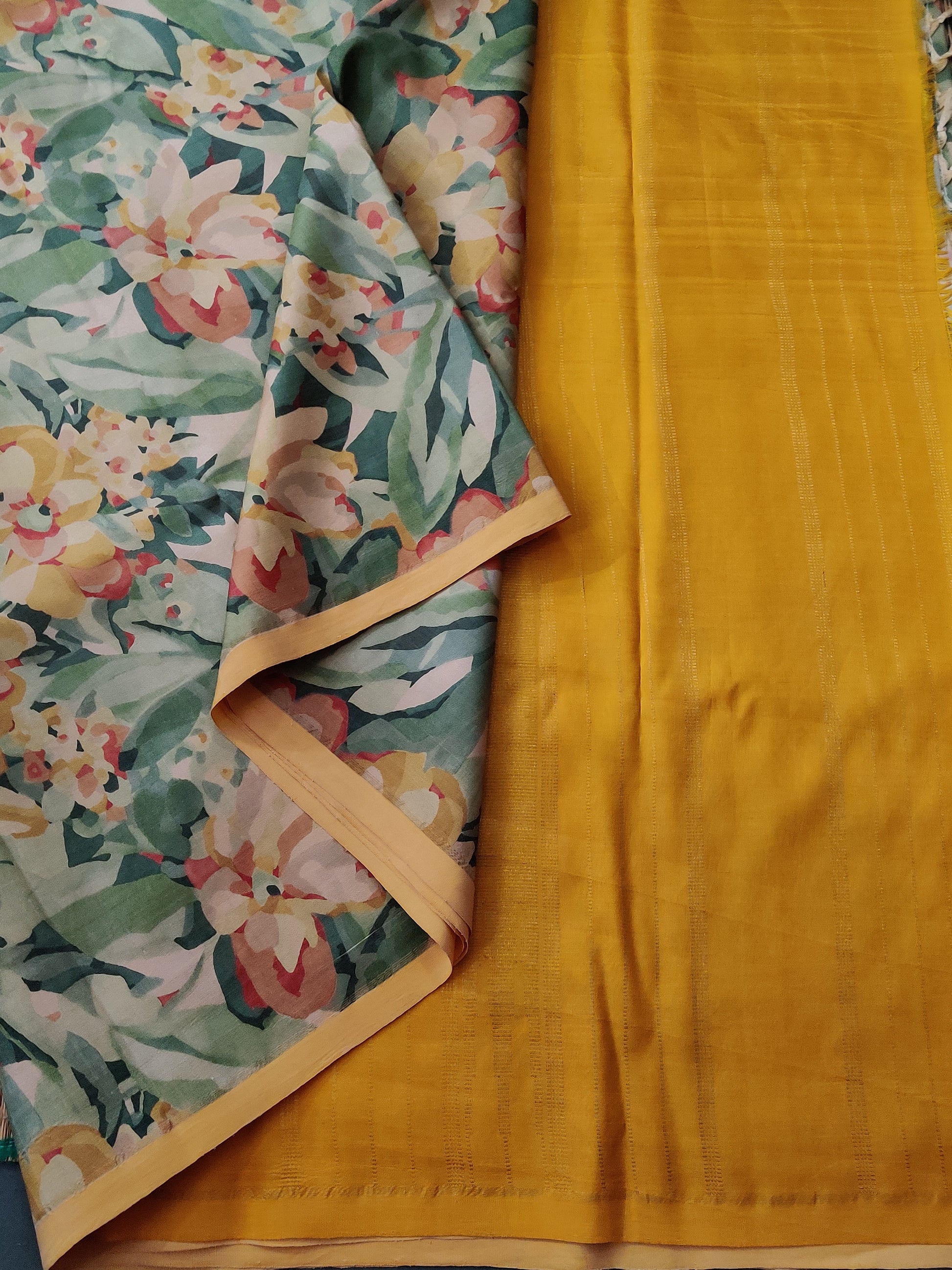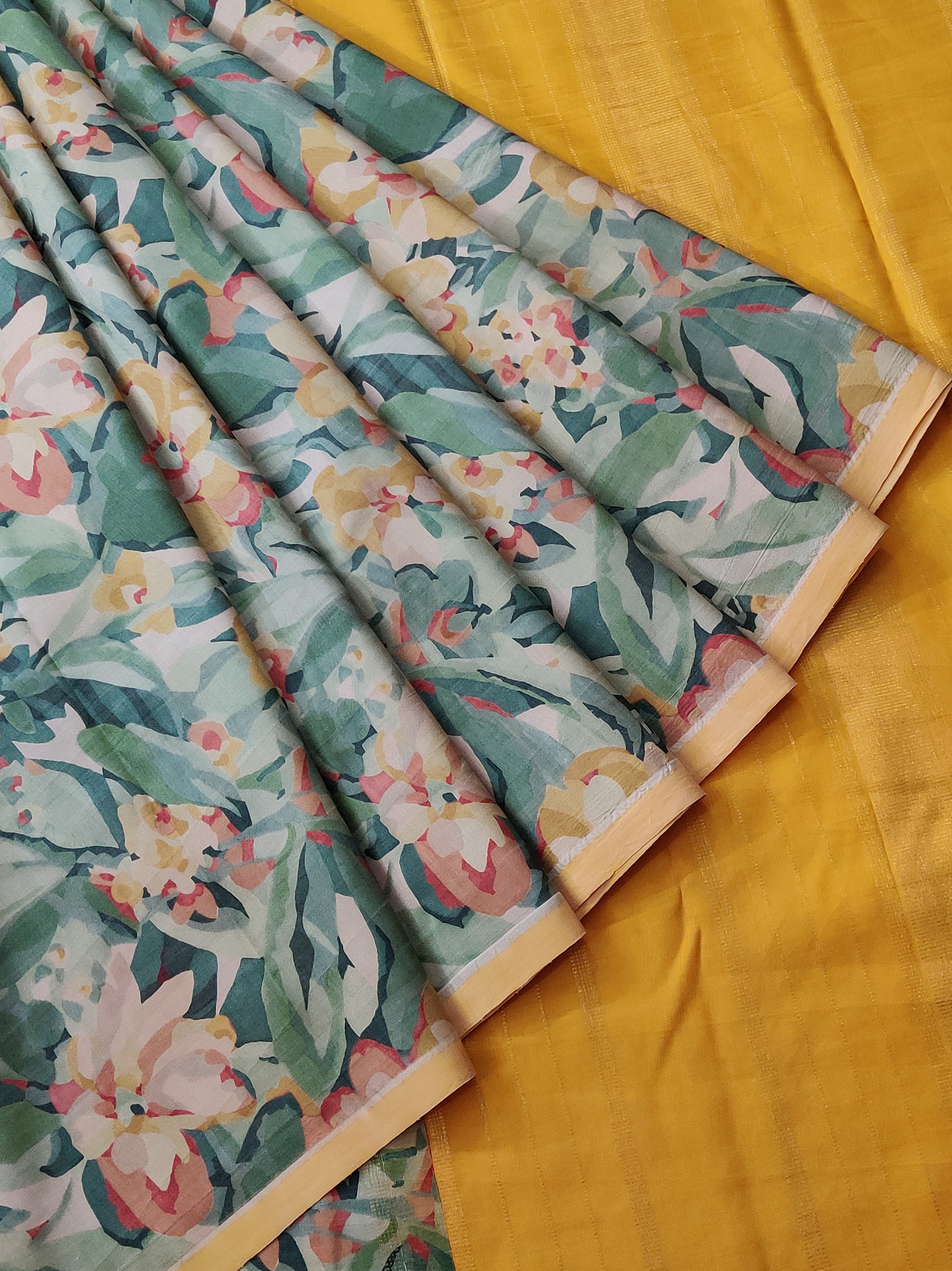 Experience the elegance of this multi-colour pure silk Kanchivaram saree, featuring an intricate floral digital print throughout. The vibrant contrast yellow zari pallu adds a traditional touch, perfectly complemented by a plain blouse for a balanced, sophisticated look. Crafted with expert precision, this saree blends classic craftsmanship with contemporary design, ideal for festive occasions and formal events.