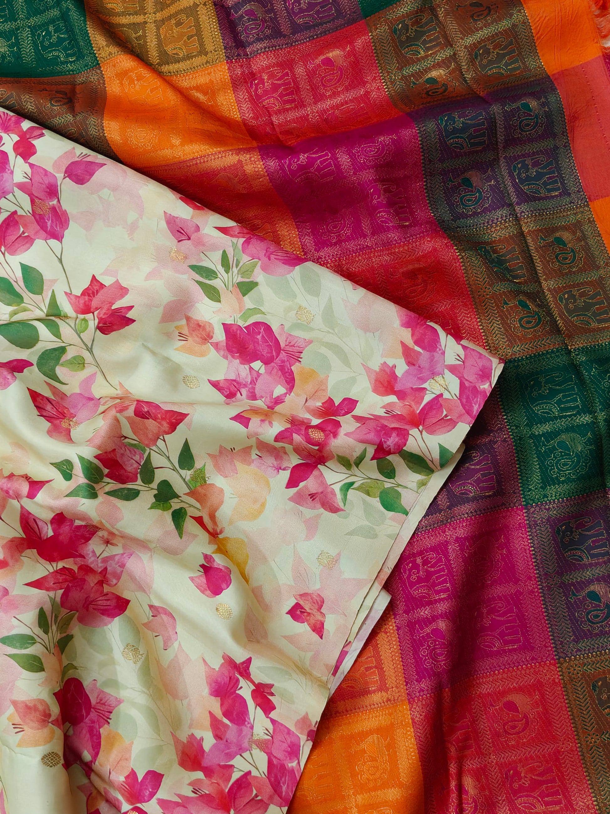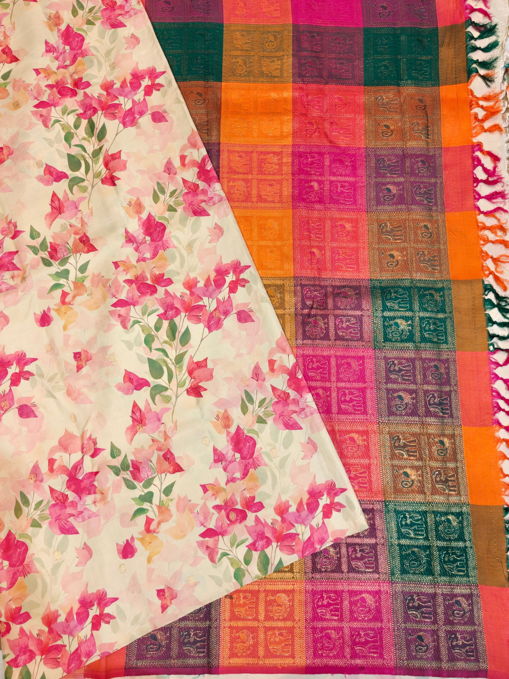 Cream olour Borderless Kanchivaram Silk Saree With Bougainvillea Digital Print All Over Code : KA0397