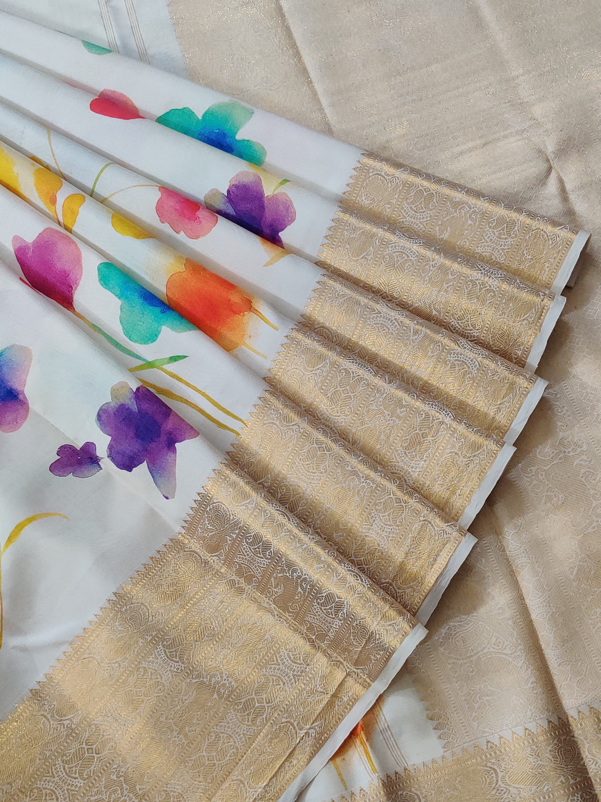 Cream Colour Kanchivaram Silk Saree With Digital Print All Over Code : KA0294