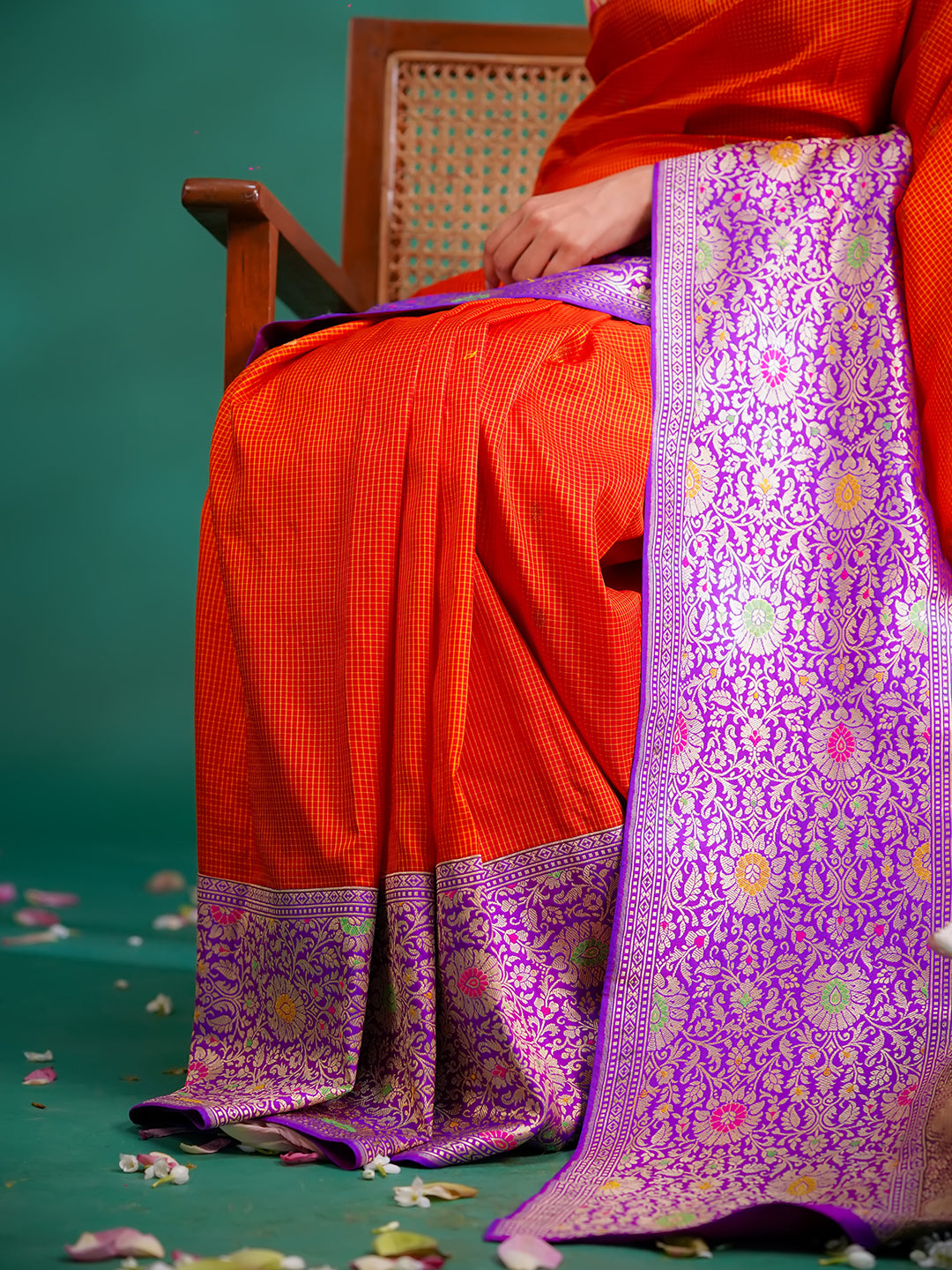 This Orange Colour Gadwal & Banarasi Border Fusion Saree features a beautiful blend of traditional and modern elements. The small zari butta all over adds a touch of elegance, while the contrast thread woven motif border and zari pallu create a stunning contrast. Complete the look with the included contrast plain blouse for a perfect fusion ensemble.