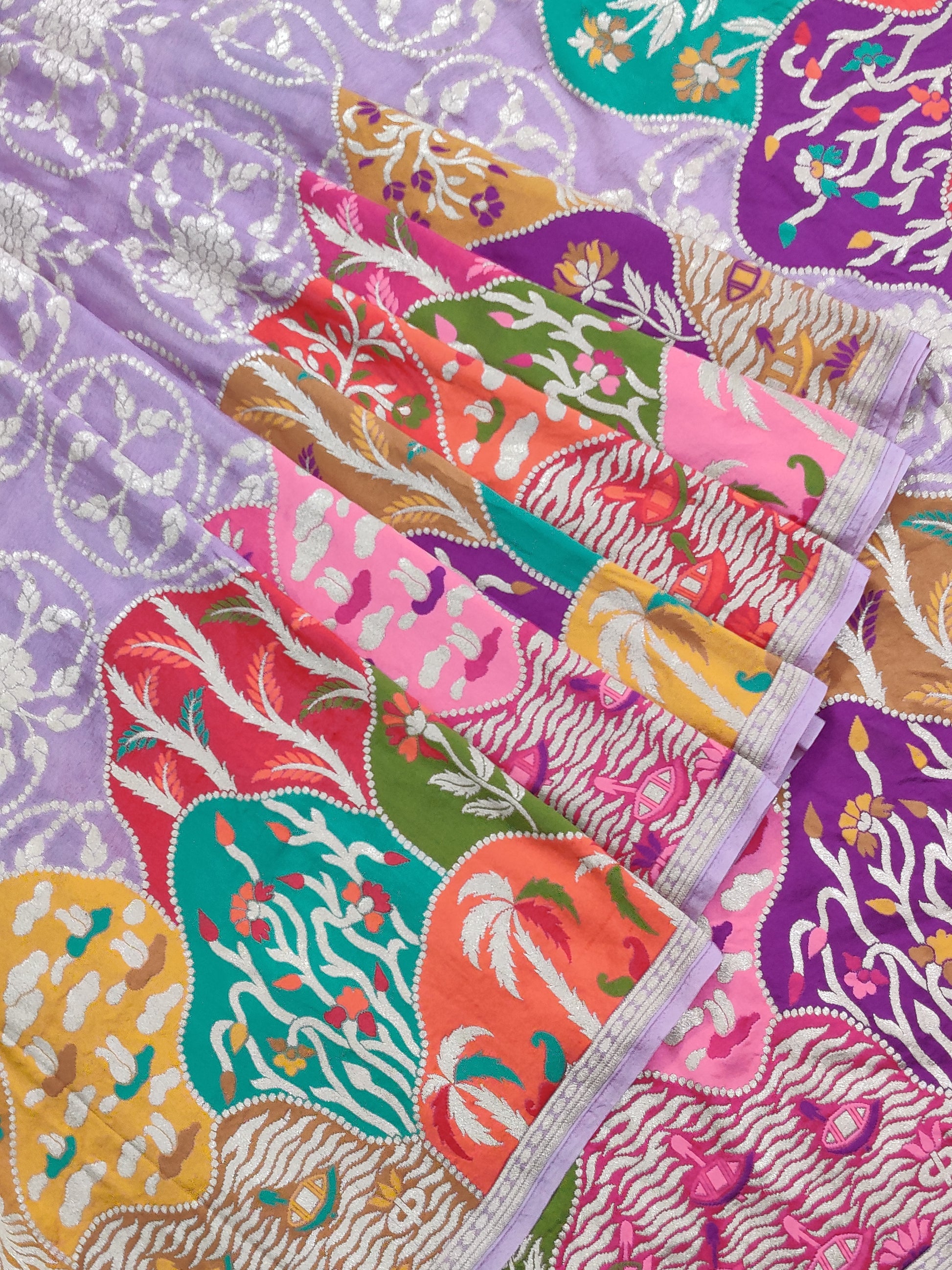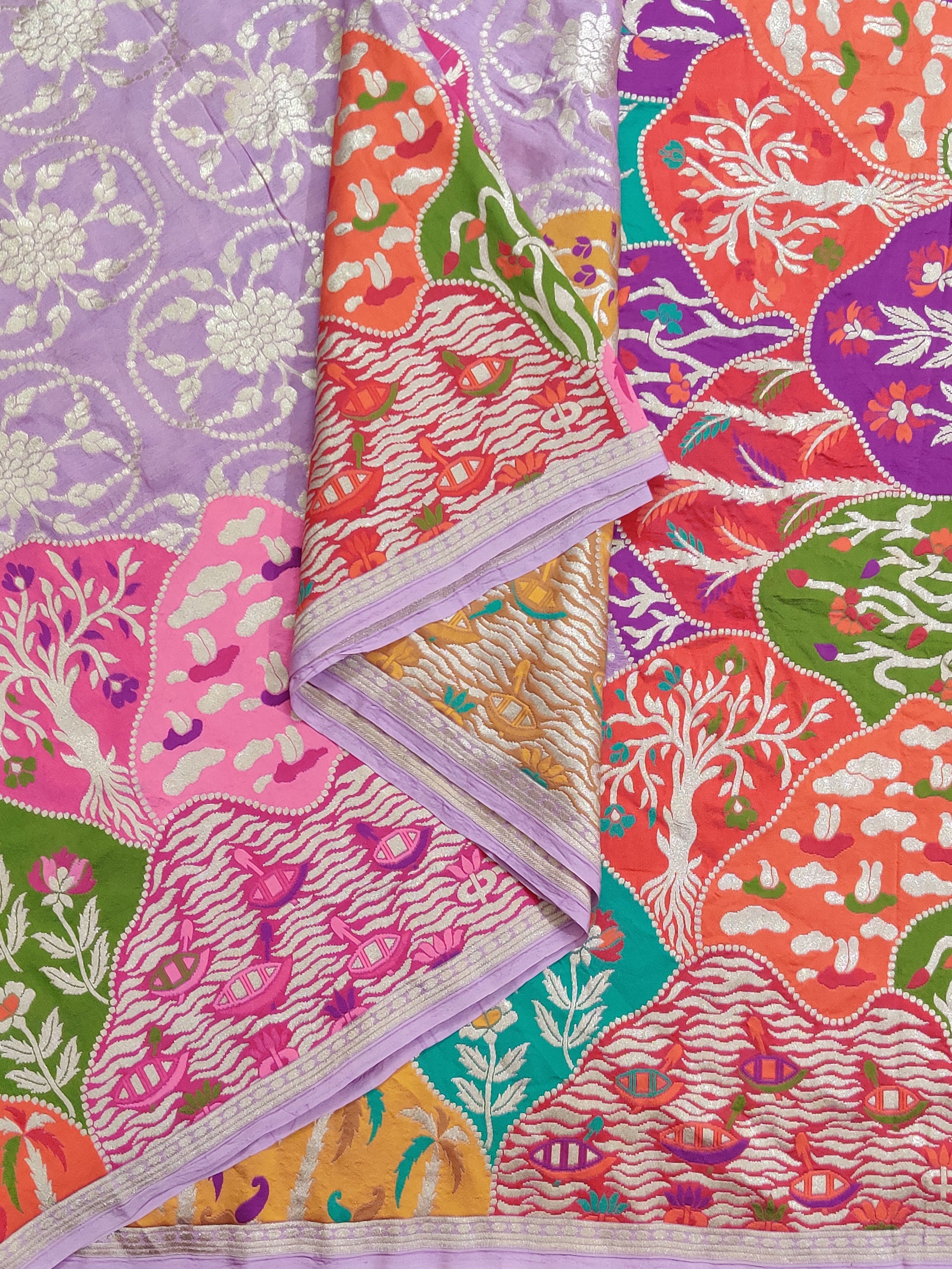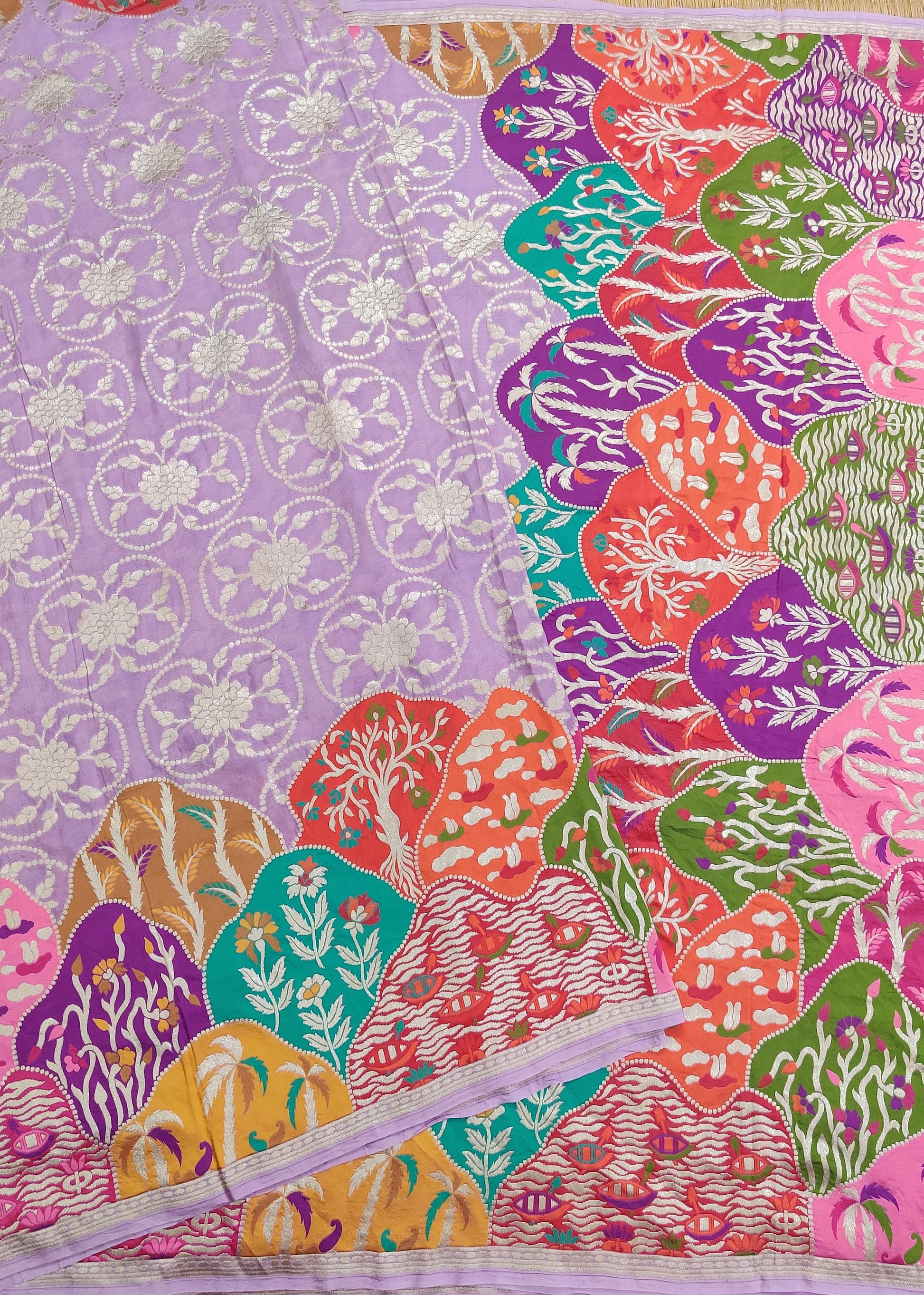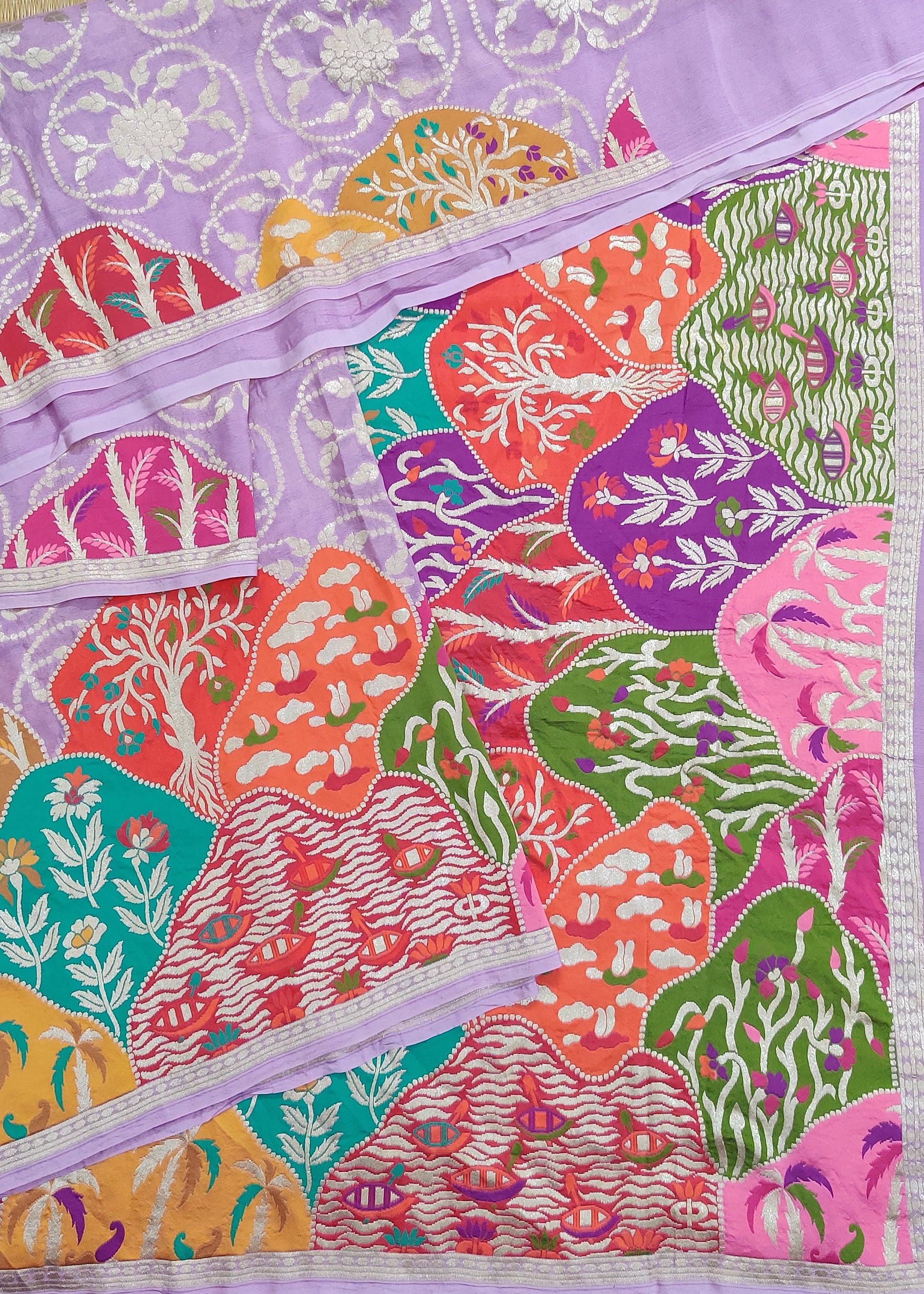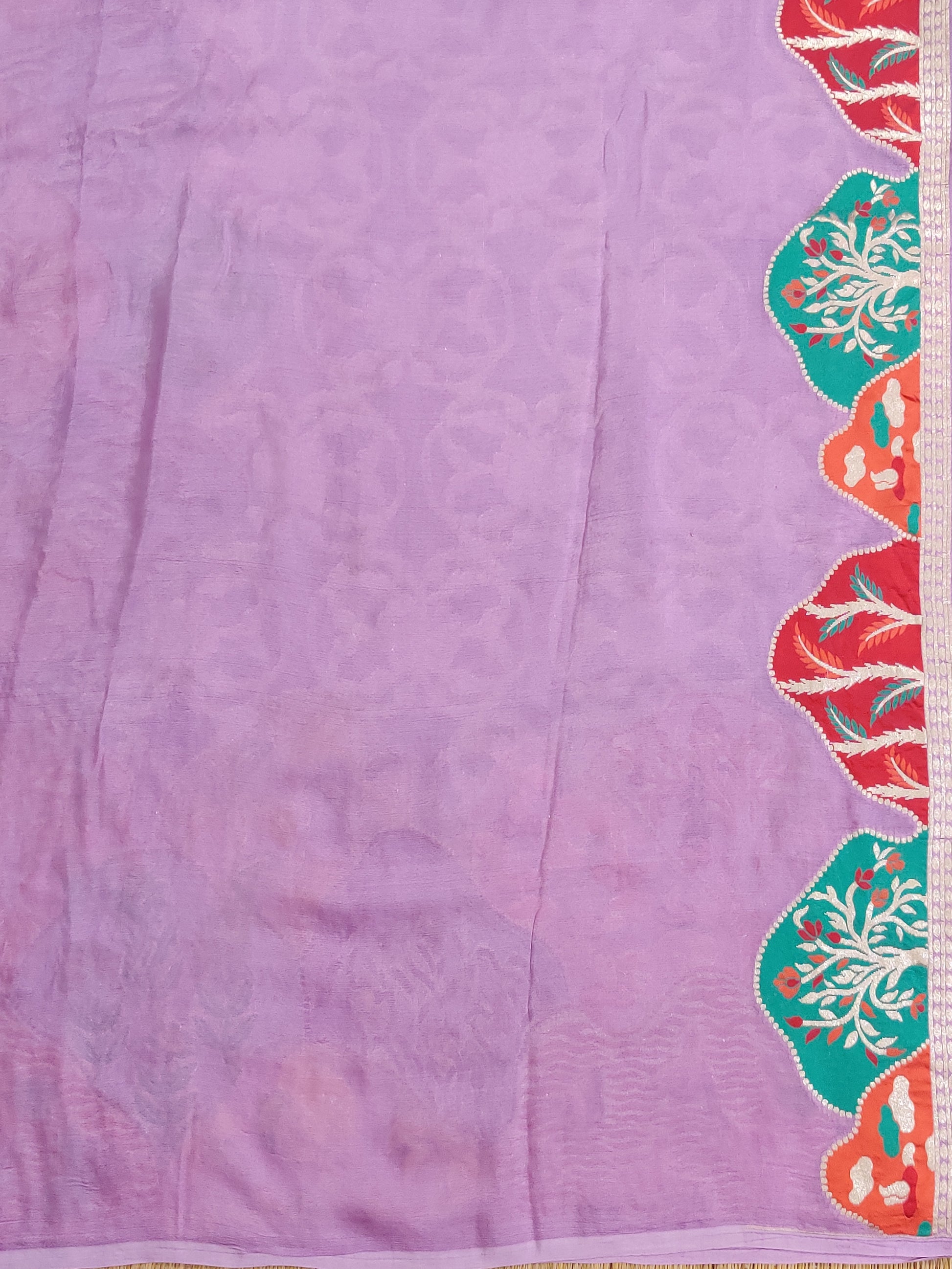 This lavender georgette Banarasi saree features intricate floral zari motifs woven throughout, blending traditional craftsmanship with elegant design. The multi-colour border and pallu add a vibrant contrast, enhancing the saree's rich texture. Paired with a plain blouse, this piece offers a graceful and sophisticated look suitable for special occasions and formal events.