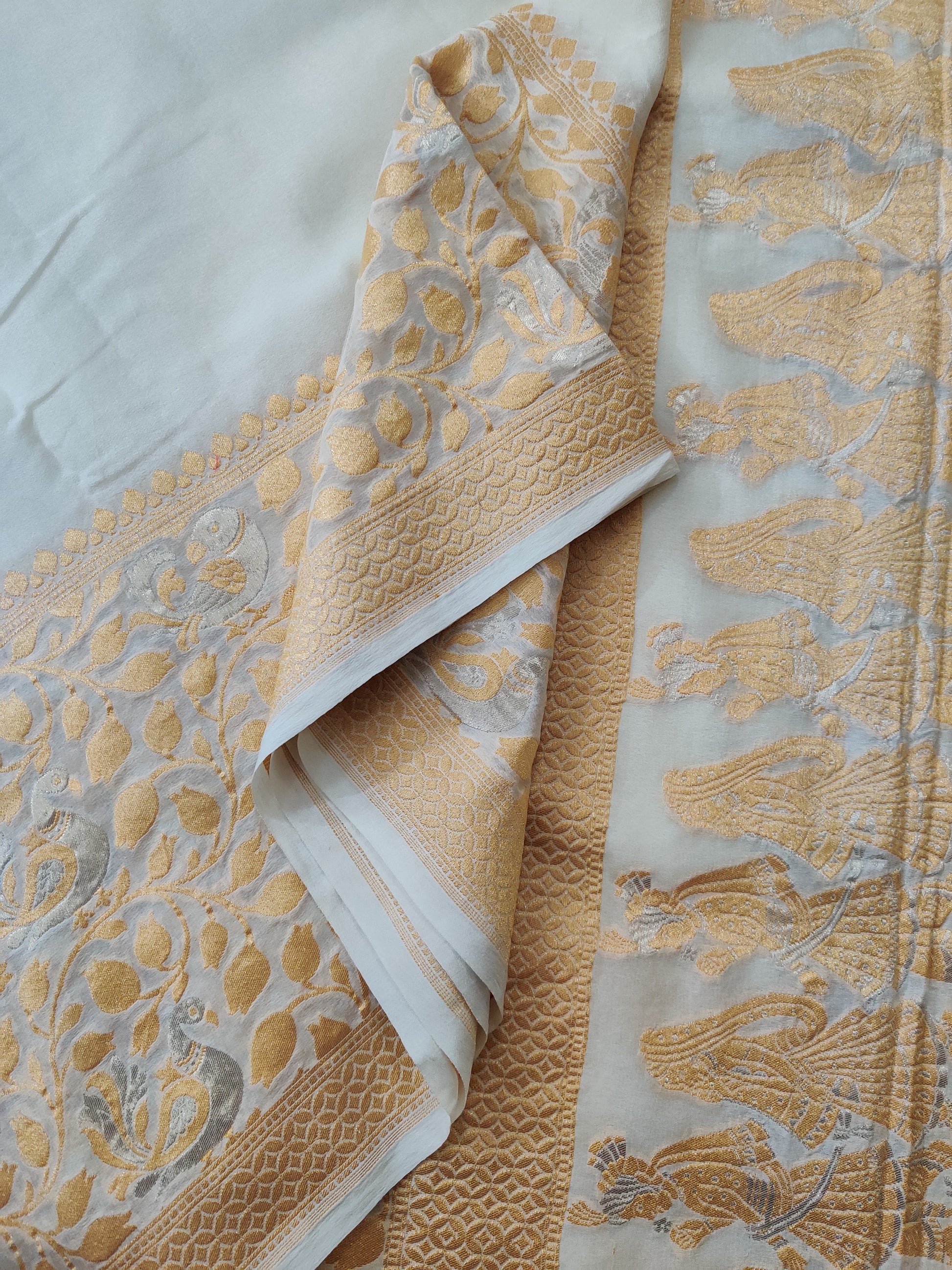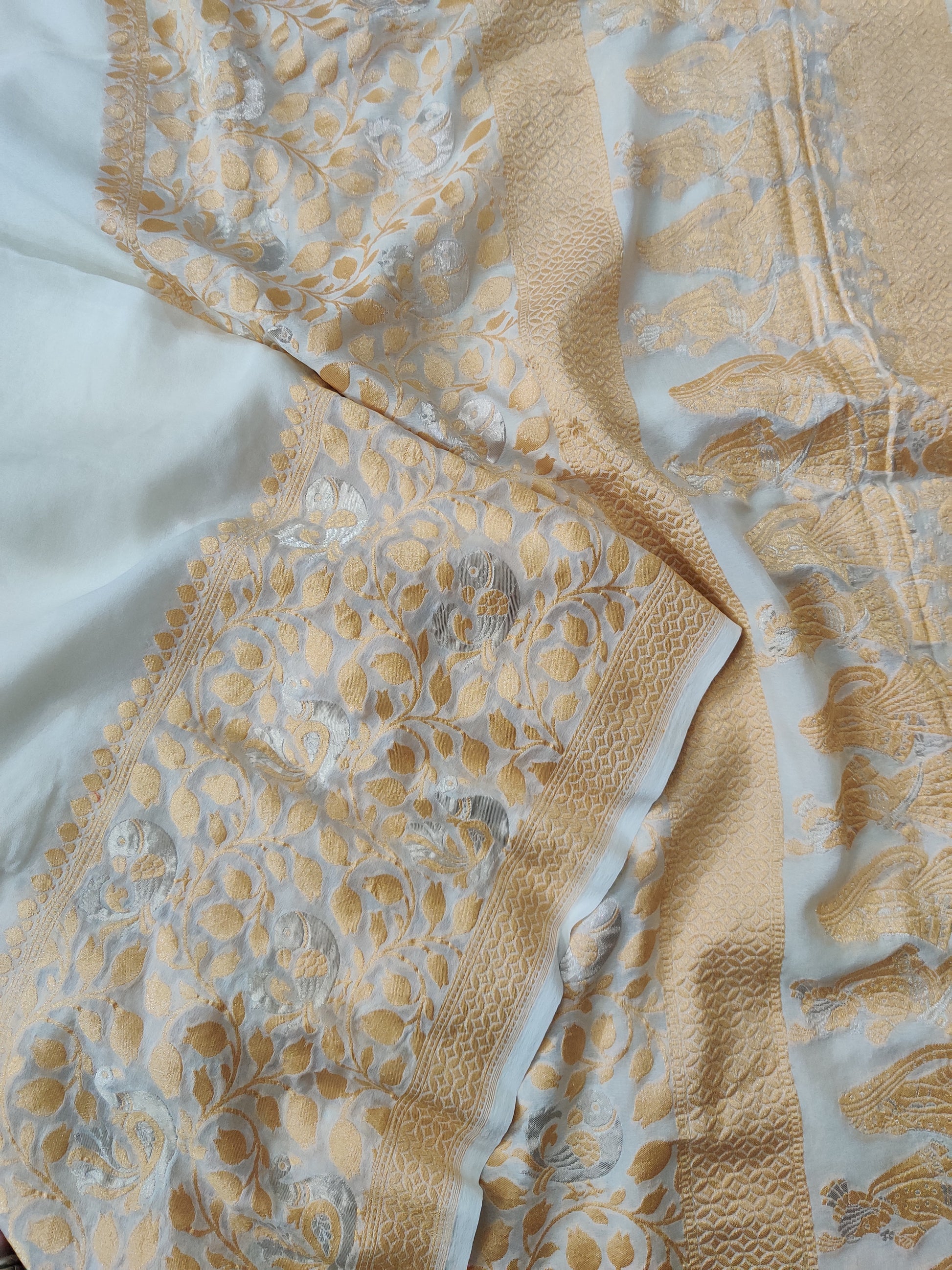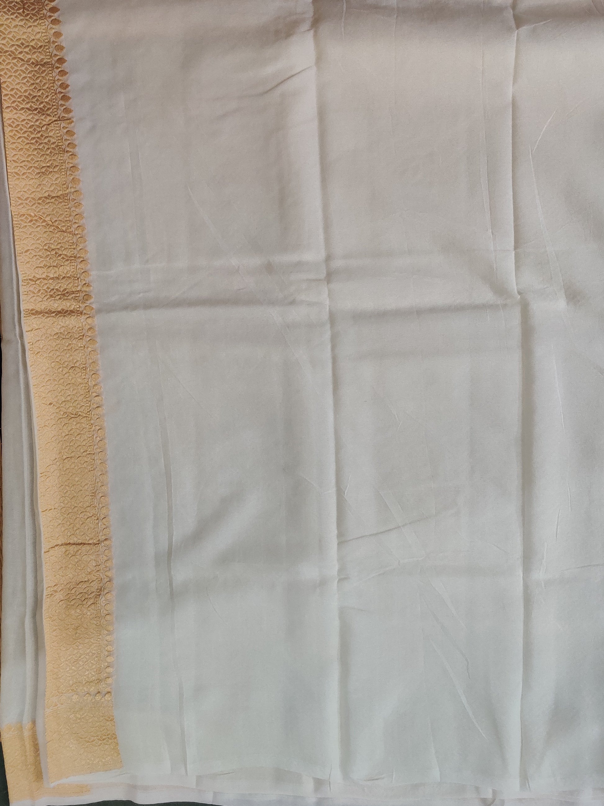 Elevate your ethnic wardrobe with this sophisticated white georgette saree, a timeless choice for both everyday elegance and special occasions. The saree features a pristine plain body crafted from lightweight georgette fabric, ensuring comfort and graceful draping. Adorned with an intricate zari border and matching zari pallu, it showcases traditional craftsmanship with refined detailing. The accompanying plain blouse provides versatility, allowing you to style it according to your preference. Perfect for weddings, festivals, or formal gatherings, this saree combines classic simplicity with luxurious embellishments, making it an essential addition to any traditional collection.