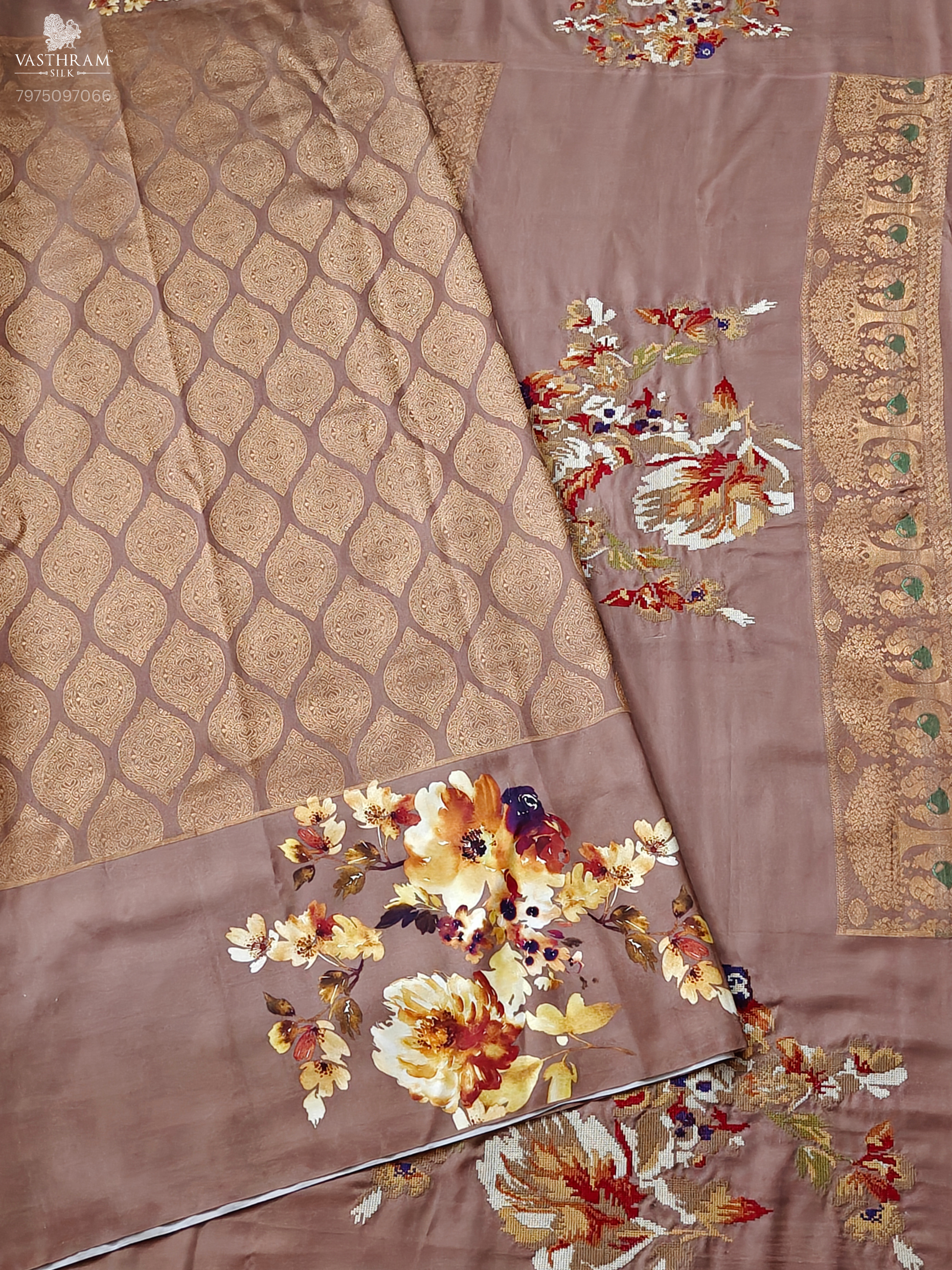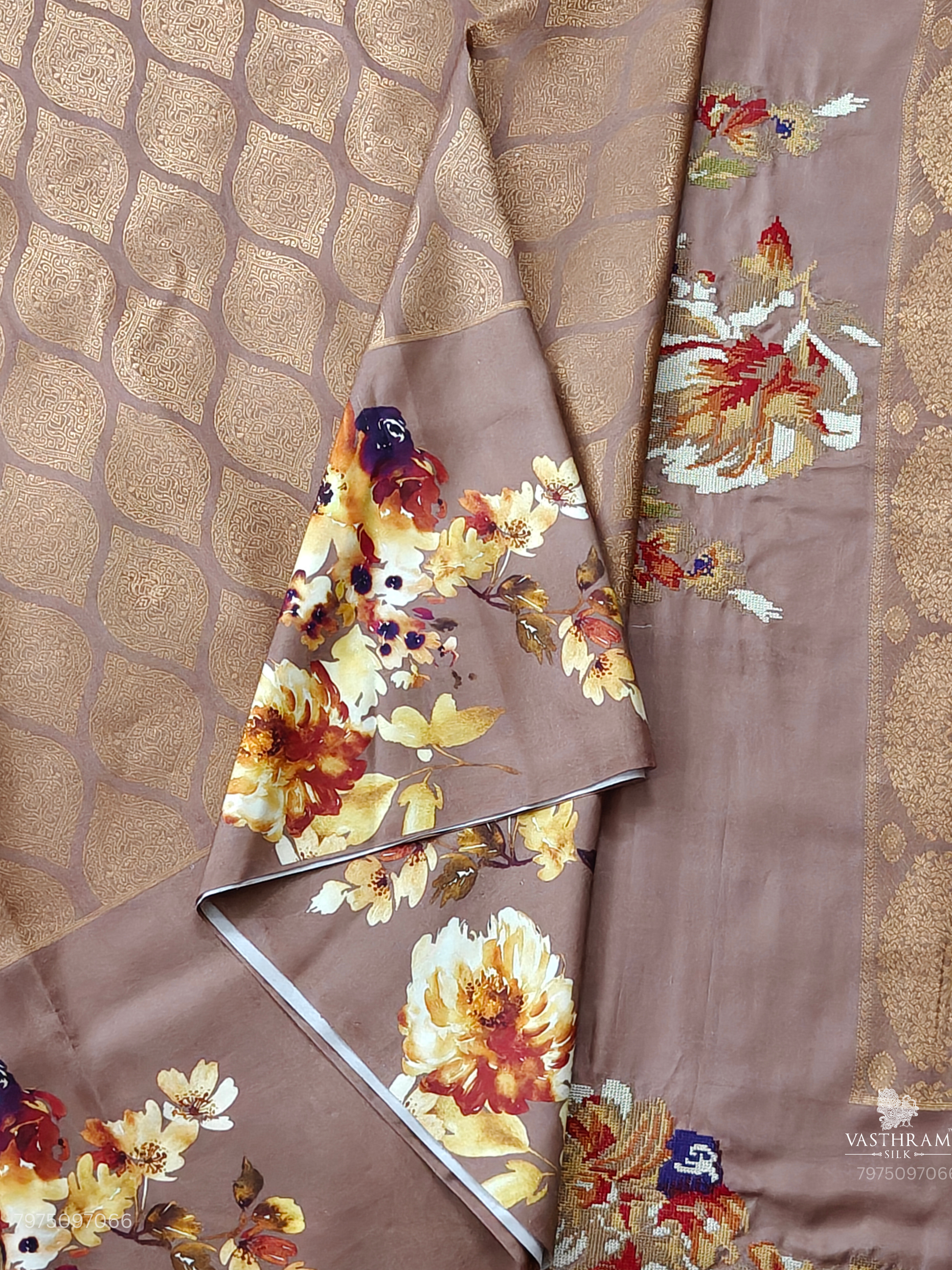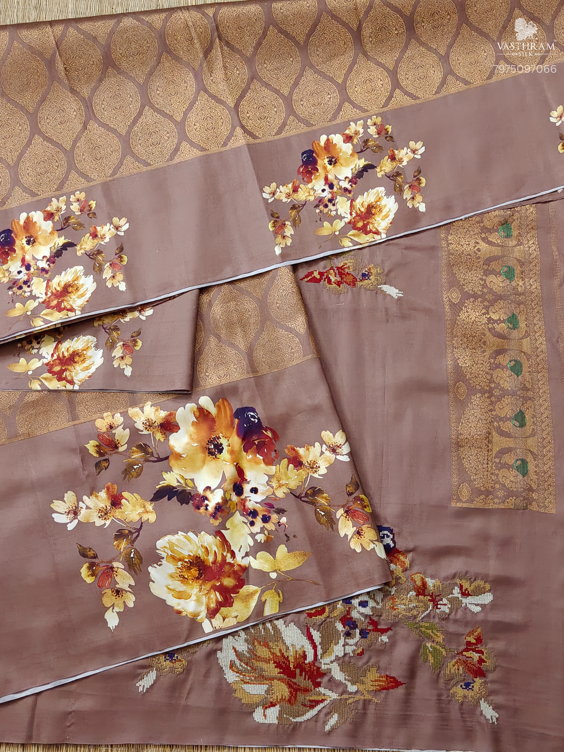 Elevate your ethnic wardrobe with this exquisite brown Kanchivaram silk saree, a masterpiece of traditional craftsmanship. Adorned with intricate zari motifs throughout the fabric, this saree features a stunning zari border that frames the entire piece with timeless elegance. The pallu showcases delicate petitpoint embroidery and meenkari work, adding dimensional artistry to your ensemble. A digitally printed border introduces contemporary flair while maintaining classical appeal. Paired with a coordinating printed blouse, this saree seamlessly blends heritage weaving techniques with refined design sensibilities, making it an ideal choice for festive occasions and celebrations.