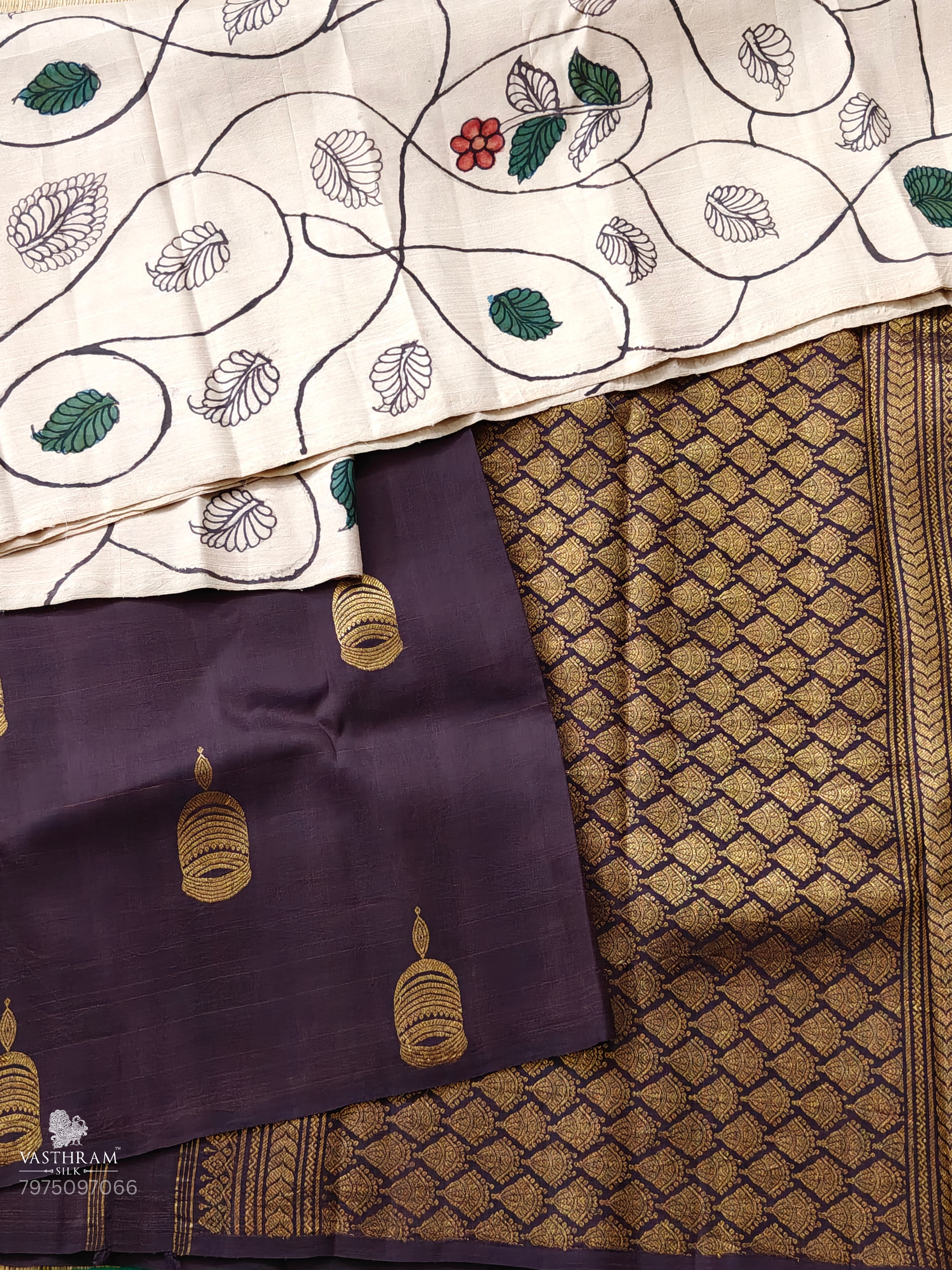 Cream & Snuff Colour Half/Half Kanchivaram Silk Saree With Penkalamkari All Over Code : KA0396