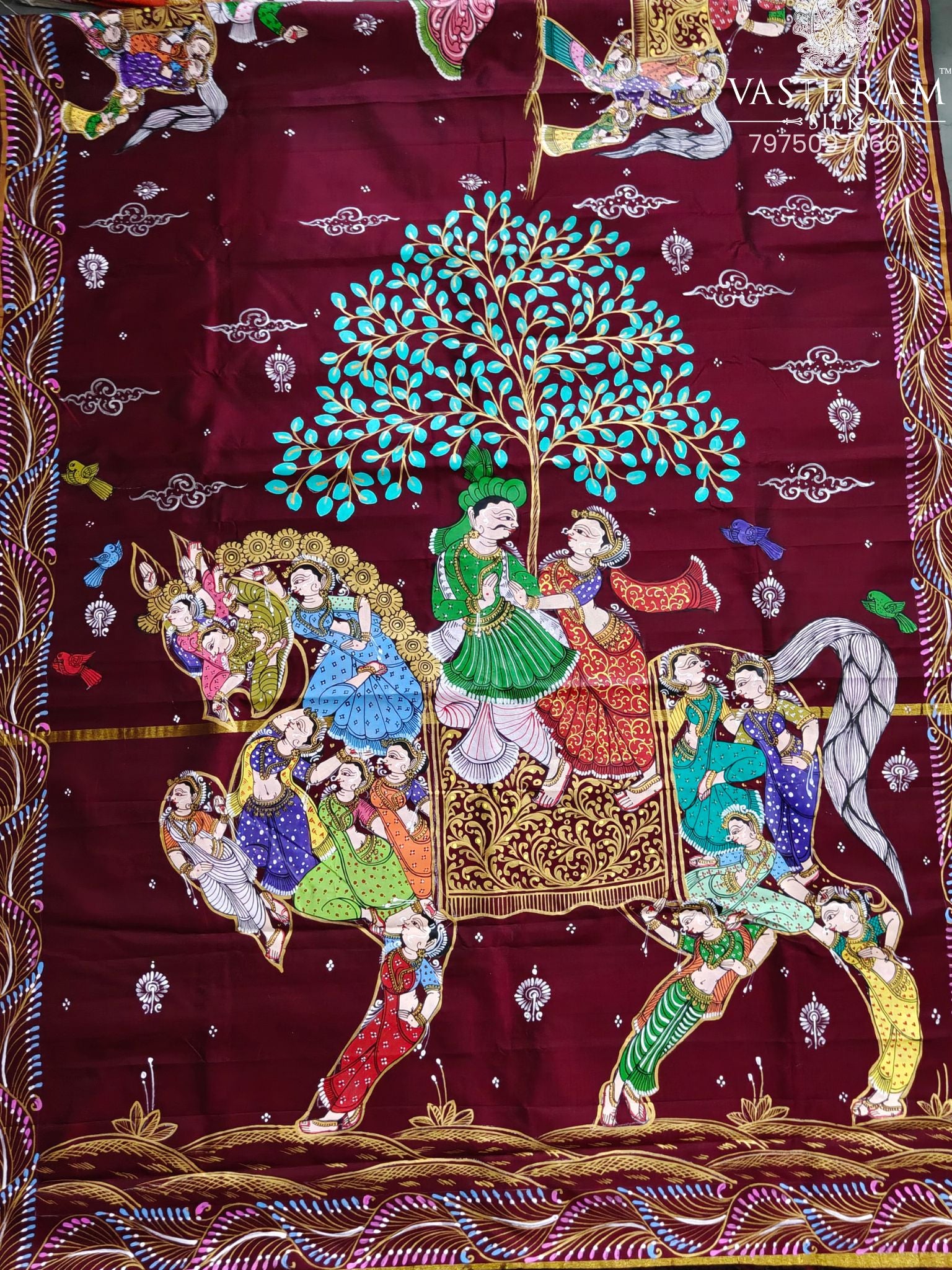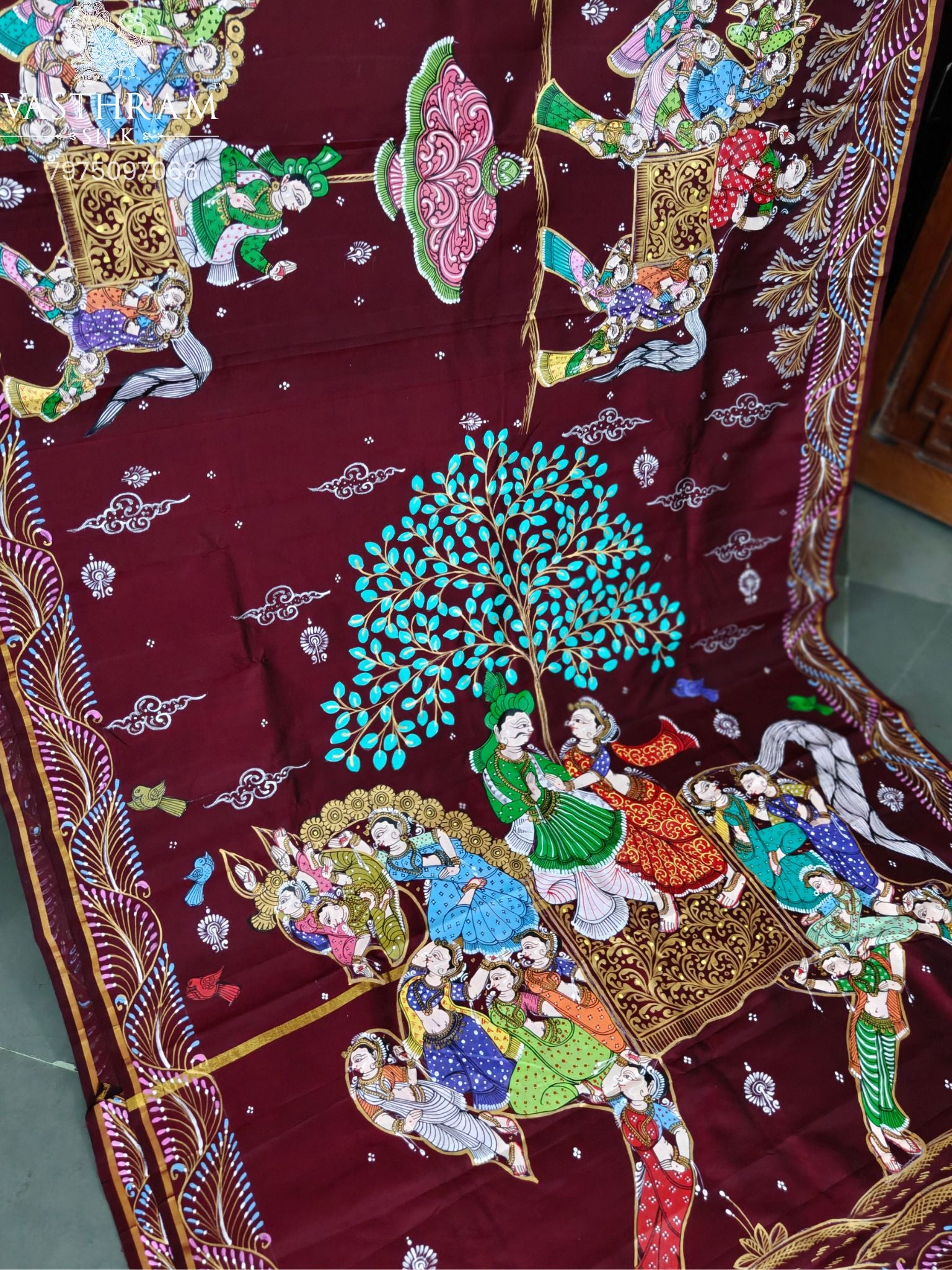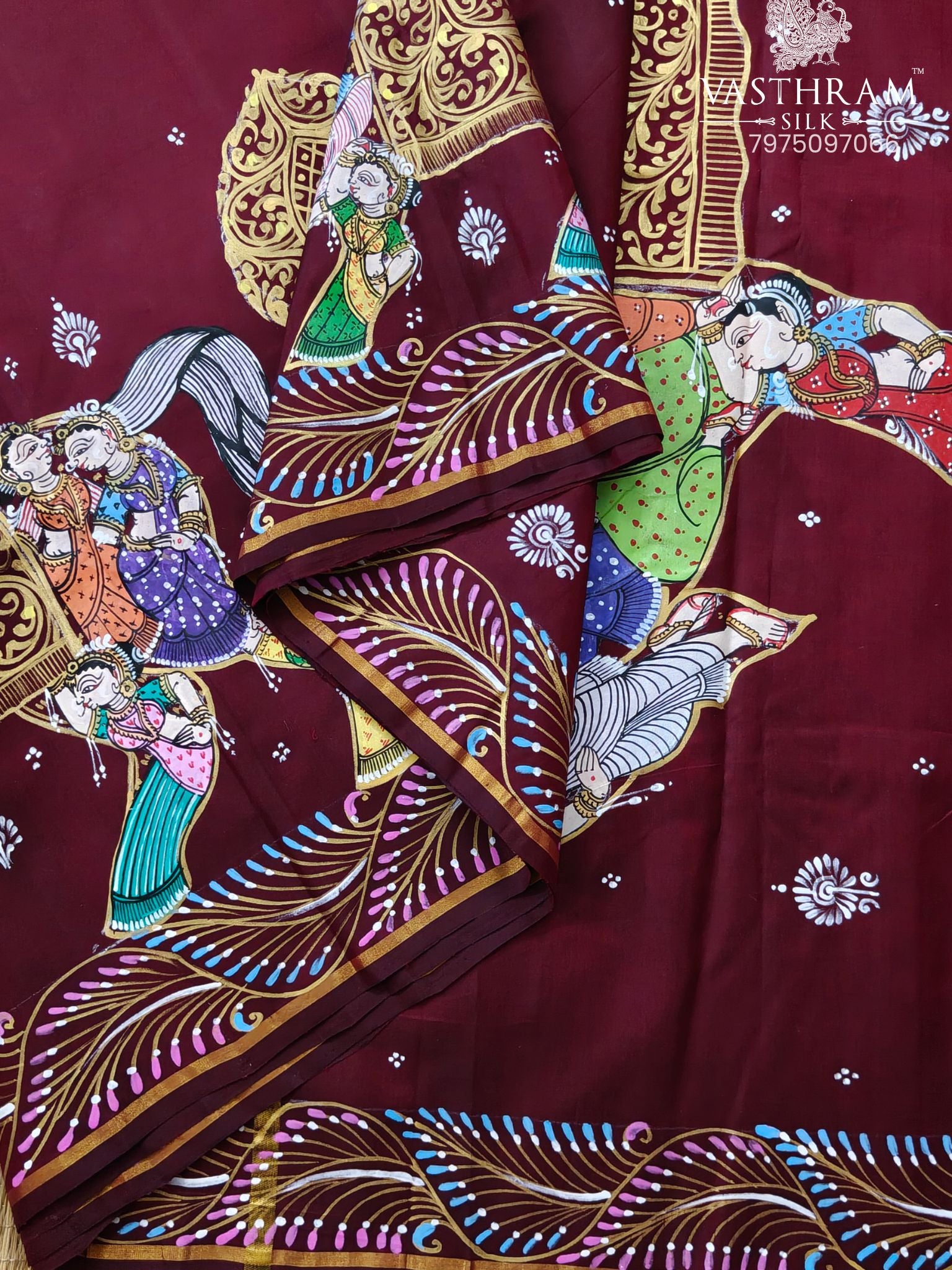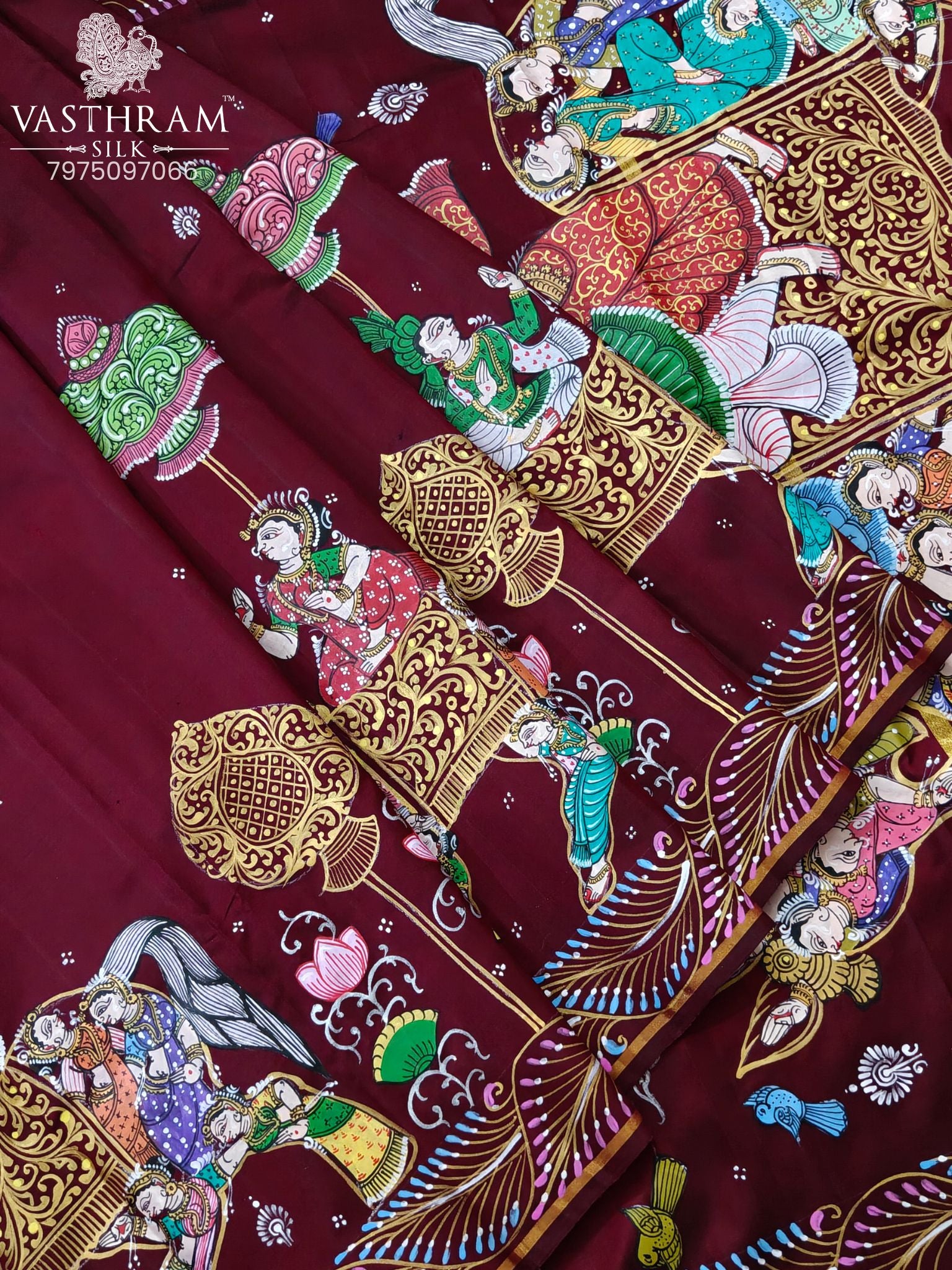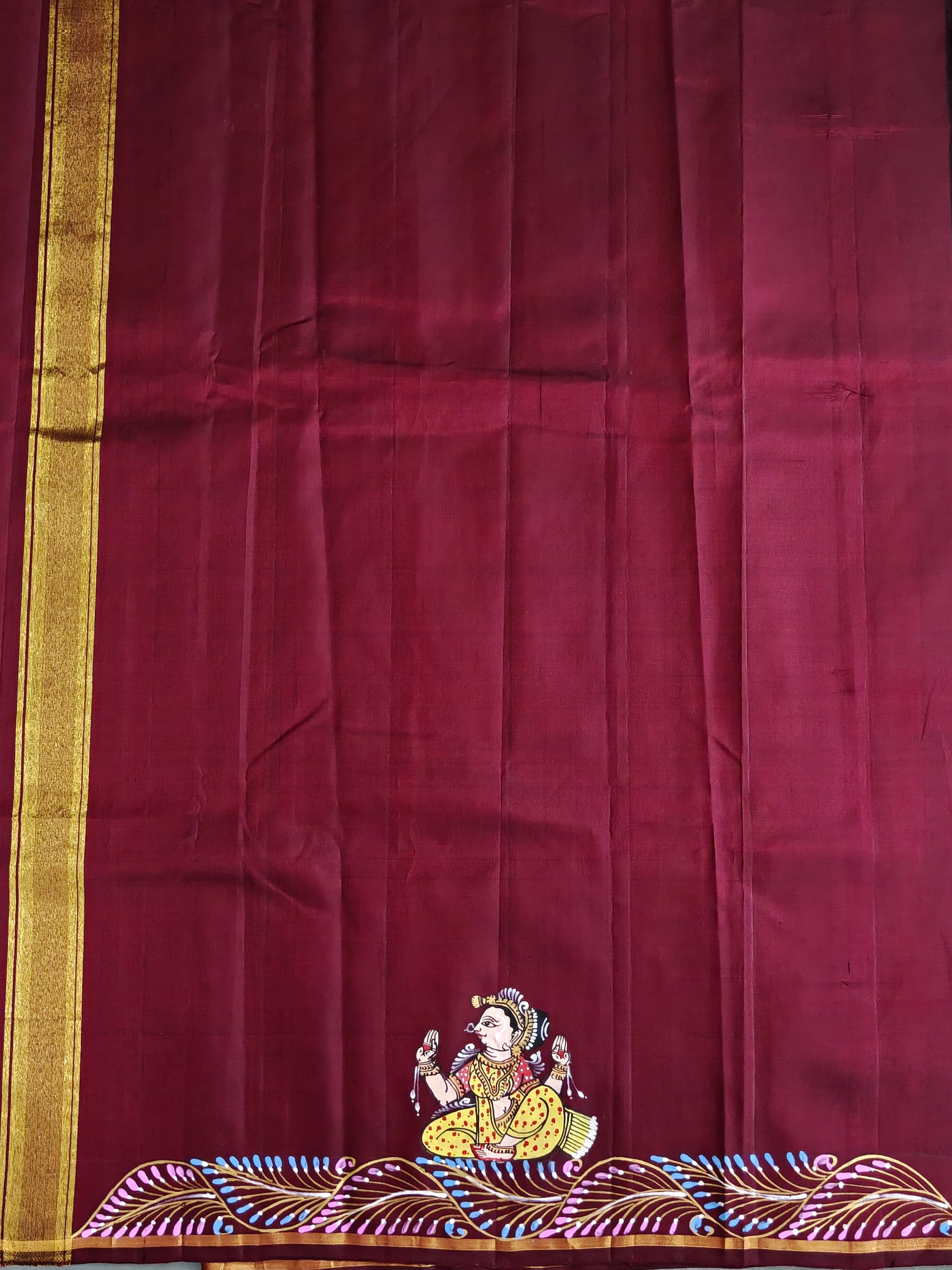 Maroon Colour Kanchivaram Silk Saree With Pattachitra Hand Painting All Over Code : KA0424
