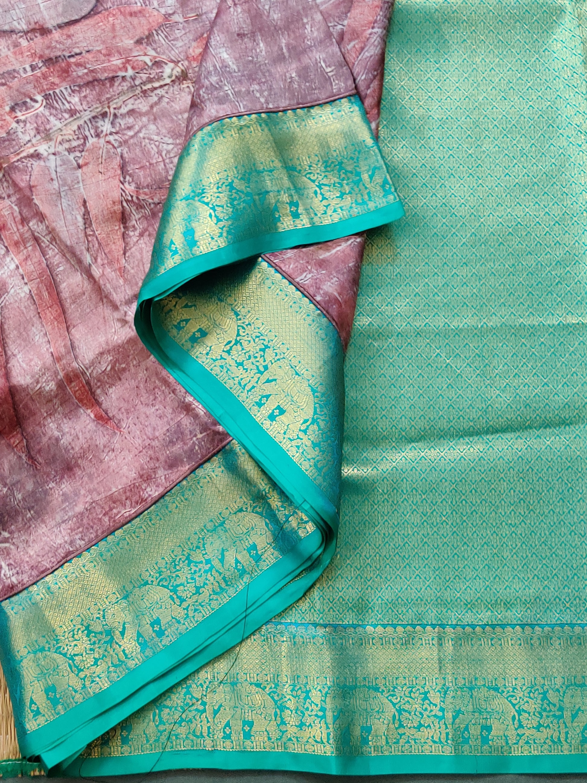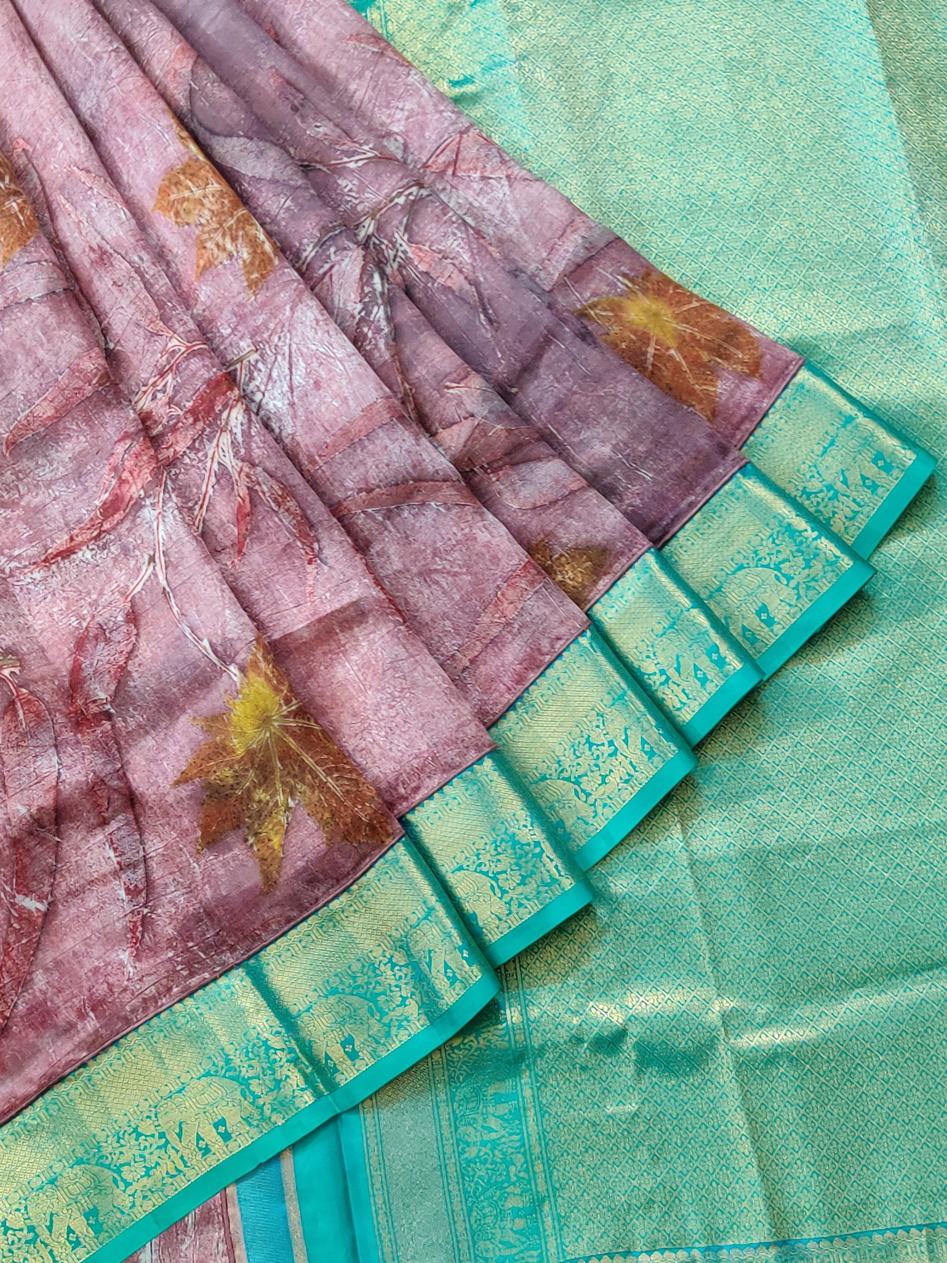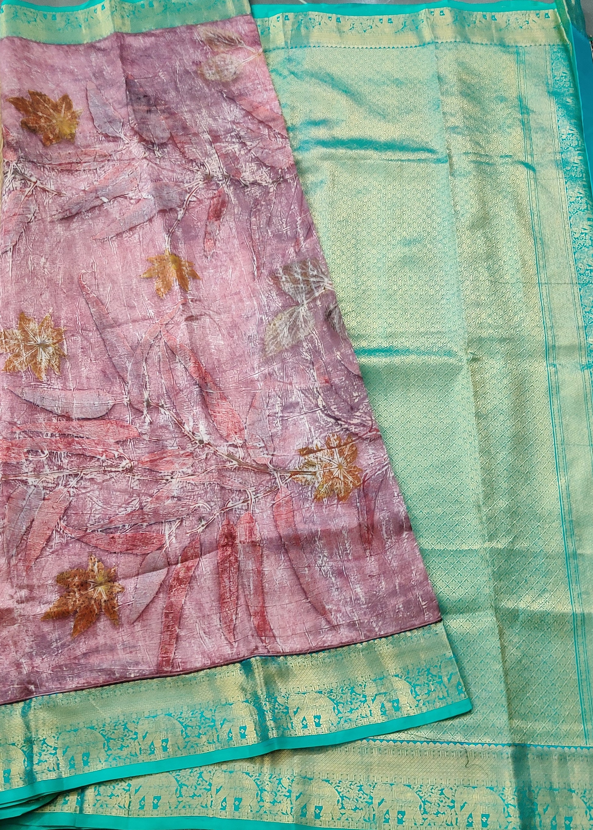 Onion Colour Kanchivaram & Murshidabad Silk Fusion Saree With Eco Print All Over Code : KA0196