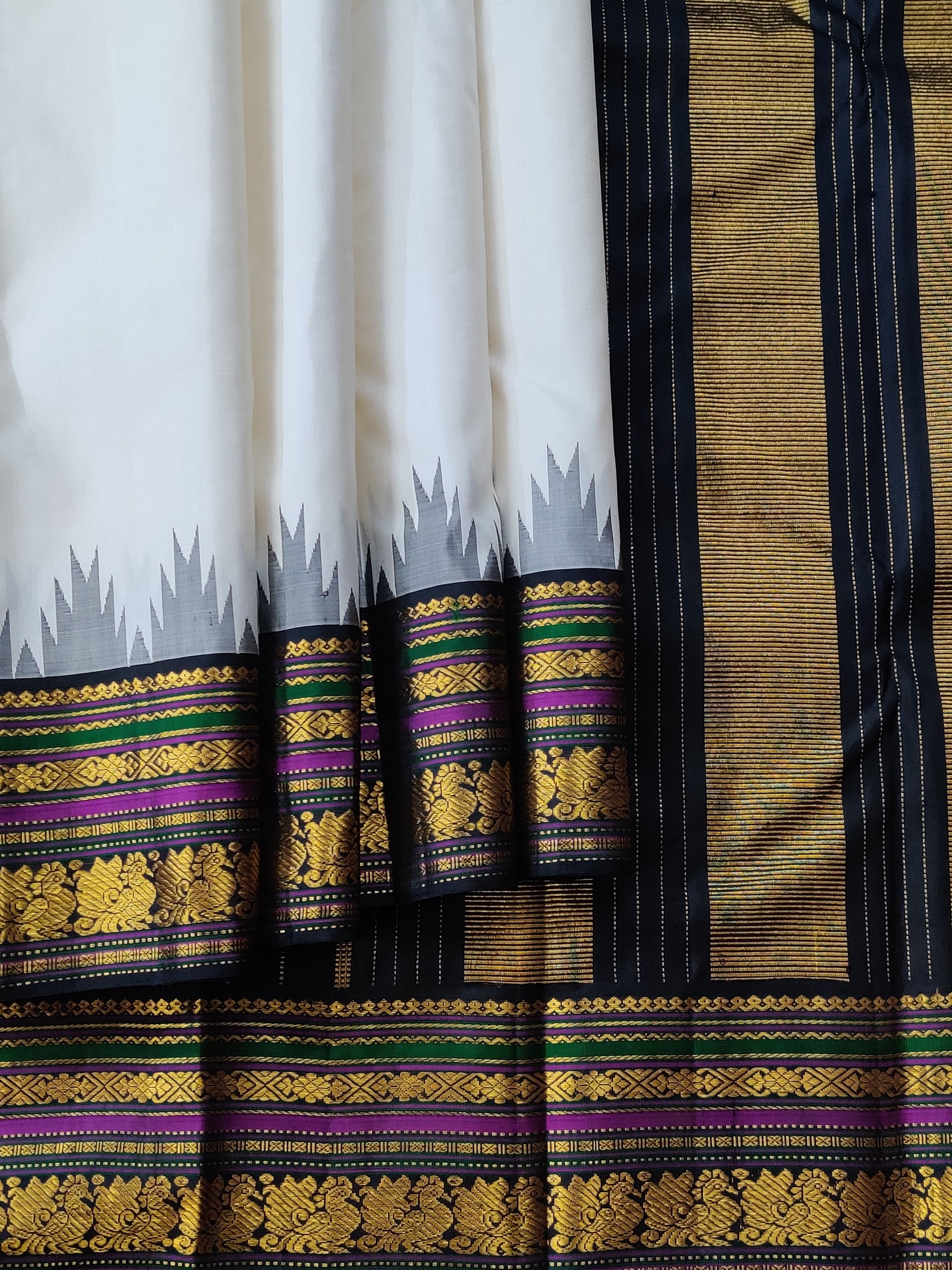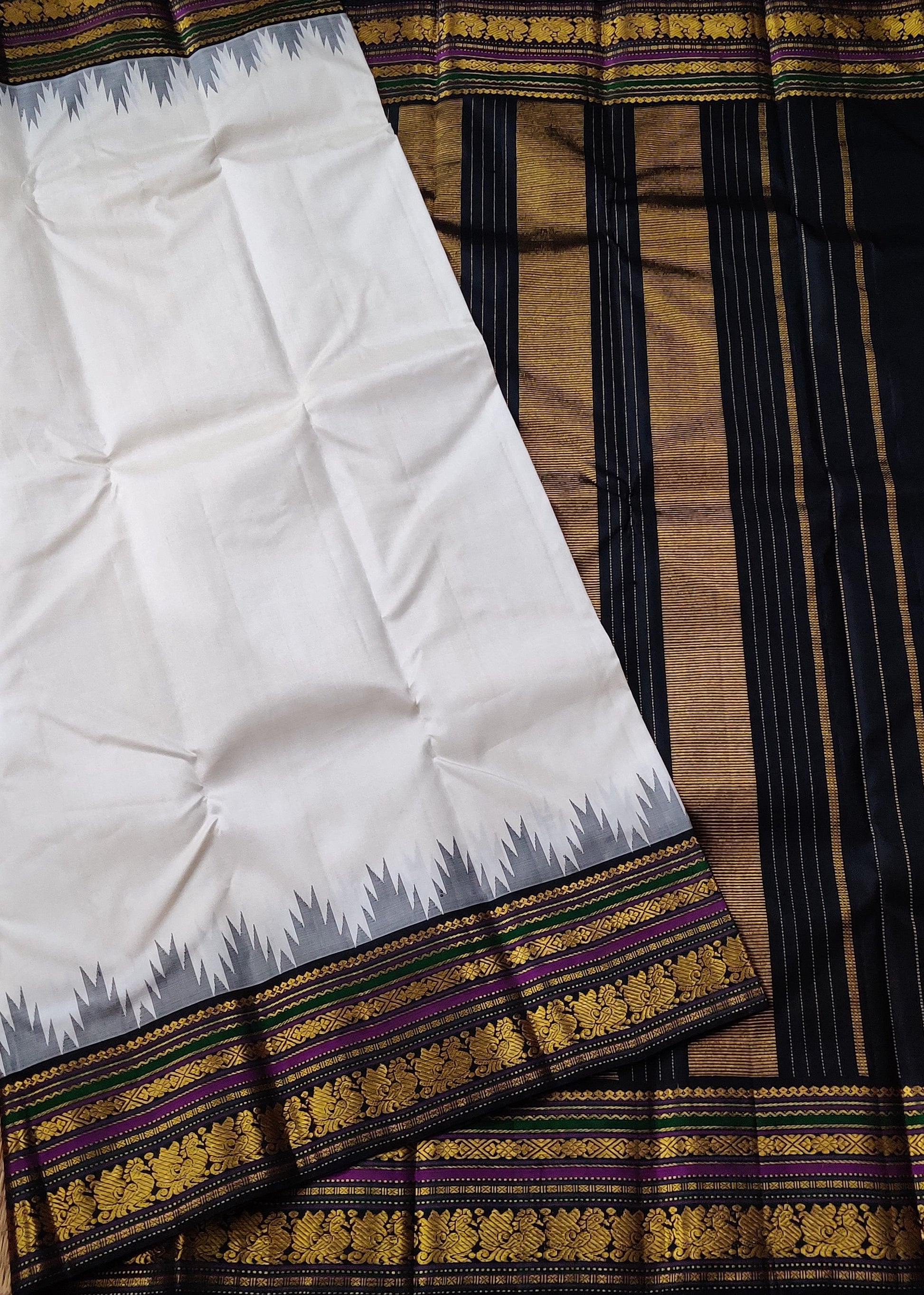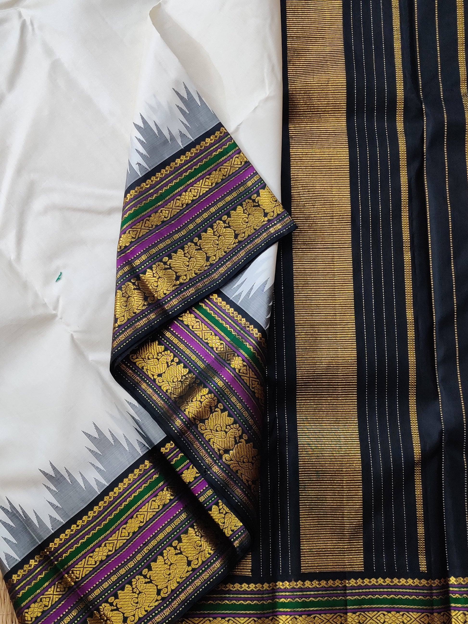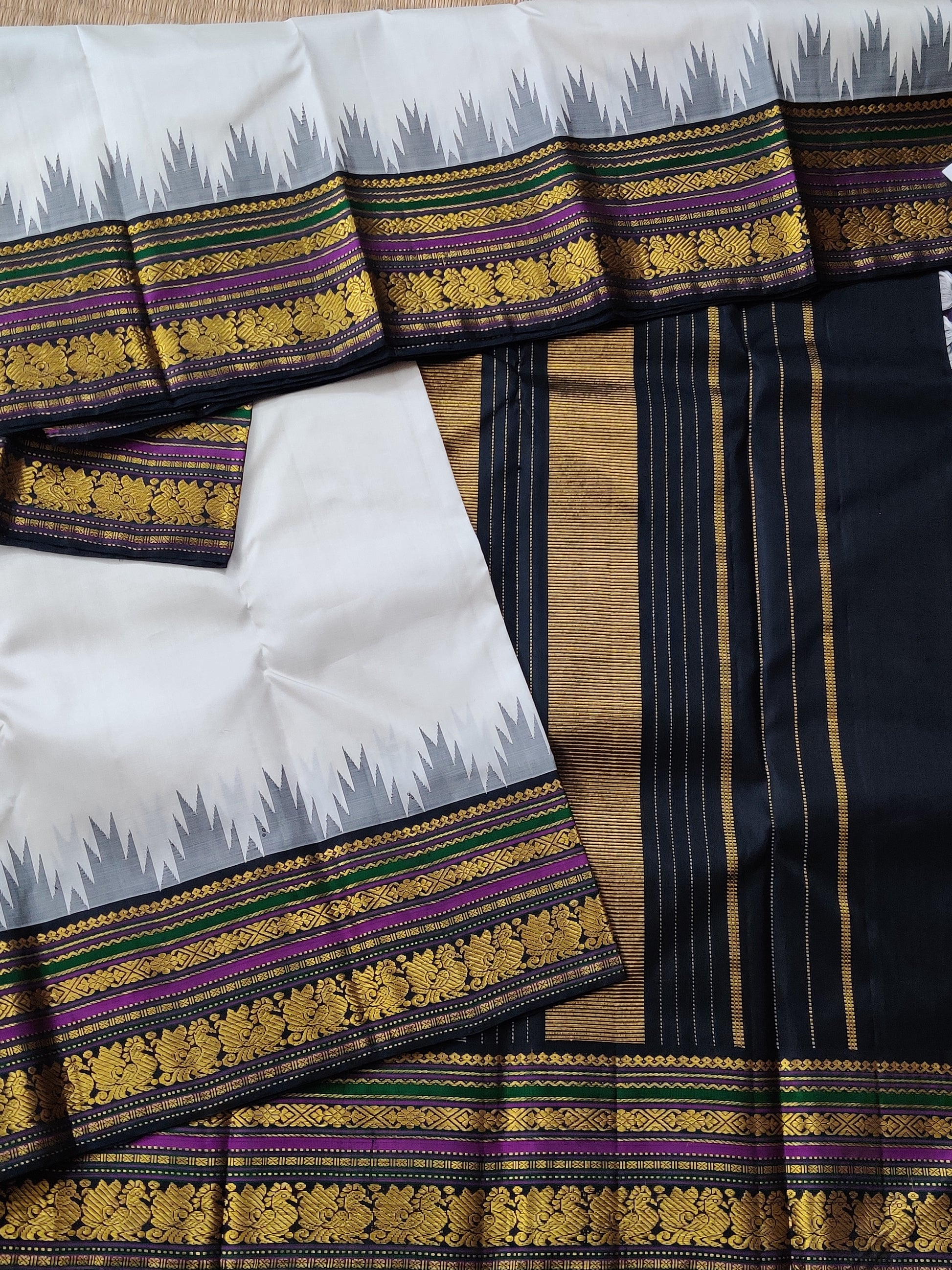Elevate your ethnic wardrobe with this exquisite white Kanchivaram silk saree, a timeless masterpiece crafted from pure silk. The saree features a pristine plain body that exudes understated elegance, beautifully complemented by a striking black zari border that adds dramatic contrast and sophistication. The ornate zari pallu showcases intricate gold threadwork, making it a statement piece for weddings, festivals, and special occasions. Paired with a coordinating plain blouse, this saree offers versatility for various styling preferences. Kanchivaram silk is renowned for its durability, lustrous finish, and rich texture, ensuring this saree remains a cherished heirloom for generations.