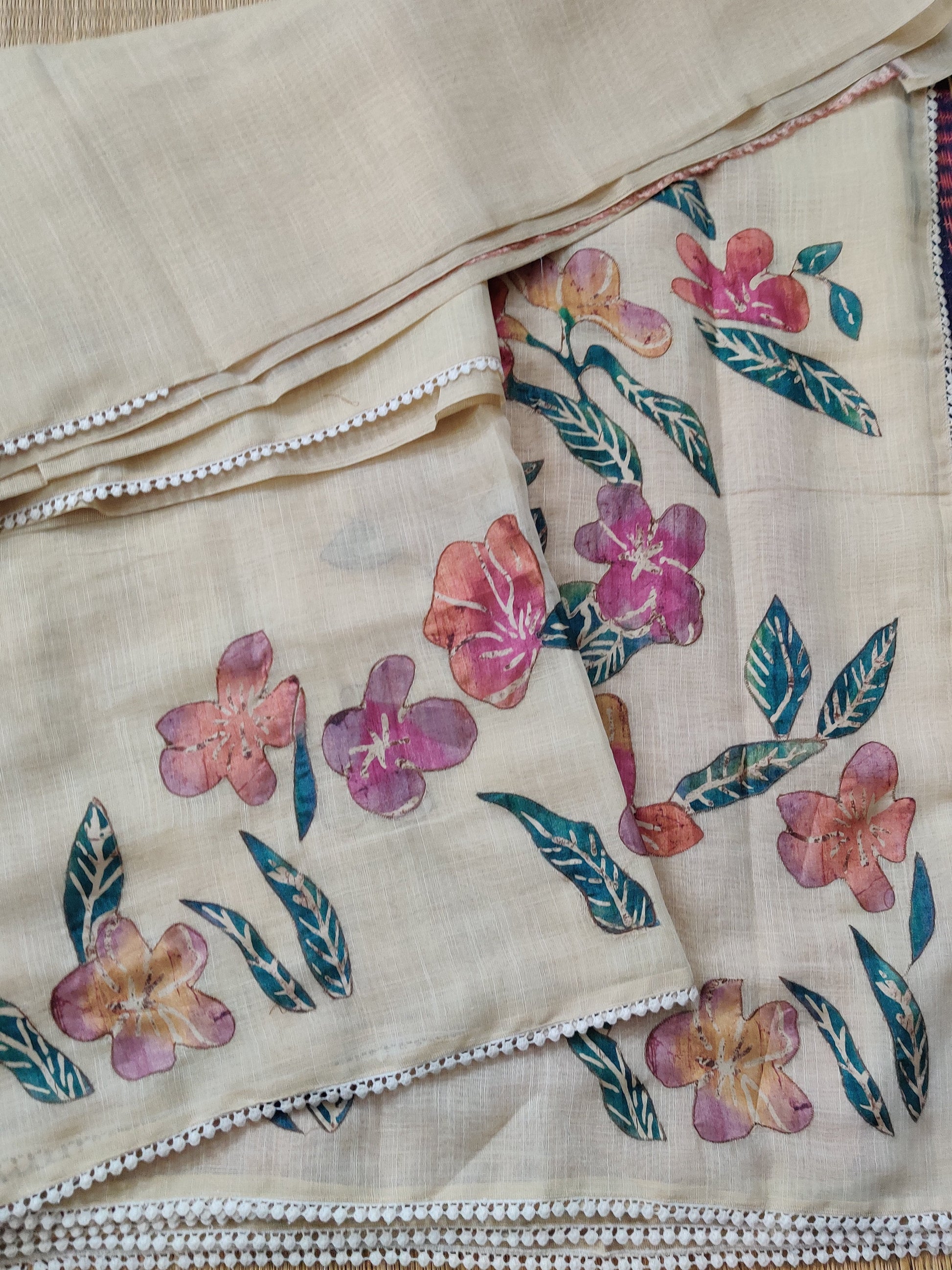 Cream And Brick Colour Linen Saree With Applique Work All Over Code : VB0333