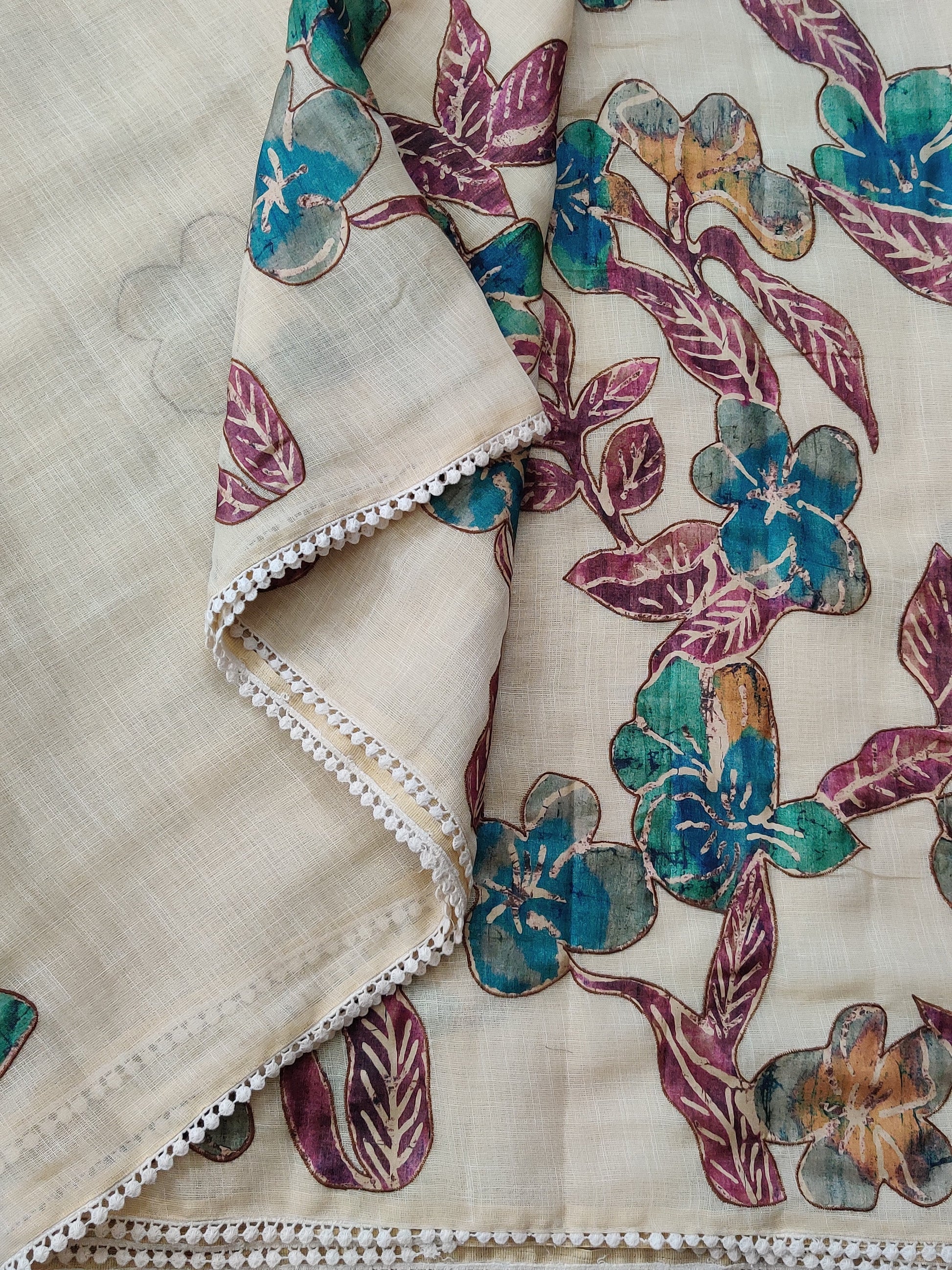 Cream And Green Linen Saree With Applique Work All Over Code : VB0334