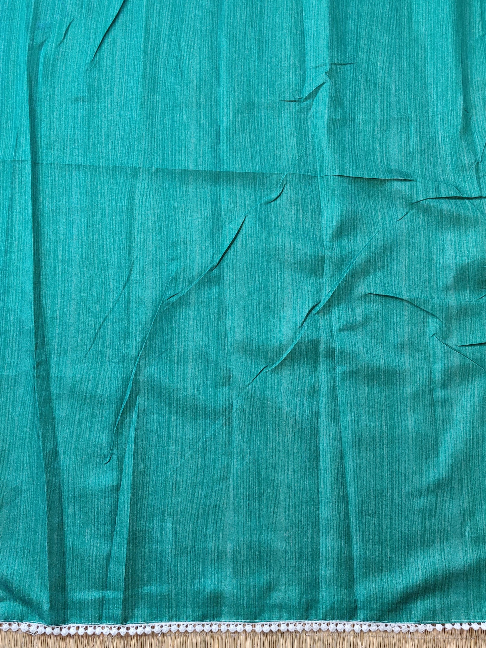 Elevate your ethnic wardrobe with this stunning cream and green linen saree, a masterpiece of traditional craftsmanship. Intricate applique work adorns the entire fabric, creating a captivating interplay of textures and patterns that showcase meticulous artistry. The natural breathability of linen ensures comfort throughout the day, while the rich green hue provides striking contrast against the cream base. Paired with a coordinating green blouse, this saree seamlessly transitions from festive occasions to cultural celebrations. Perfect for those who appreciate refined elegance and handcrafted details.