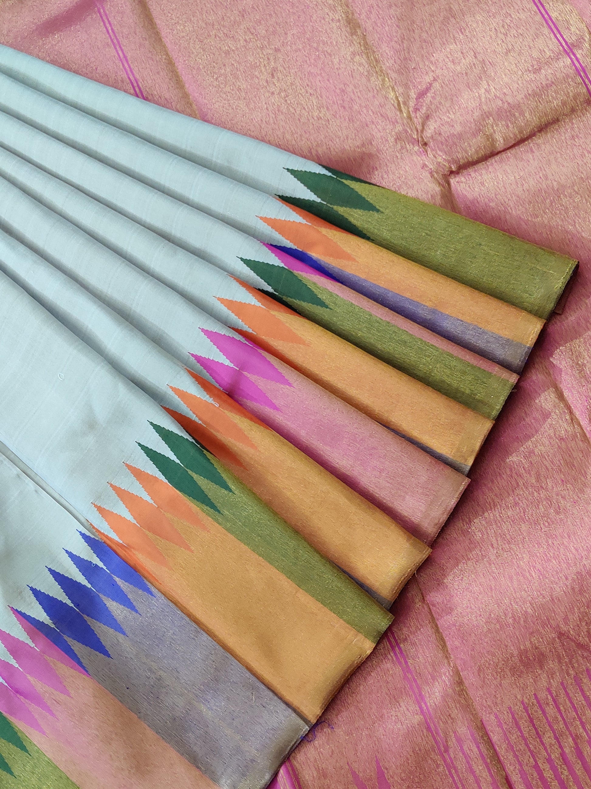 Experience timeless elegance with this cream-coloured Kanchivaram silk saree, featuring a smooth plain body that highlights its luxurious texture. Accentuated by a vibrant multi-colour zari border and a richly woven zari pallu, it blends subtlety with exquisite craftsmanship. Paired with a plain blouse, this saree offers a classic and versatile look perfect for formal occasions and traditional events.