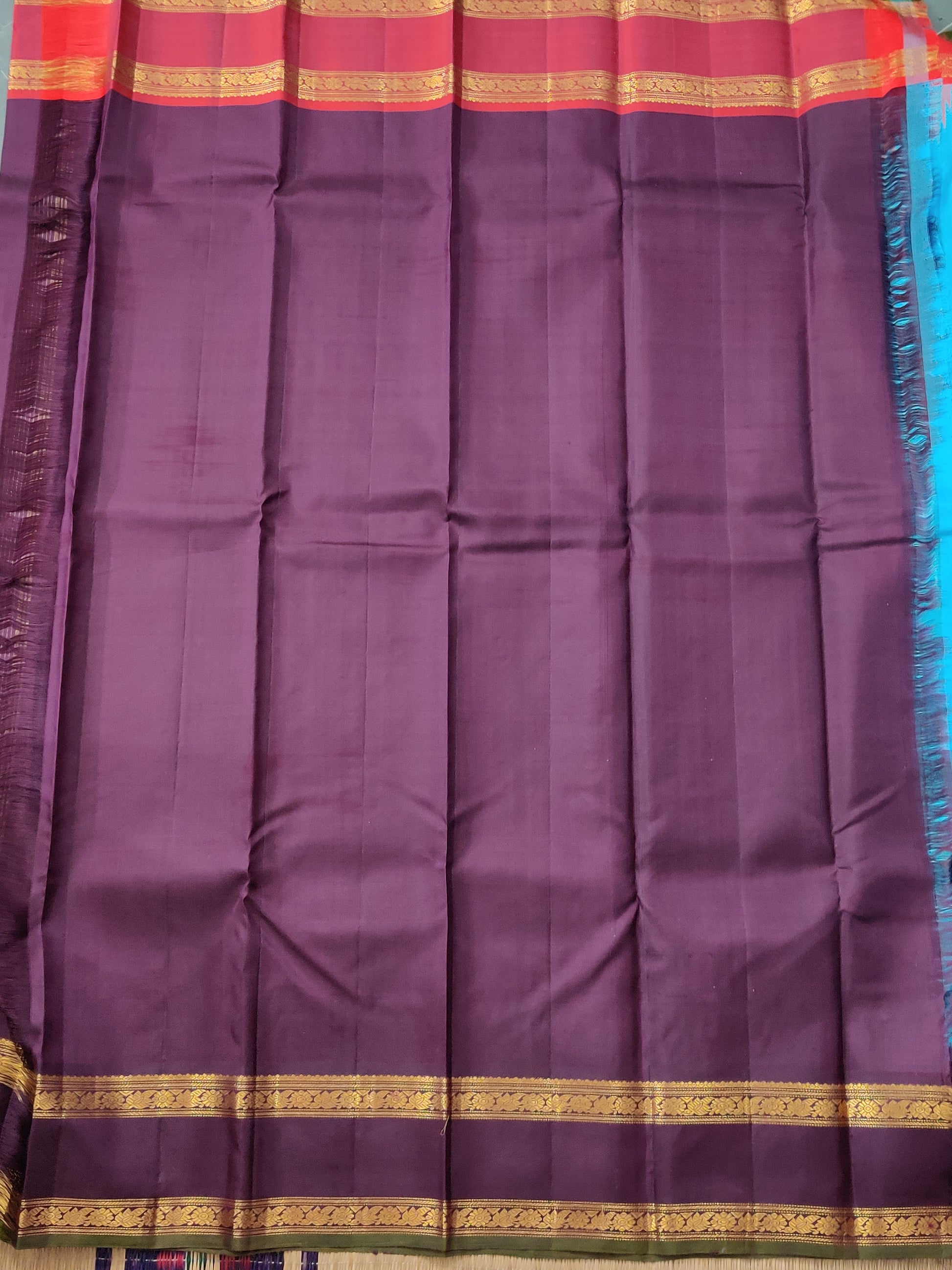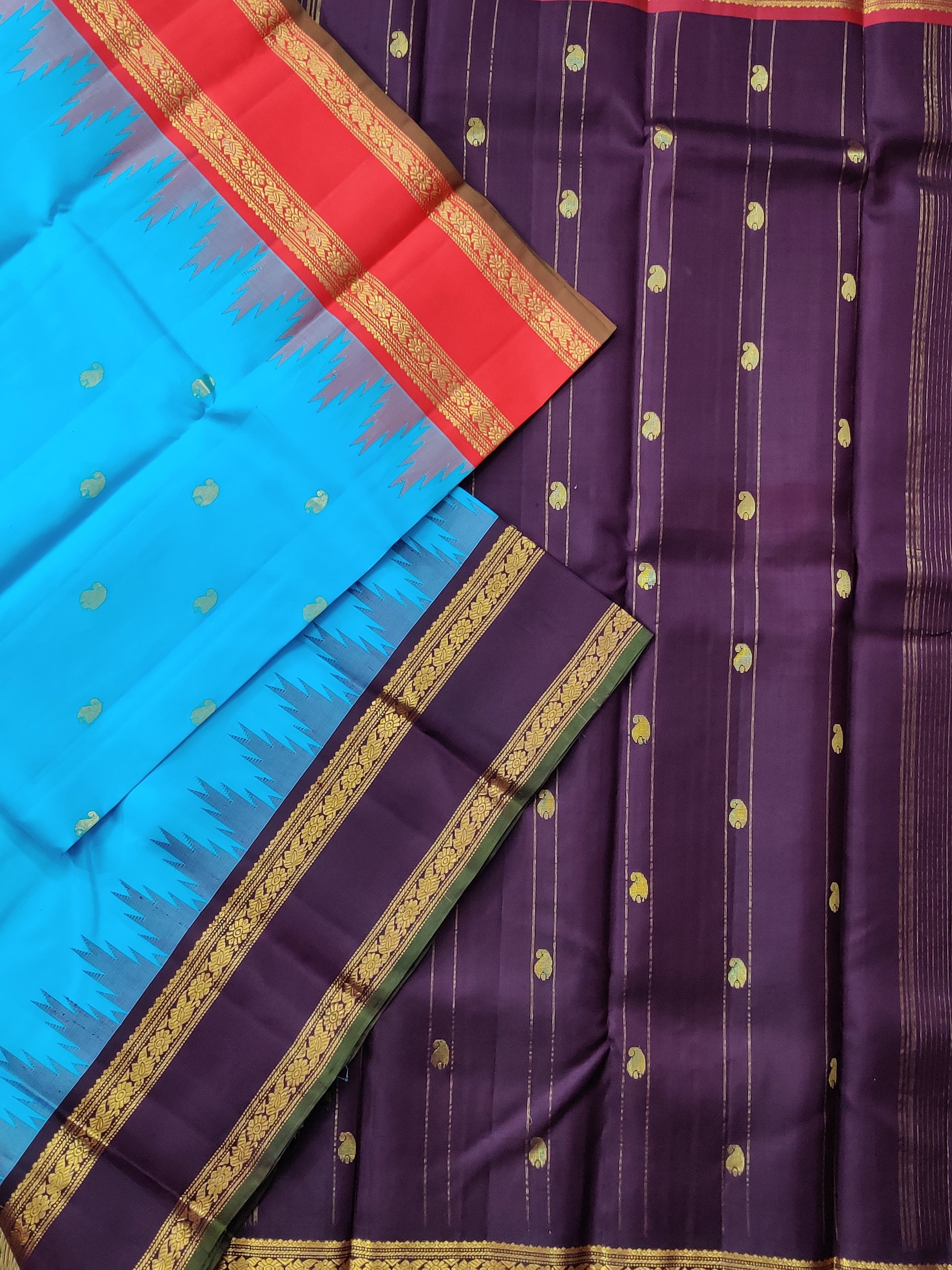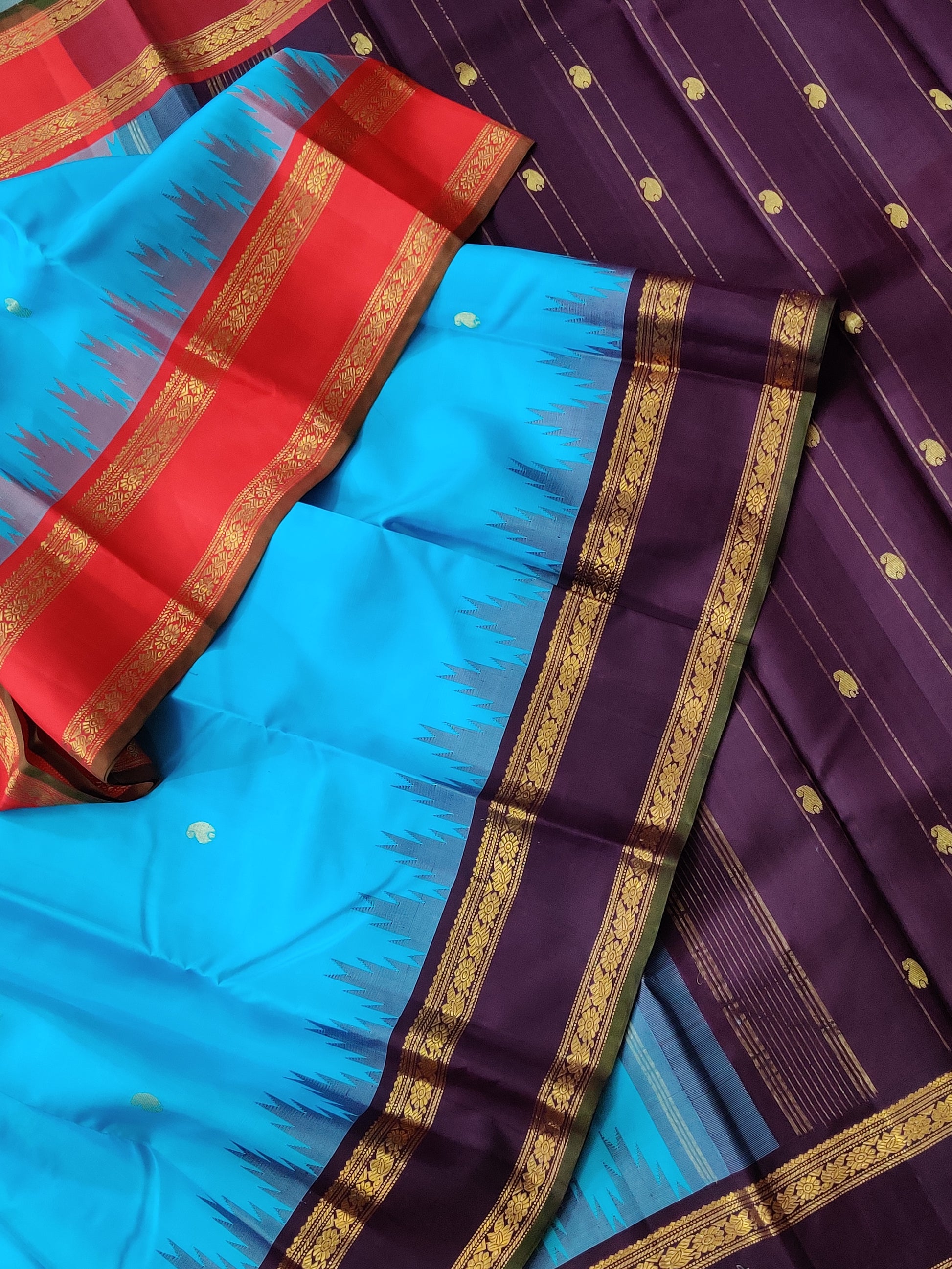 Elevate your ethnic wardrobe with this exquisite sky blue Kanchivaram silk saree, a timeless masterpiece crafted from pure silk. The saree features intricate zari butta work scattered across the entire body, creating a sophisticated and refined aesthetic. The distinctive Ganga-Jamuna border adds traditional elegance, while the brown zari pallu provides a striking contrast that enhances the overall design. Paired with a plain blouse, this saree offers versatility for both festive occasions and special celebrations. The lustrous silk fabric drapes beautifully, ensuring comfort and grace with every wear. Perfect for those who appreciate authentic South Indian weaving traditions and timeless style.