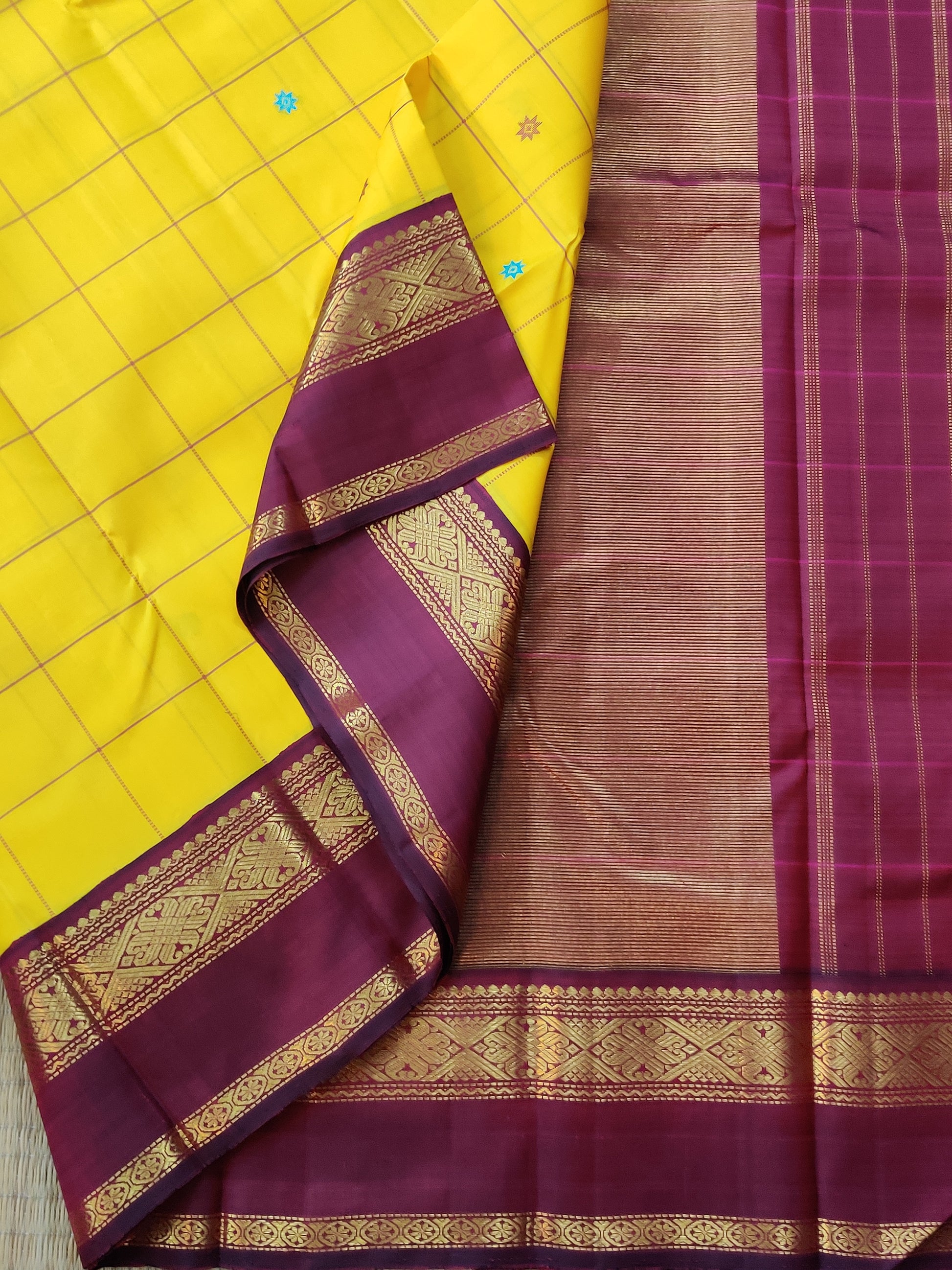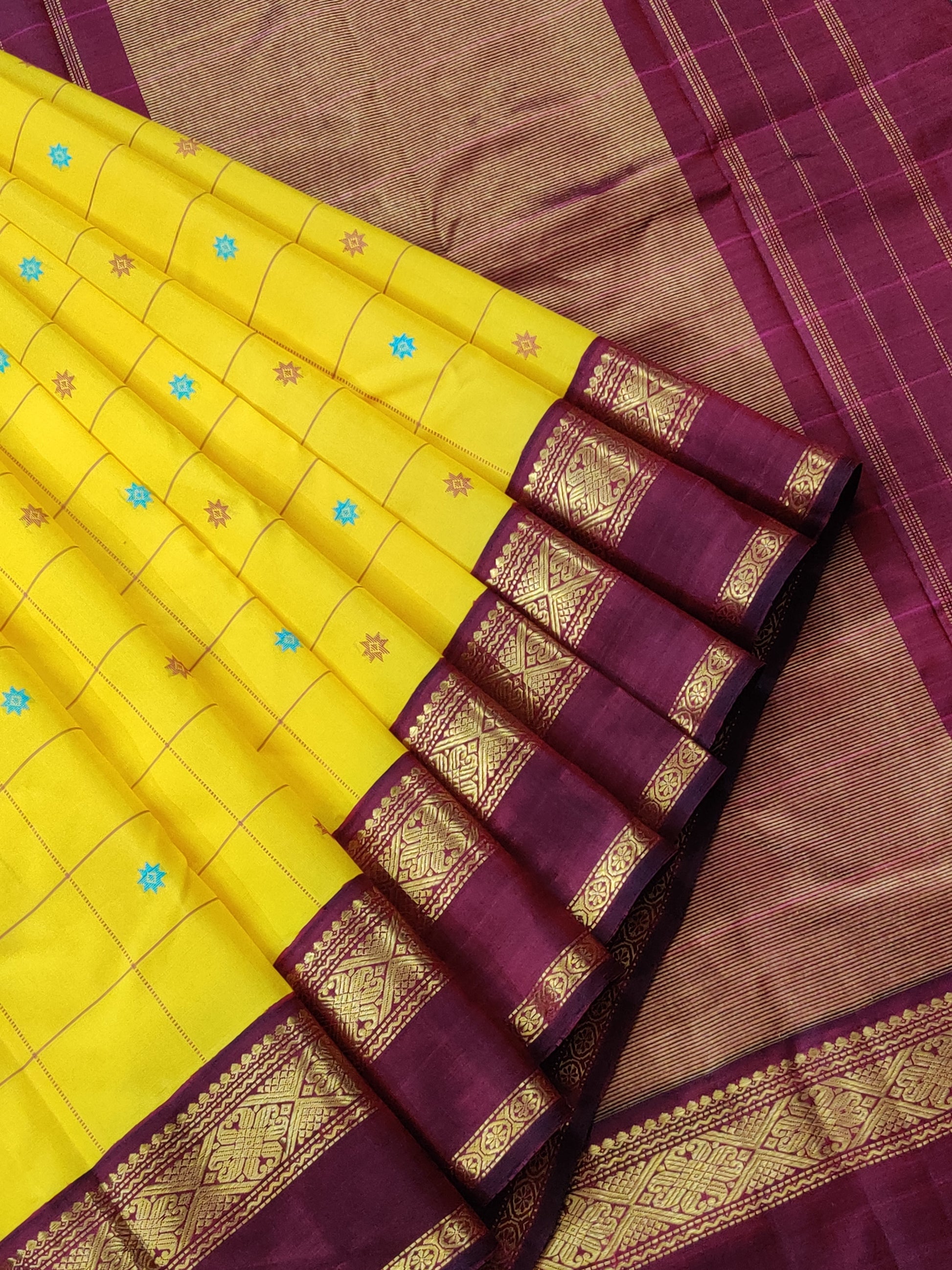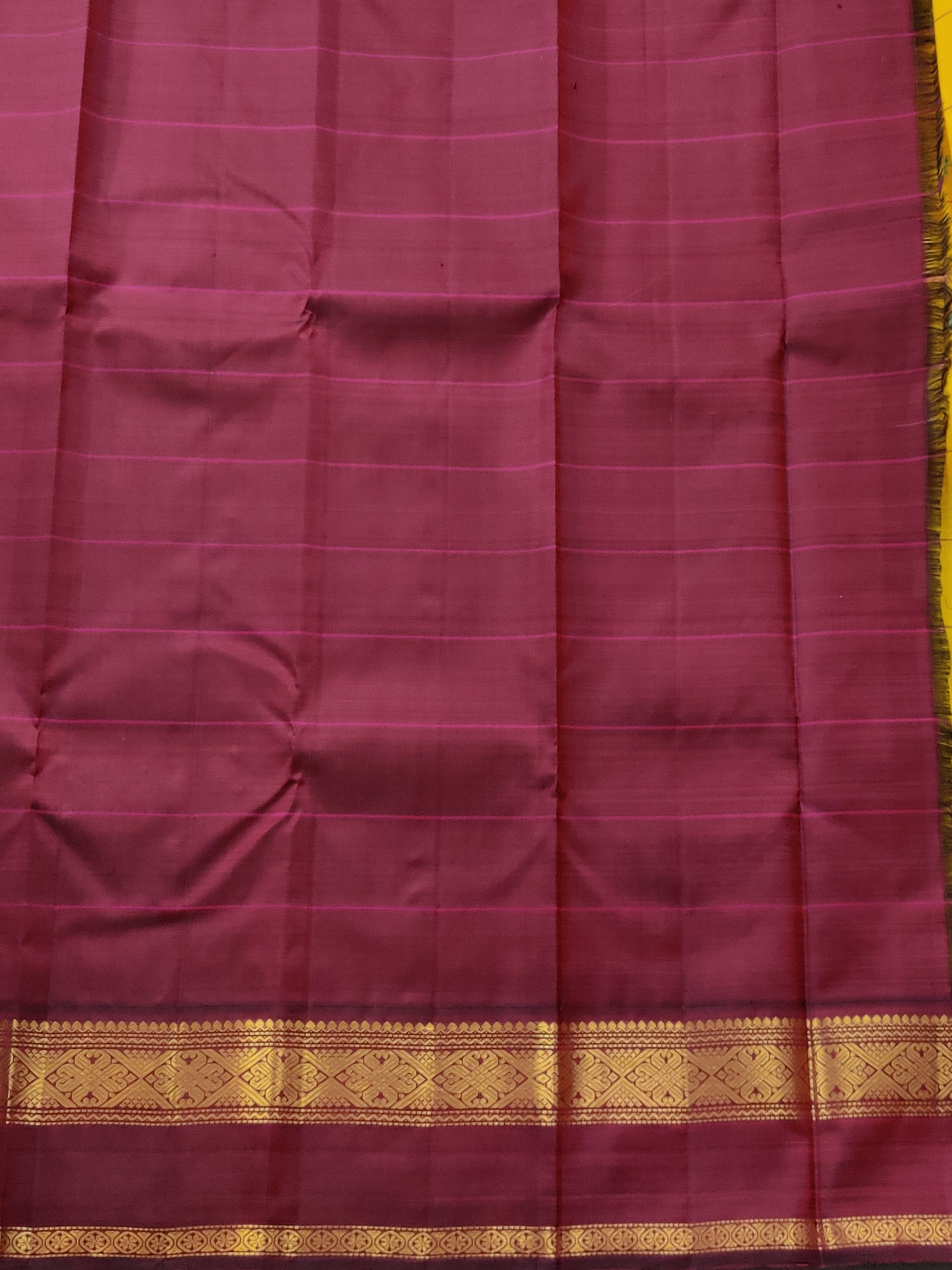 Elevate your ethnic wardrobe with this stunning yellow Kanchivaram silk saree, a masterpiece of traditional South Indian weaving. The lustrous silk body features intricate thread-woven motifs that showcase exceptional craftsmanship, while the striking maroon zari border and ornate zari pallu add regal contrast and grandeur. Paired with a coordinating plain blouse, this saree seamlessly transitions from festive occasions to cultural celebrations. The authentic Kanchivaram silk ensures durability and a luxurious drape that flatters every silhouette. Perfect for those who appreciate timeless elegance and heritage textiles.
