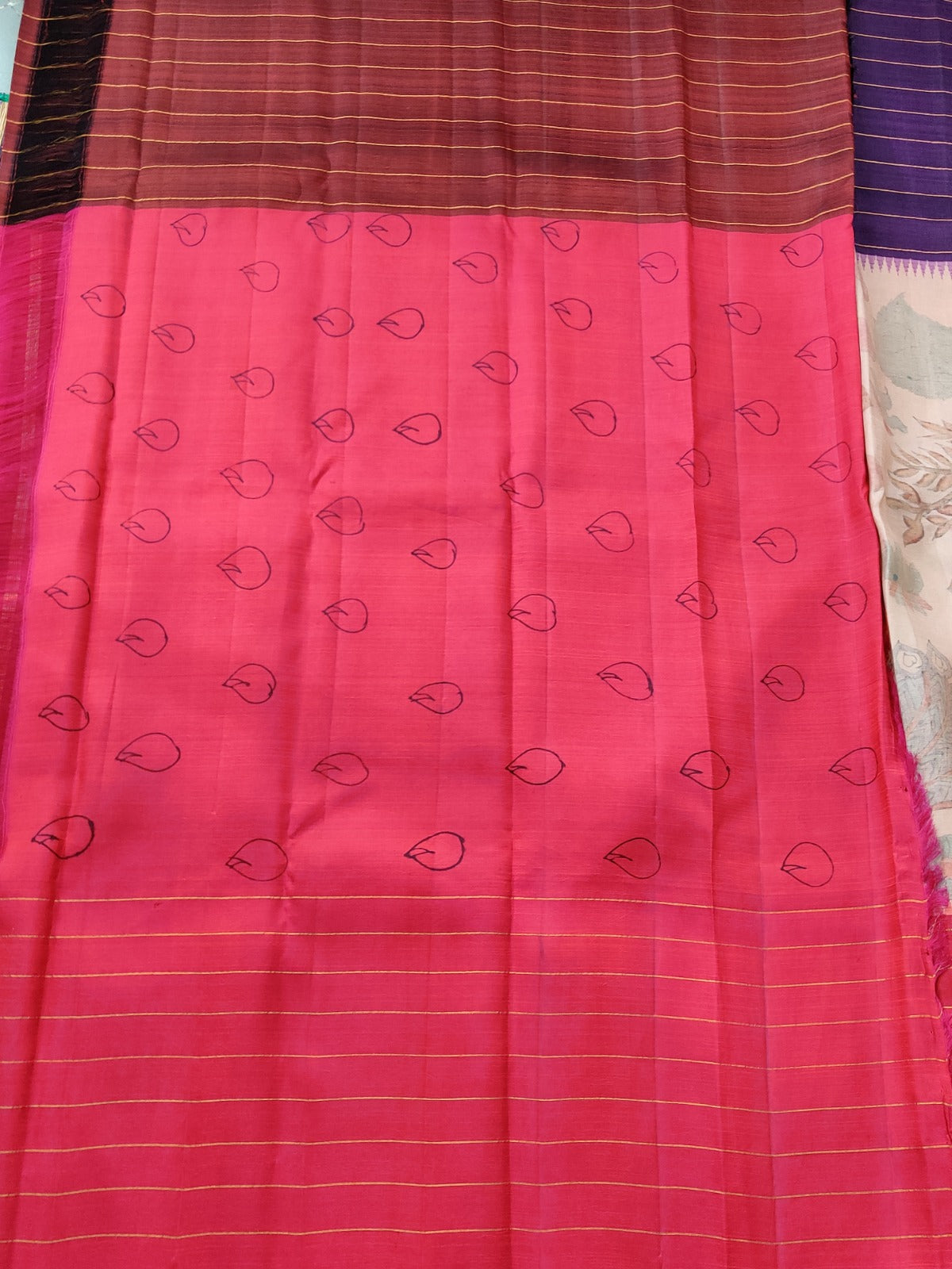 Elevate your traditional wardrobe with this exquisite cream Kanchivaram silk saree, a masterpiece of South Indian weaving heritage. The entire fabric showcases intricate pen kalamkari work in captivating pink and purple hues, creating a mesmerizing artistic narrative across the drape. The saree is finished with a stunning Ganga-Jamuna zari border that adds regal contrast and dimension. Paired with a coordinating pink blouse piece, this saree seamlessly transitions from festive celebrations to special occasions. Crafted from pure Kanchivaram silk, it promises durability, lustrous sheen, and the authentic charm that discerning silk connoisseurs appreciate. A timeless investment piece that honors traditional craftsmanship.