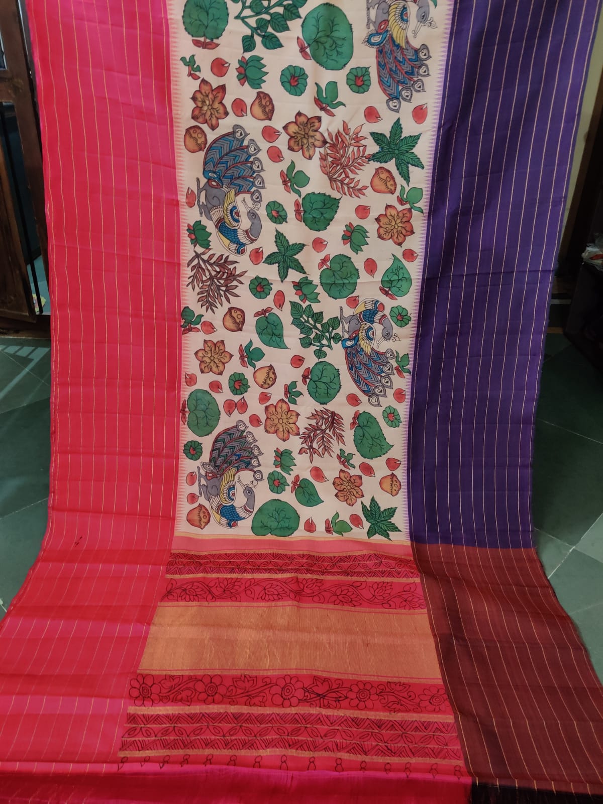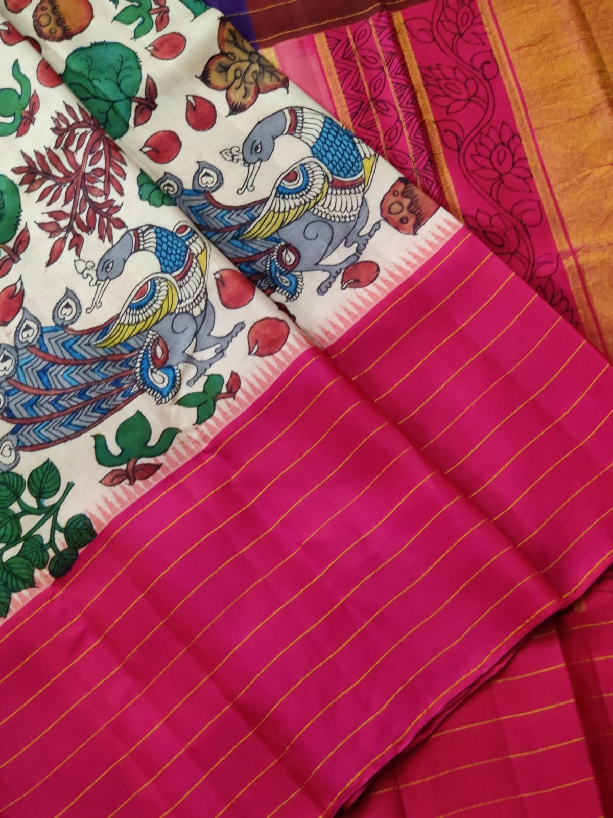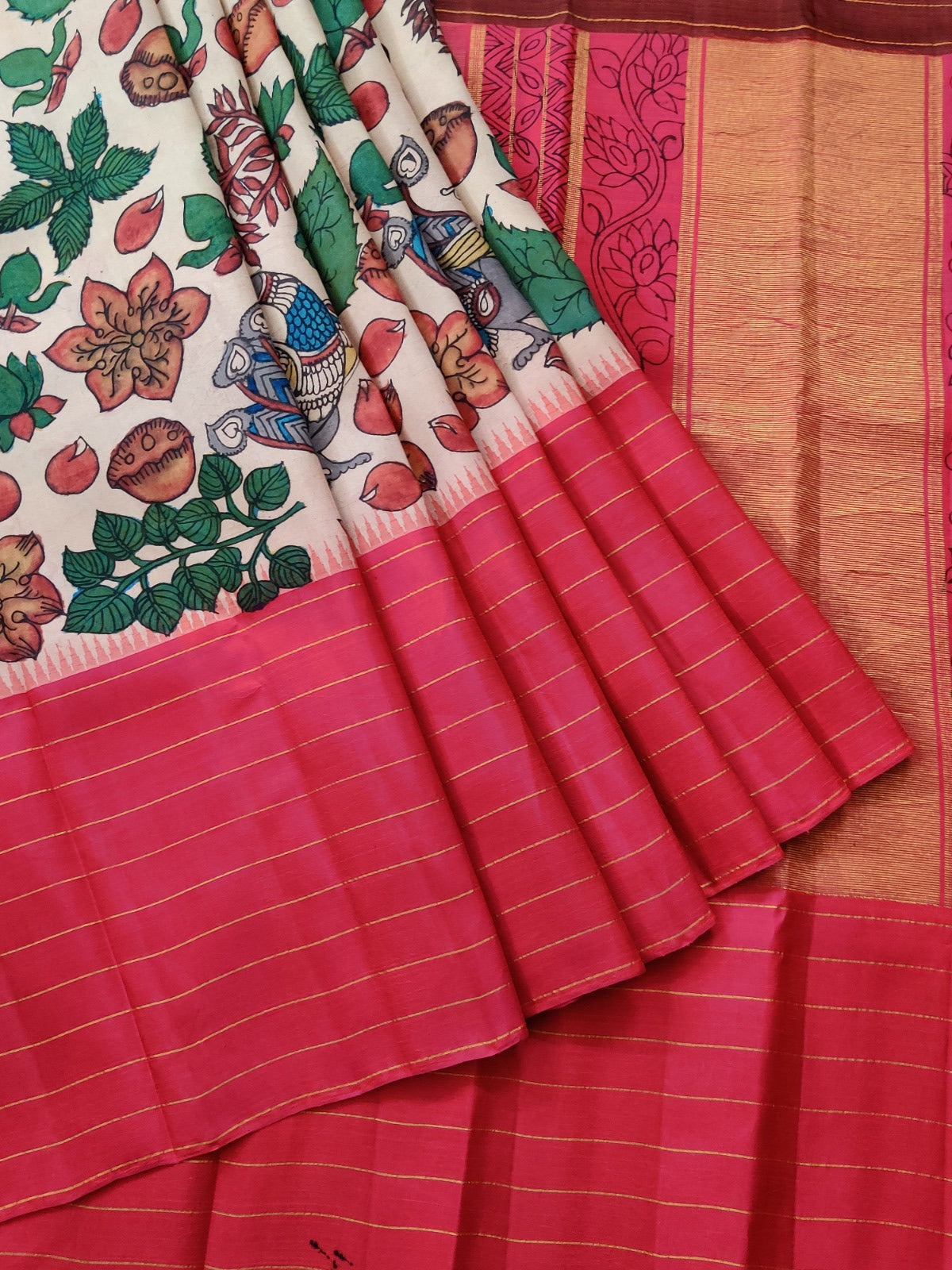 Cream Colour Kanchivaram Silk Saree With Pen Kalamkari Work All Over Code : KA0313