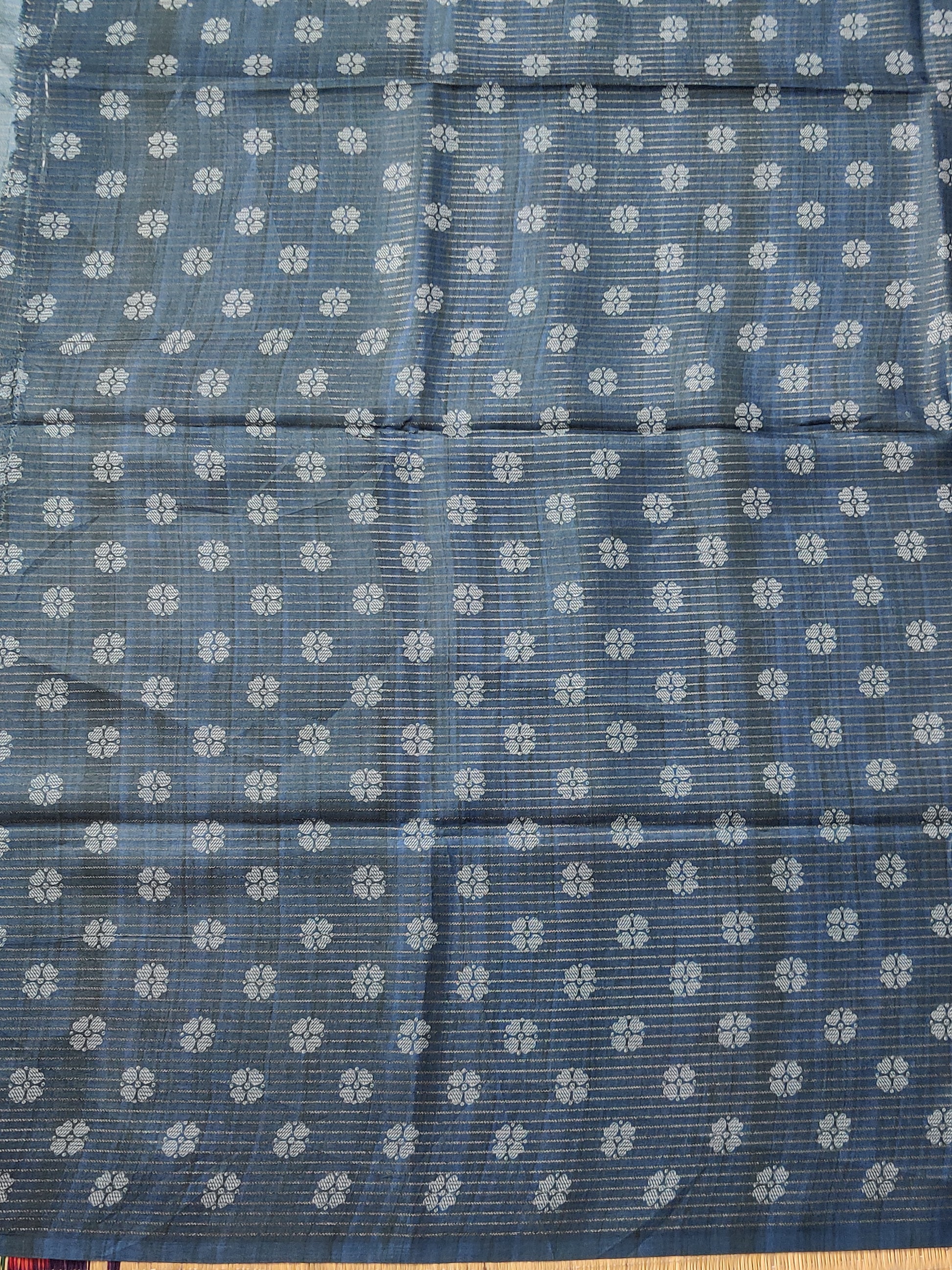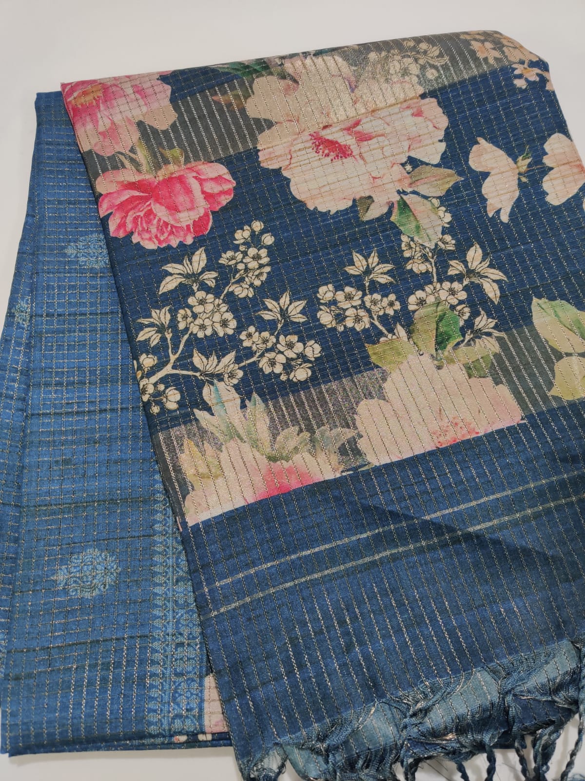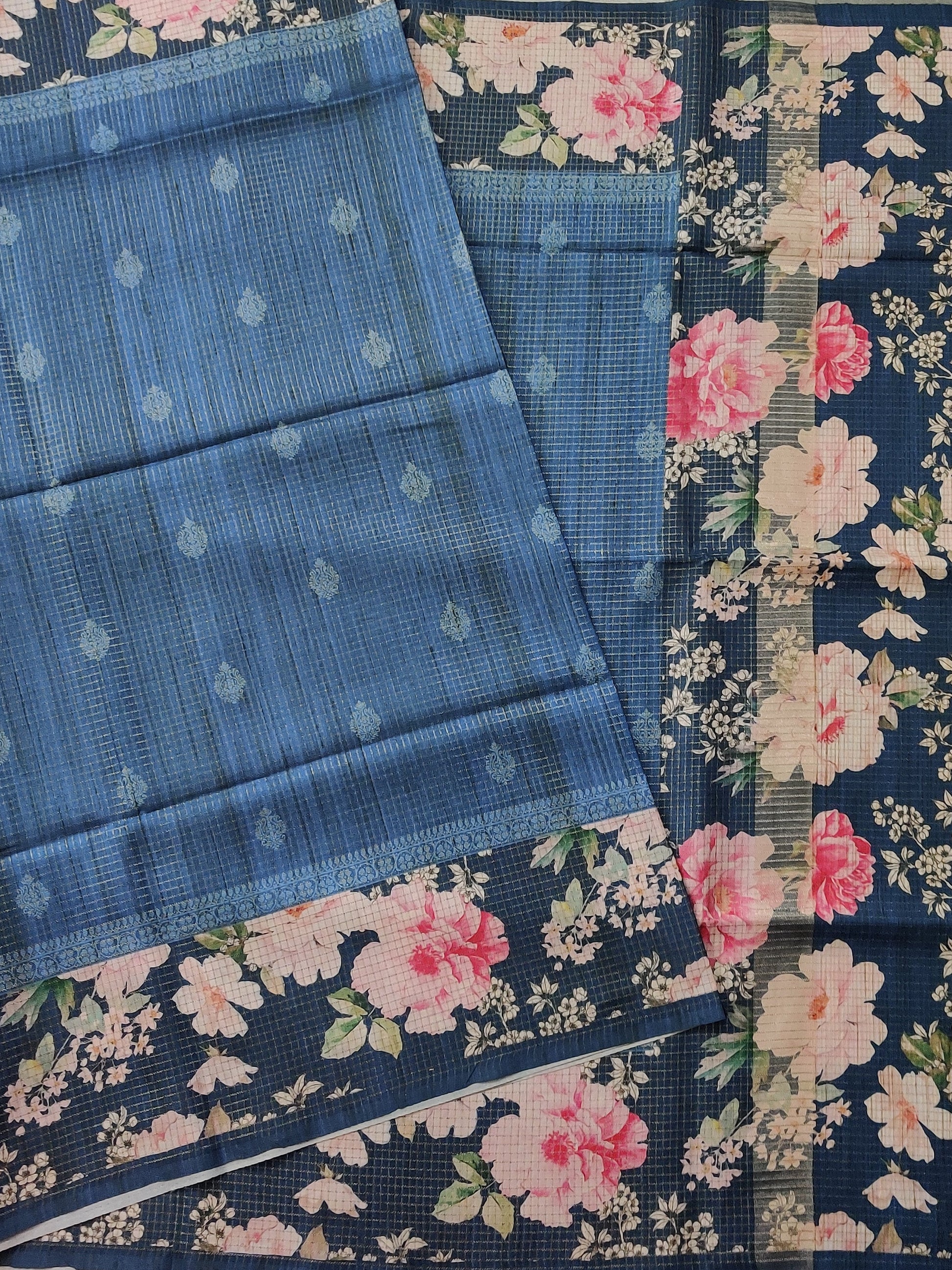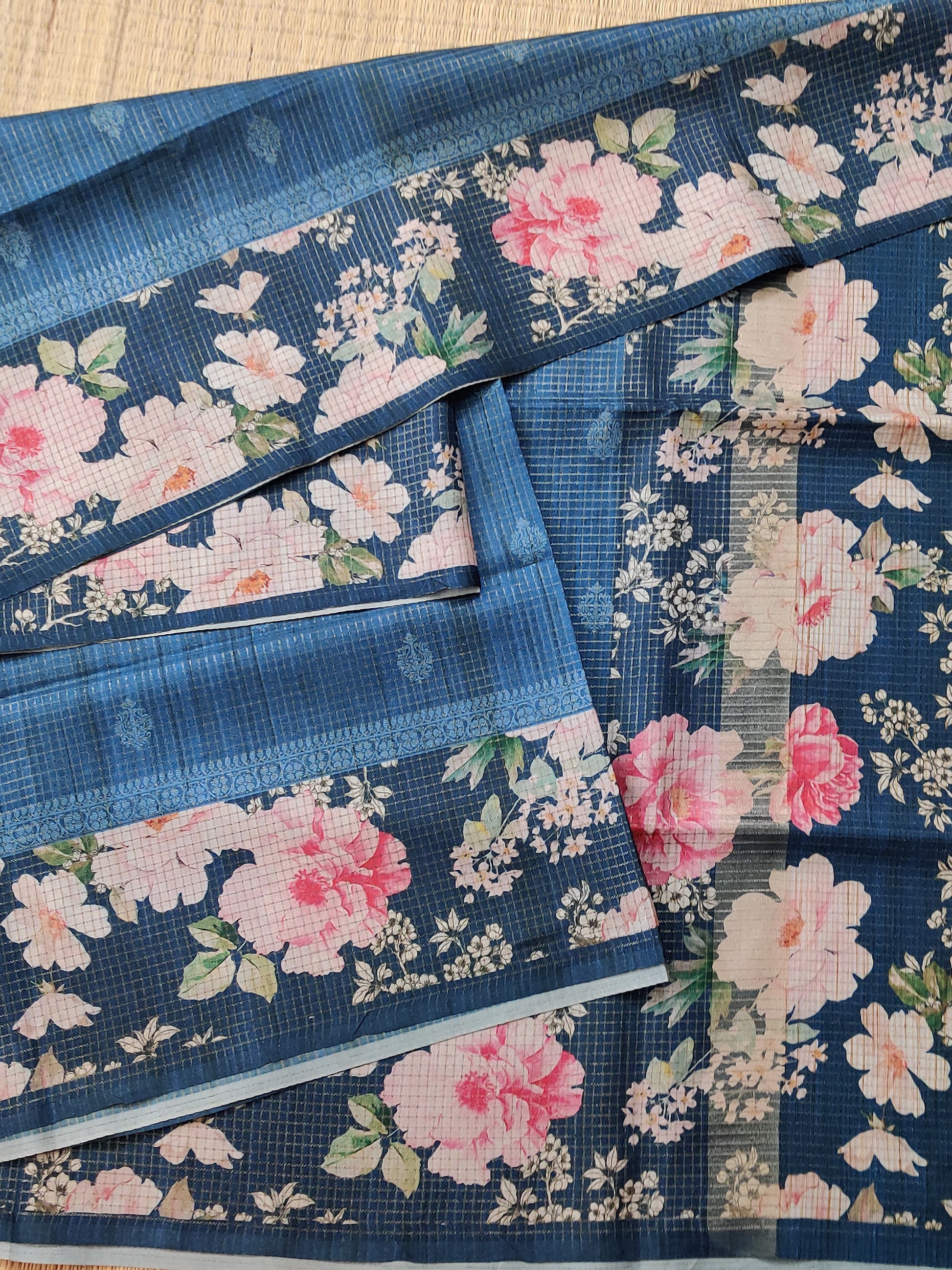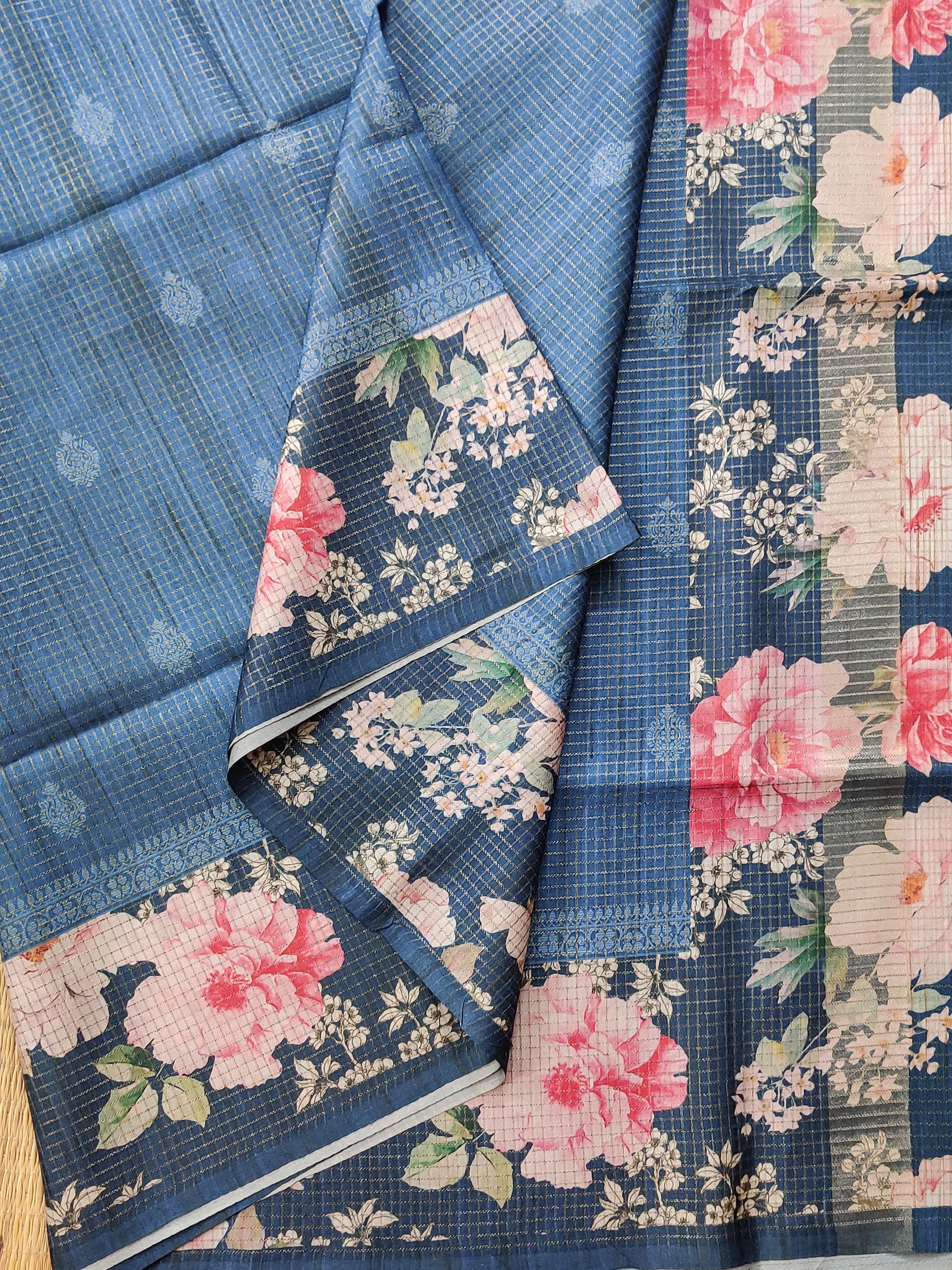 This semi Banarasi saree in peacock blue showcases exquisite zari motifs that celebrate age-old weaving artistry. The floral digital print along the border and pallu introduces a modern elegance, perfectly balancing tradition with contemporary style. Completing the ensemble, the matching self-colour blouse enhances its sophisticated appeal, making it an ideal choice for festive celebrations and formal gatherings.