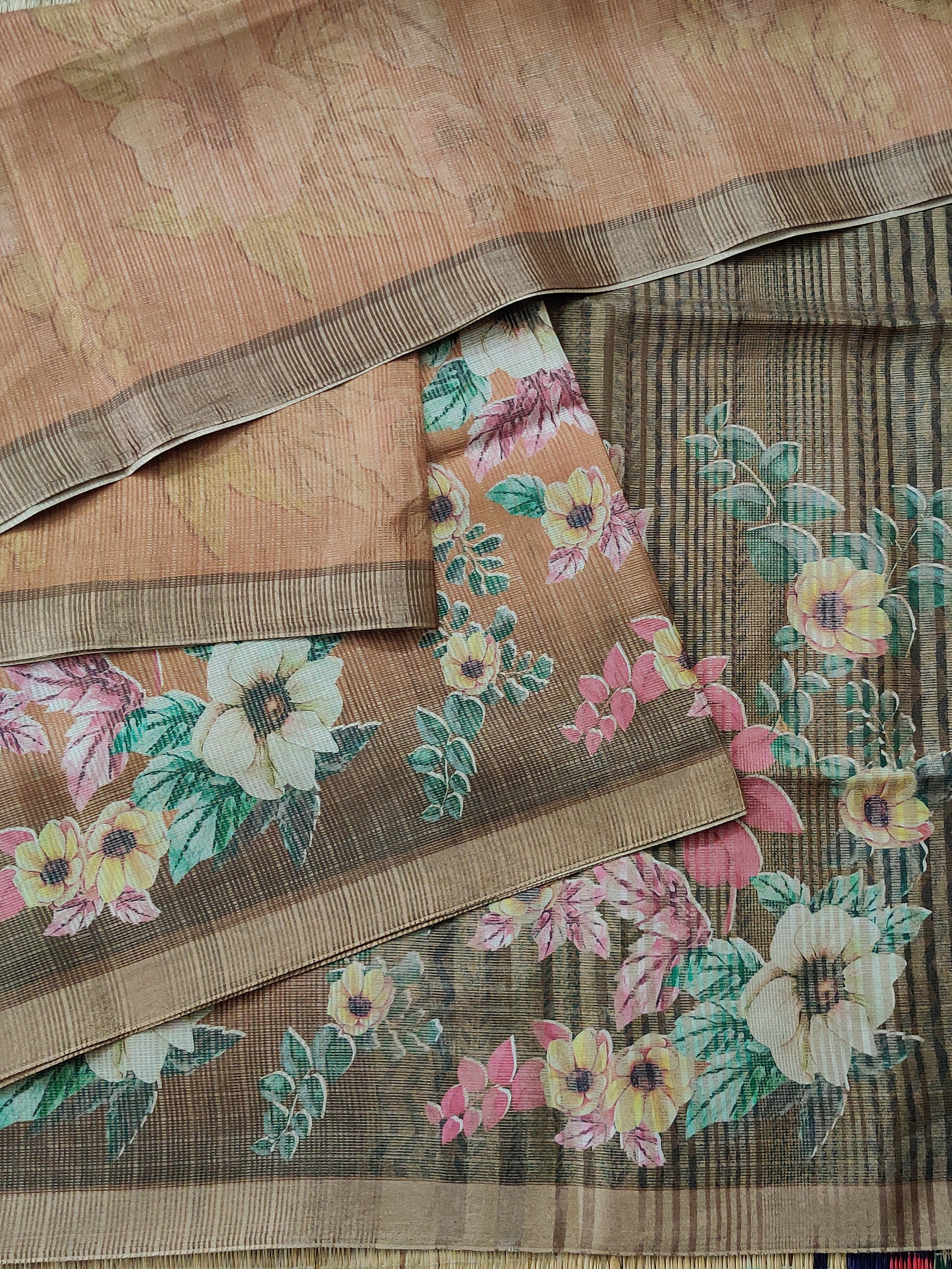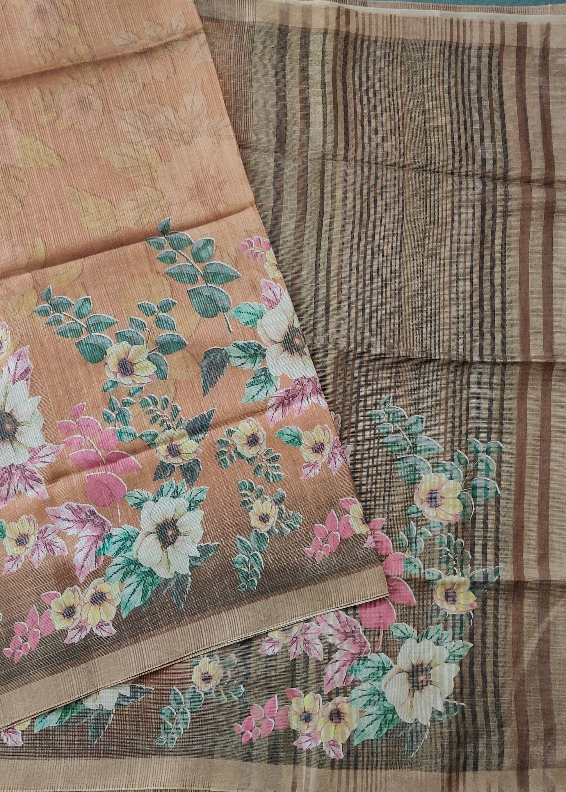 Light Orange Semi-Banarasi Saree This light orange semi-banarasi saree seamlessly blends traditional craftsmanship with contemporary design. The digitally printed body showcases intricate motifs rendered with precision, while ornate zari borders and an elaborate zari pallu add layers of sophistication. Woven with the luxurious appeal characteristic of banarasi textiles, it offers the refined aesthetic discerning wearers seek without the weight of pure banarasi silk. The accompanying printed blouse ensures styling versatility across weddings, festivals, and formal celebrations. A thoughtfully crafted piece that honors textile heritage while accommodating modern sensibilities—ideal for those who value both tradition and contemporary elegance.