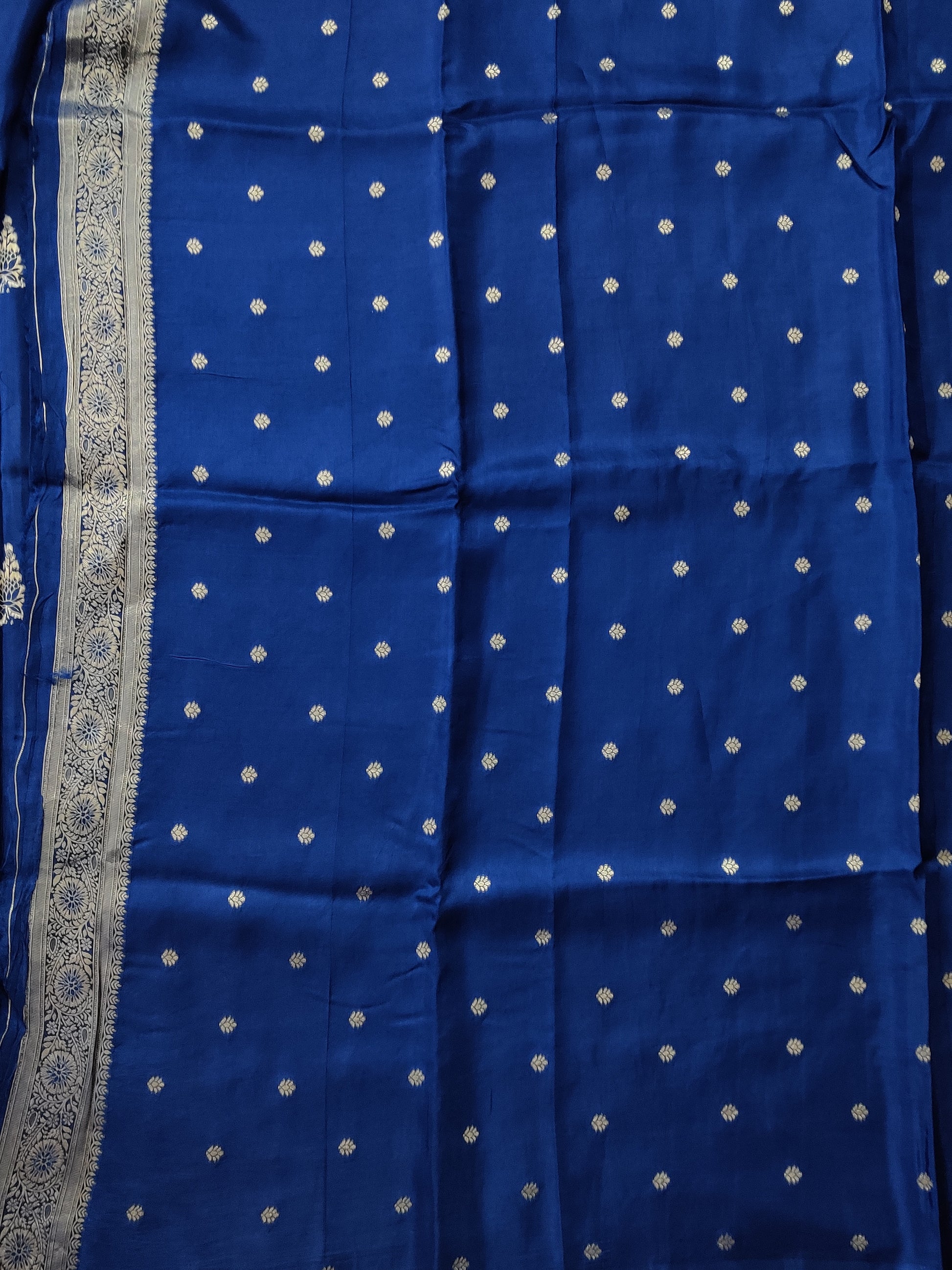 Elevate your ethnic wardrobe with this sophisticated navy blue semi-mashru saree, a masterpiece of traditional craftsmanship. The fabric showcases intricate floral zari buttas scattered across the entire drape, creating an elegant visual rhythm. A lustrous zari border frames the saree beautifully, while the ornate zari pallu serves as a striking focal point. The coordinating butta blouse completes the ensemble seamlessly. Semi-mashru's signature blend of silk and cotton offers comfort without compromising on opulence, making this saree ideal for festive occasions, celebrations, and formal gatherings. A timeless investment piece that combines heritage artistry with contemporary sensibility.