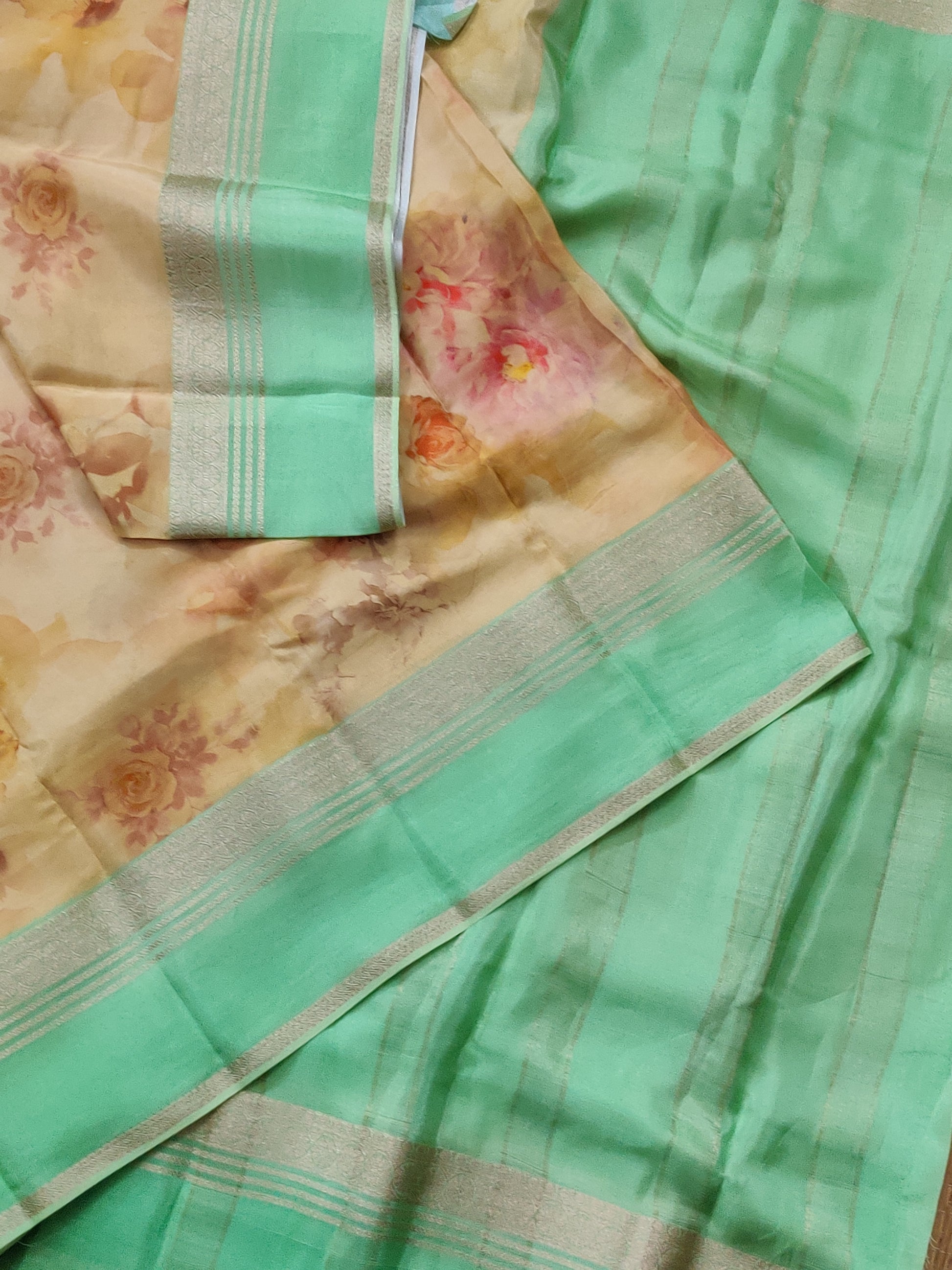 Elevate your ethnic wardrobe with this stunning lemon yellow semi-Mysore crepe silk saree, featuring an intricate digital floral print that adorns the entire fabric. The saree is complemented by a sophisticated light pastel green border and zari pallu, creating a harmonious contrast that enhances its visual appeal. The crepe silk construction offers a graceful drape and comfortable wear for extended periods. Paired with a plain blouse, this versatile piece transitions seamlessly from festive occasions to formal gatherings, making it an essential addition to your traditional collection.