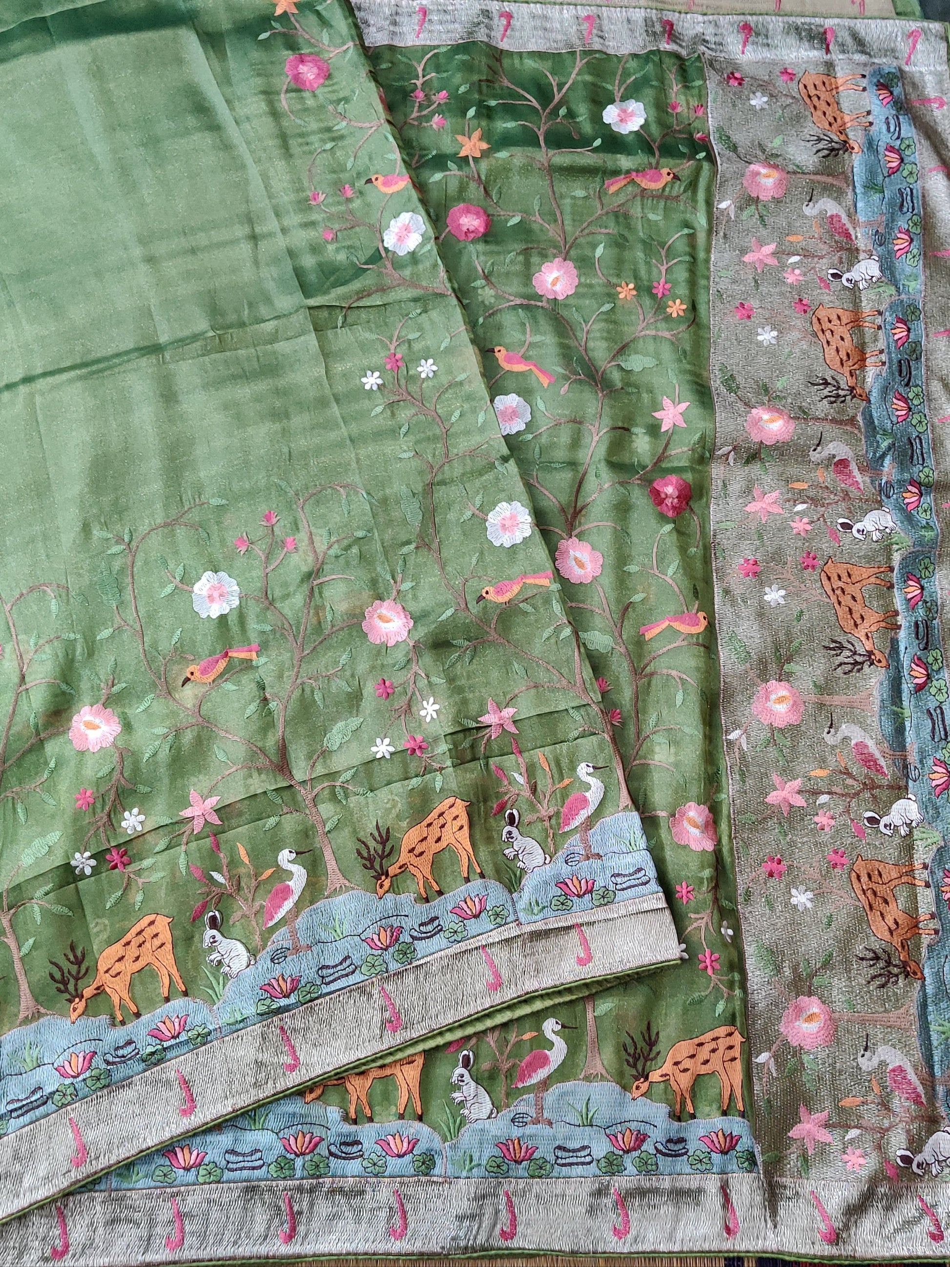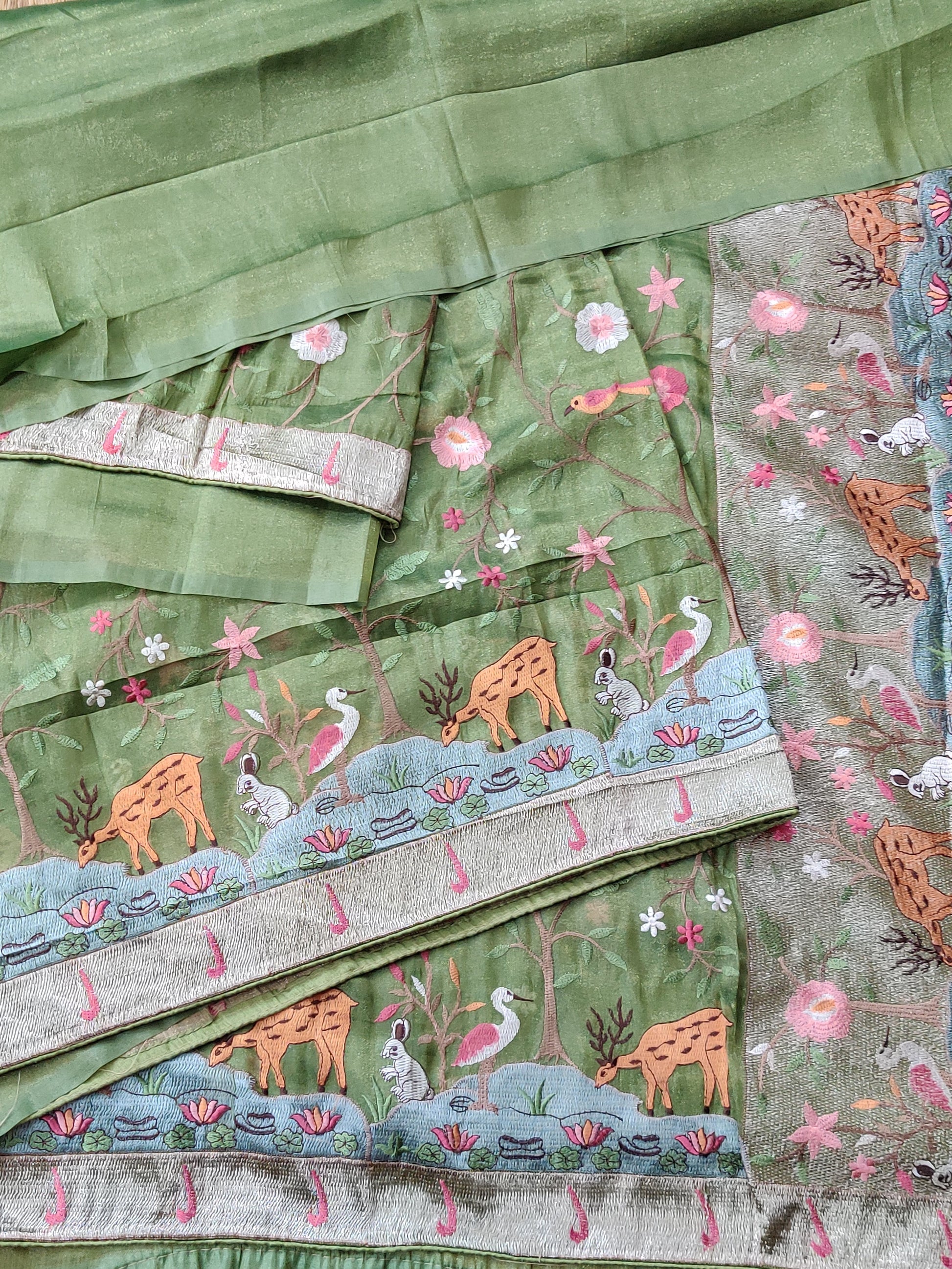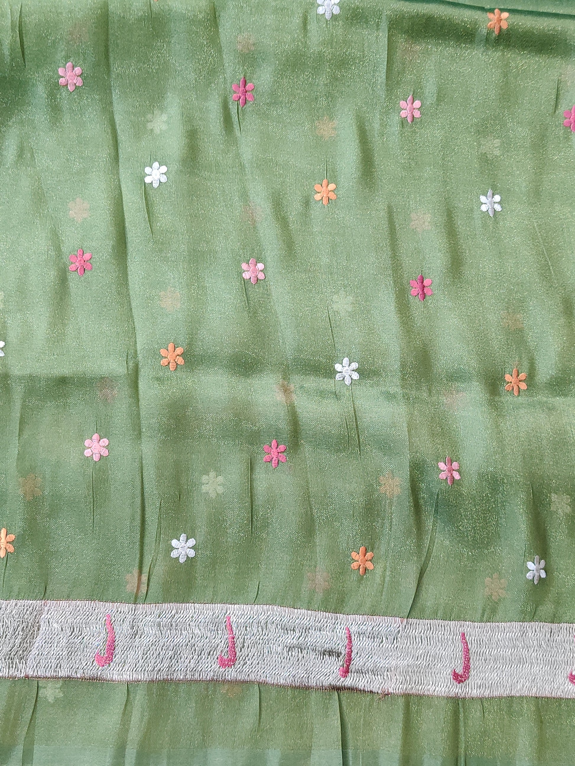 Green Colour Semi Tissue Saree With Vanasingaram Embroidery Body Code : VB0148