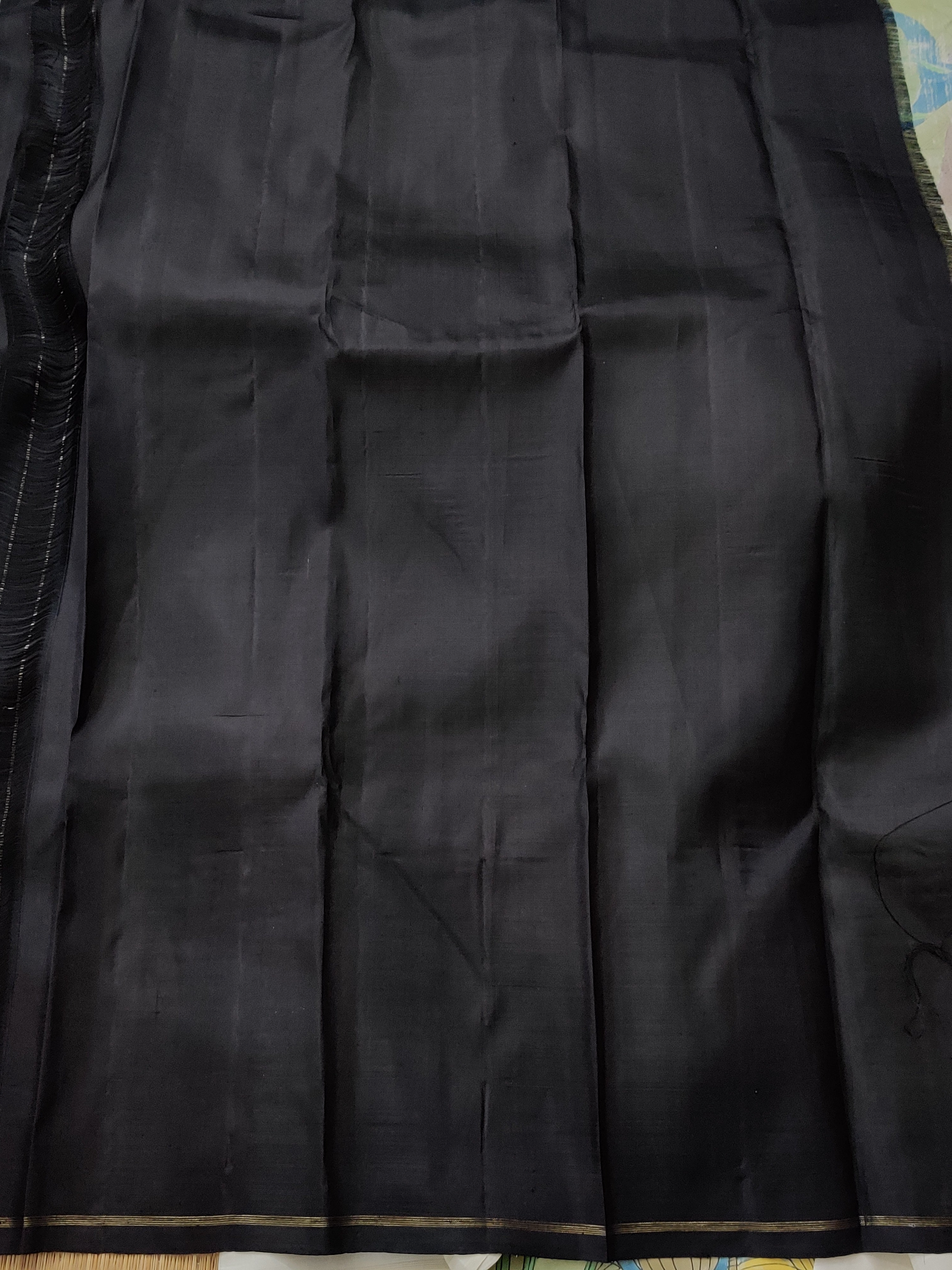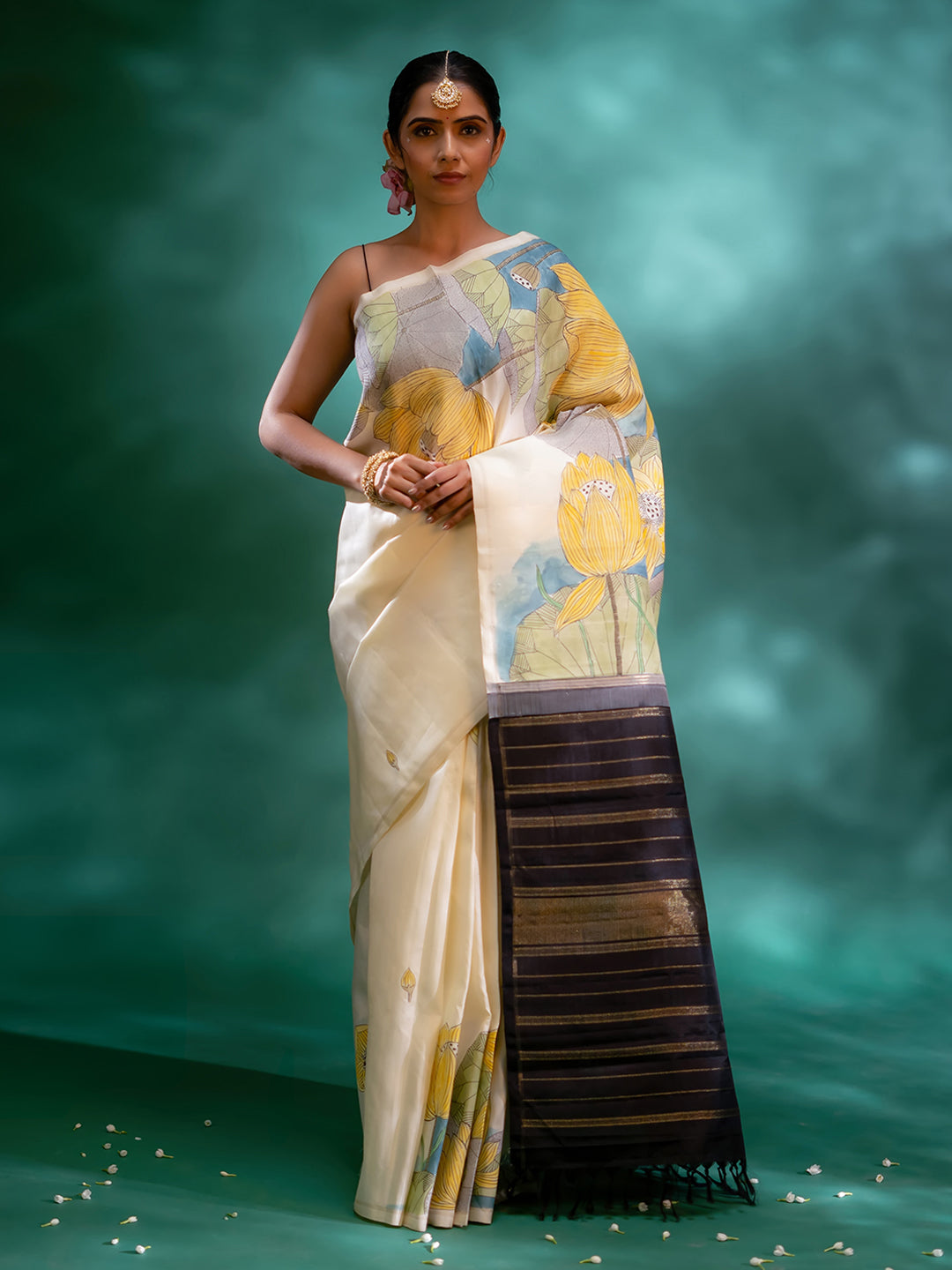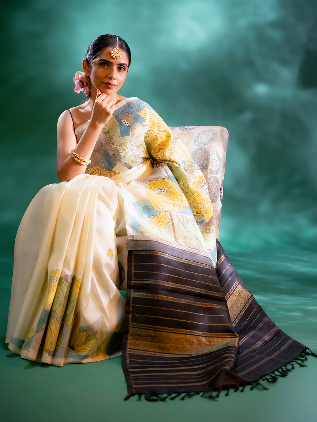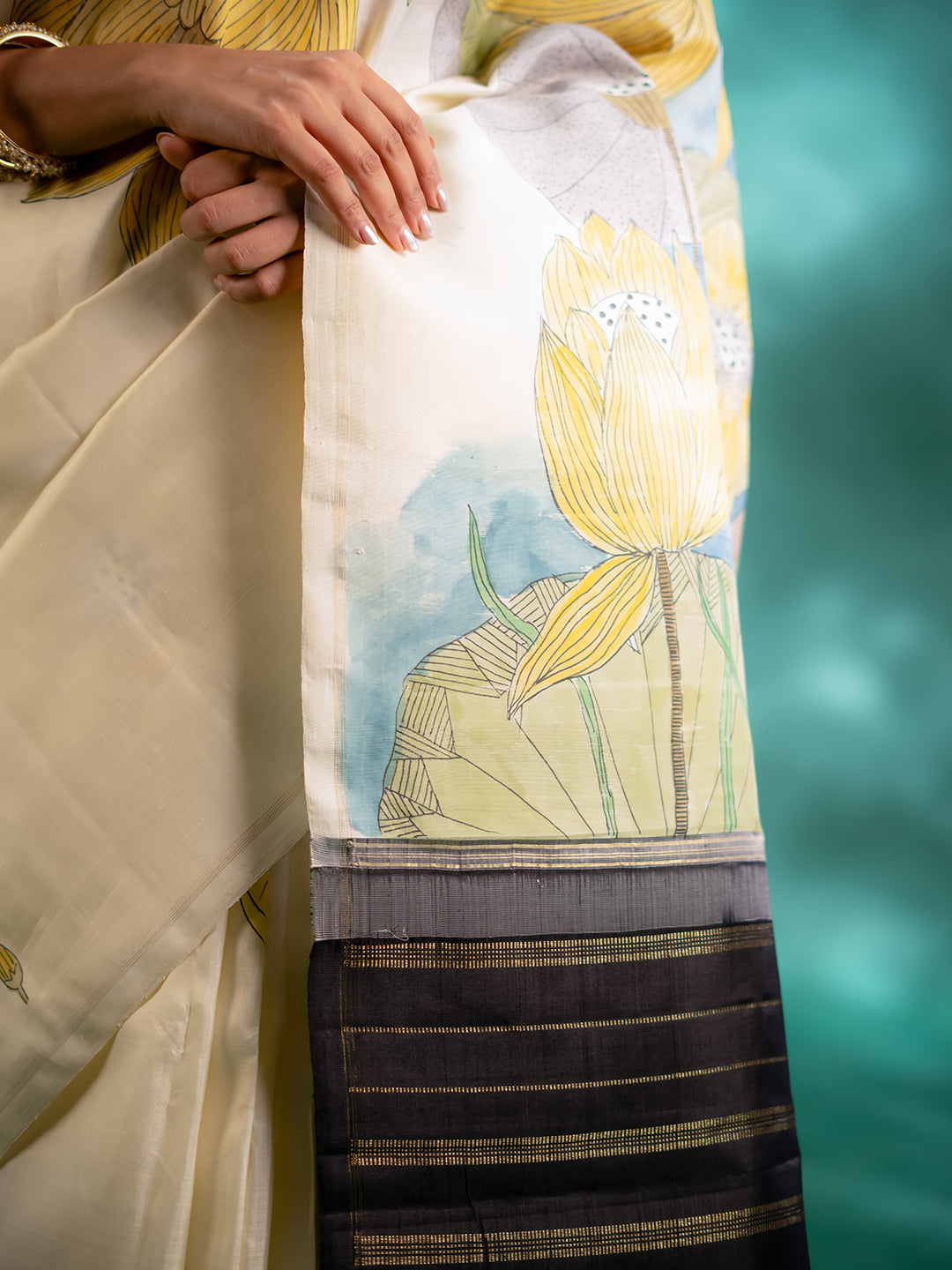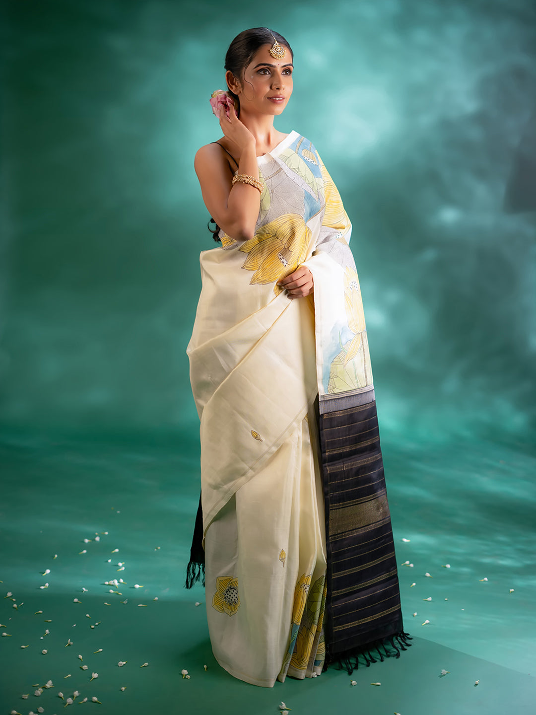 Experience timeless elegance with our White Colour Kanchivaram Silk saree, adorned with exquisite hand-painted lotus motifs. Crafted from pure zari and pure silk, this saree features a striking black zari-striped pallu that adds a sophisticated contrast. Complete with a plain blouse, it offers a perfect blend of traditional craftsmanship and refined style, ideal for elevating any special occasion.