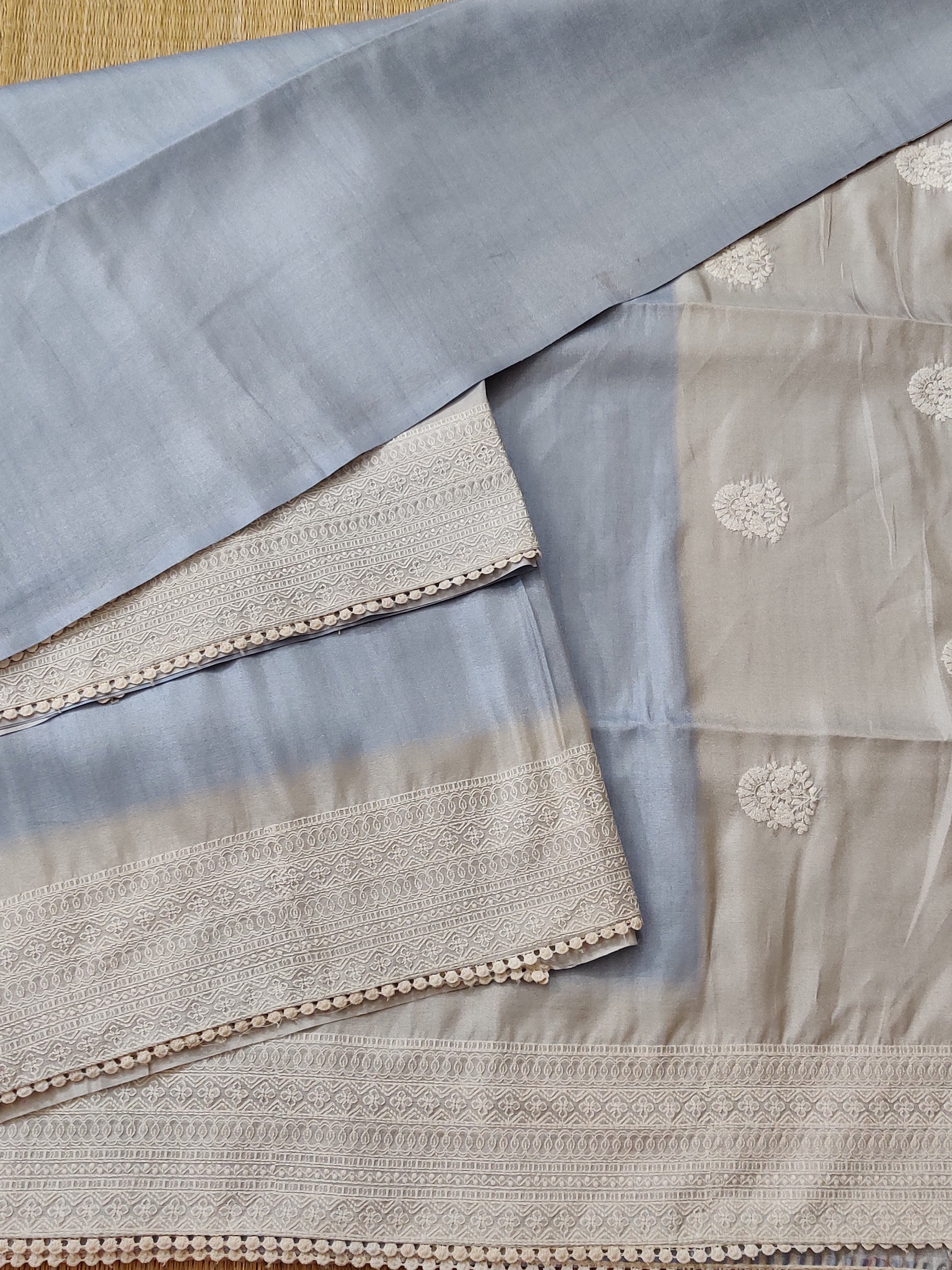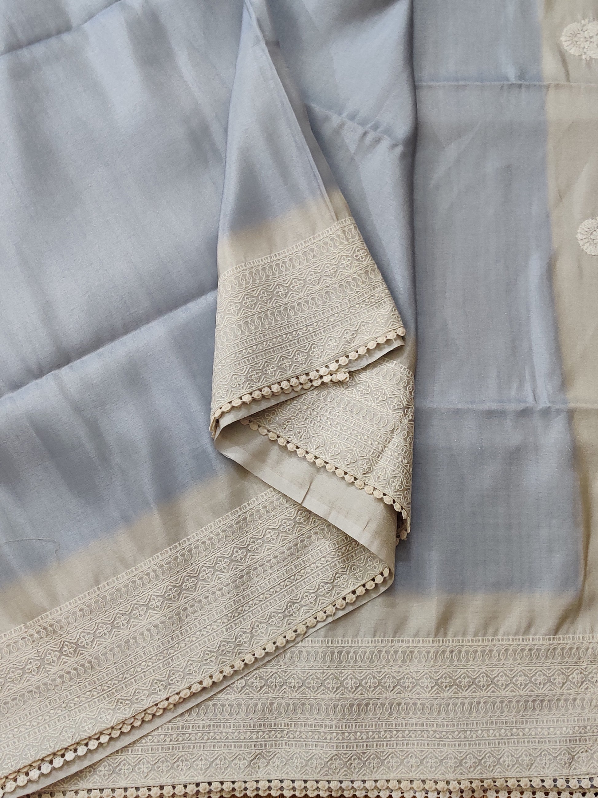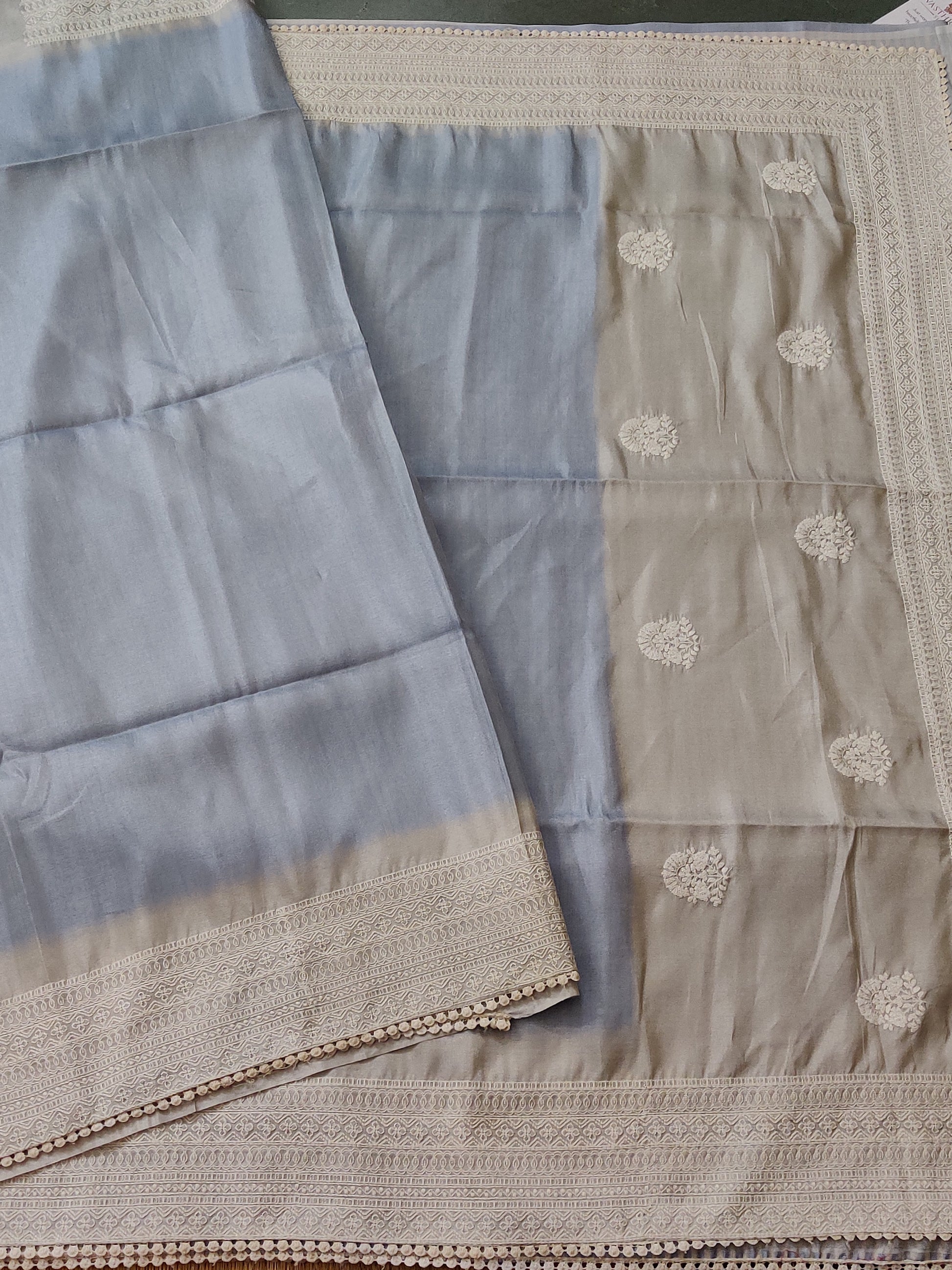 This semi-tissue saree features a soft light blue plain body paired with an off-white embroidered border and pallu, creating an elegant and refined contrast. The accompanying plain blouse enhances the subtle sophistication, making it ideal for occasions that demand understated elegance. Combining breathable comfort with a timeless design, this saree offers a seamless fusion of traditional craftsmanship and contemporary style.