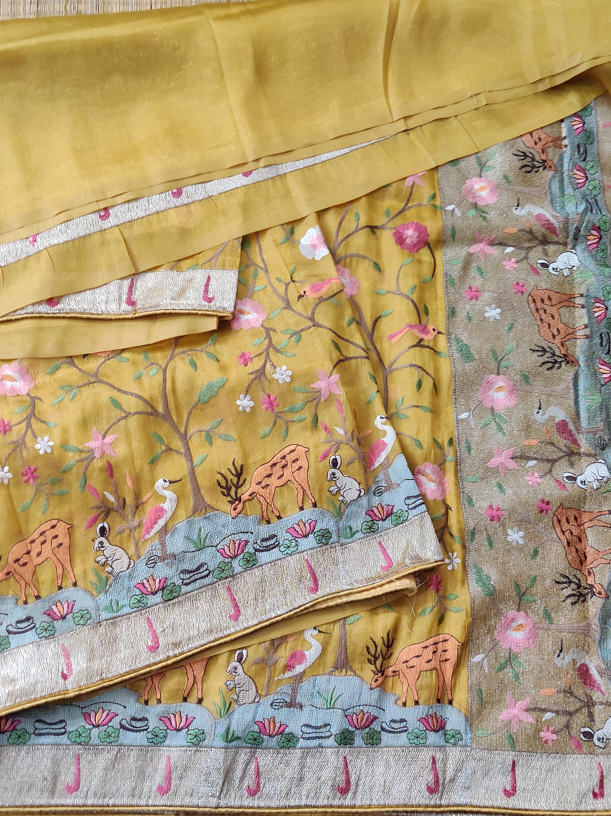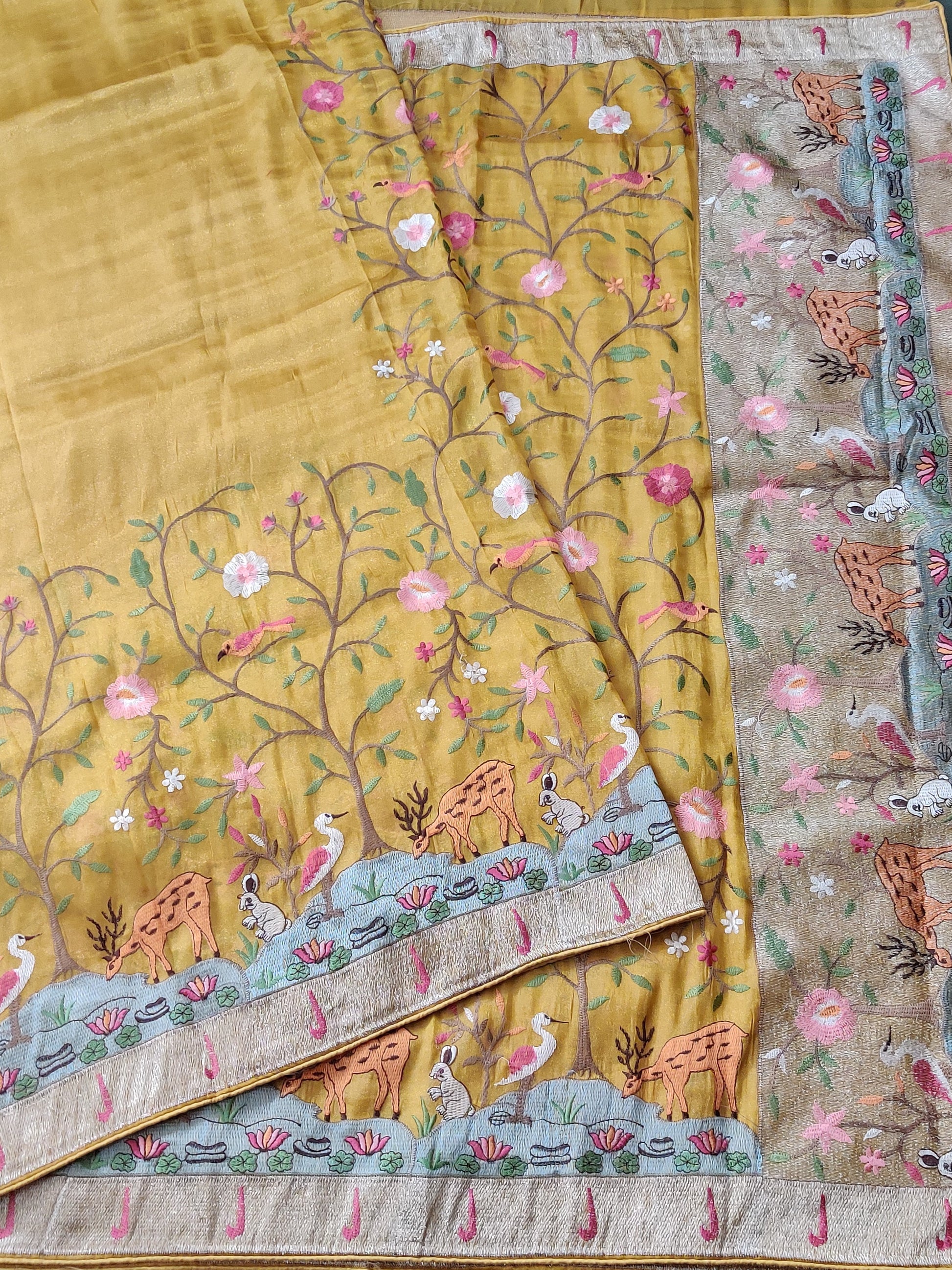 This mustard yellow semi-tissue saree features exquisite Vanasingaram embroidery on the body, complemented by a rich zari border and an intricately embroidered pallu. Paired with a matching self-colour butta blouse, it offers a refined blend of traditional craftsmanship and elegant design, perfect for festive occasions and formal events.