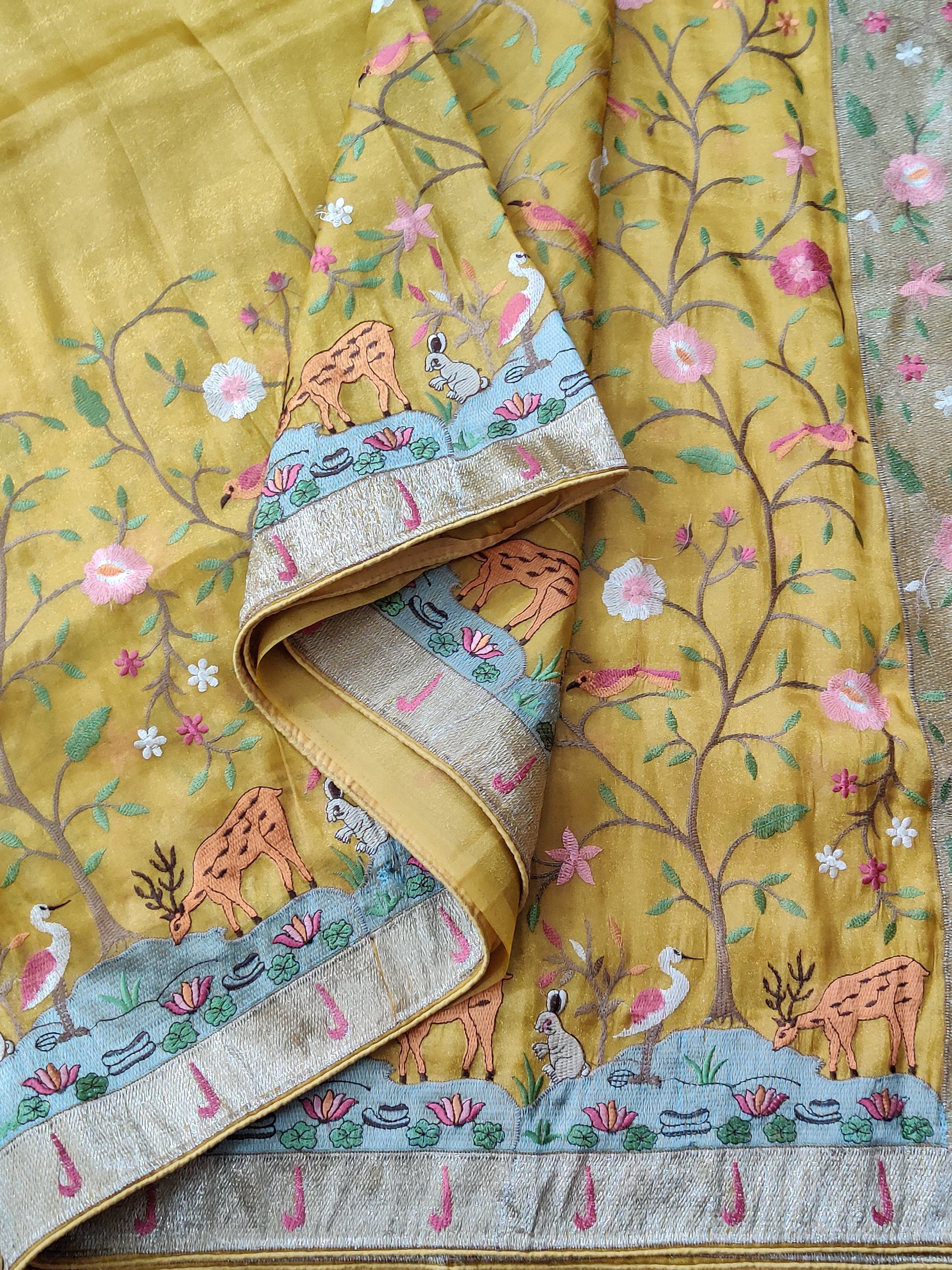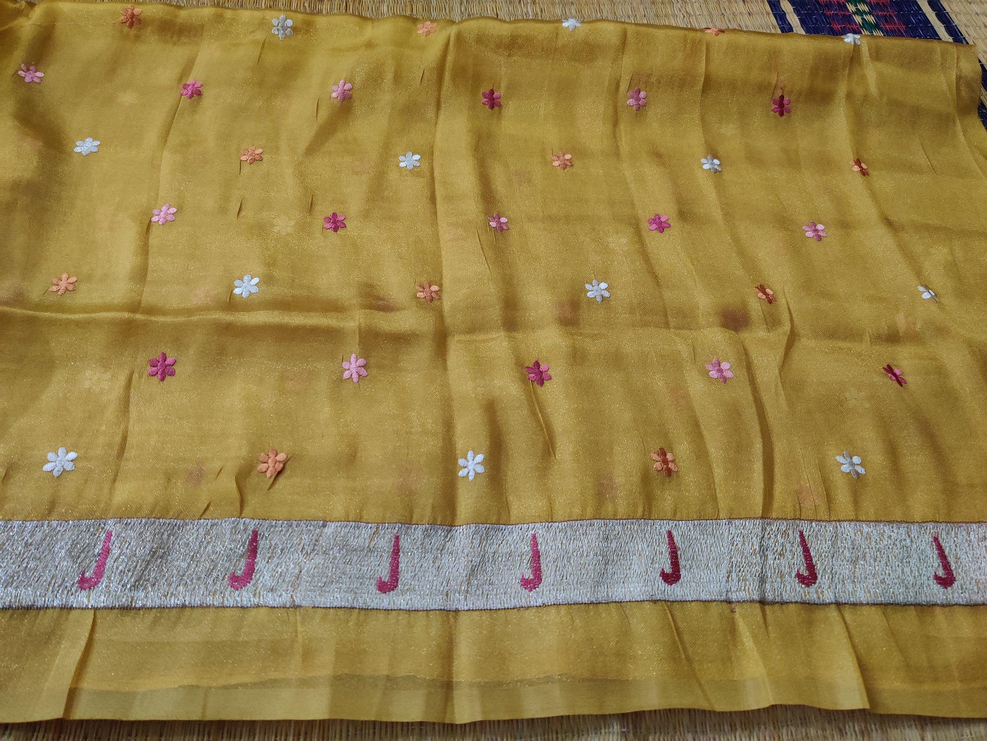 Mustard Yellow Colour Semi Tissue Saree With Vanasingaram Embroidery Body Code : VB0149