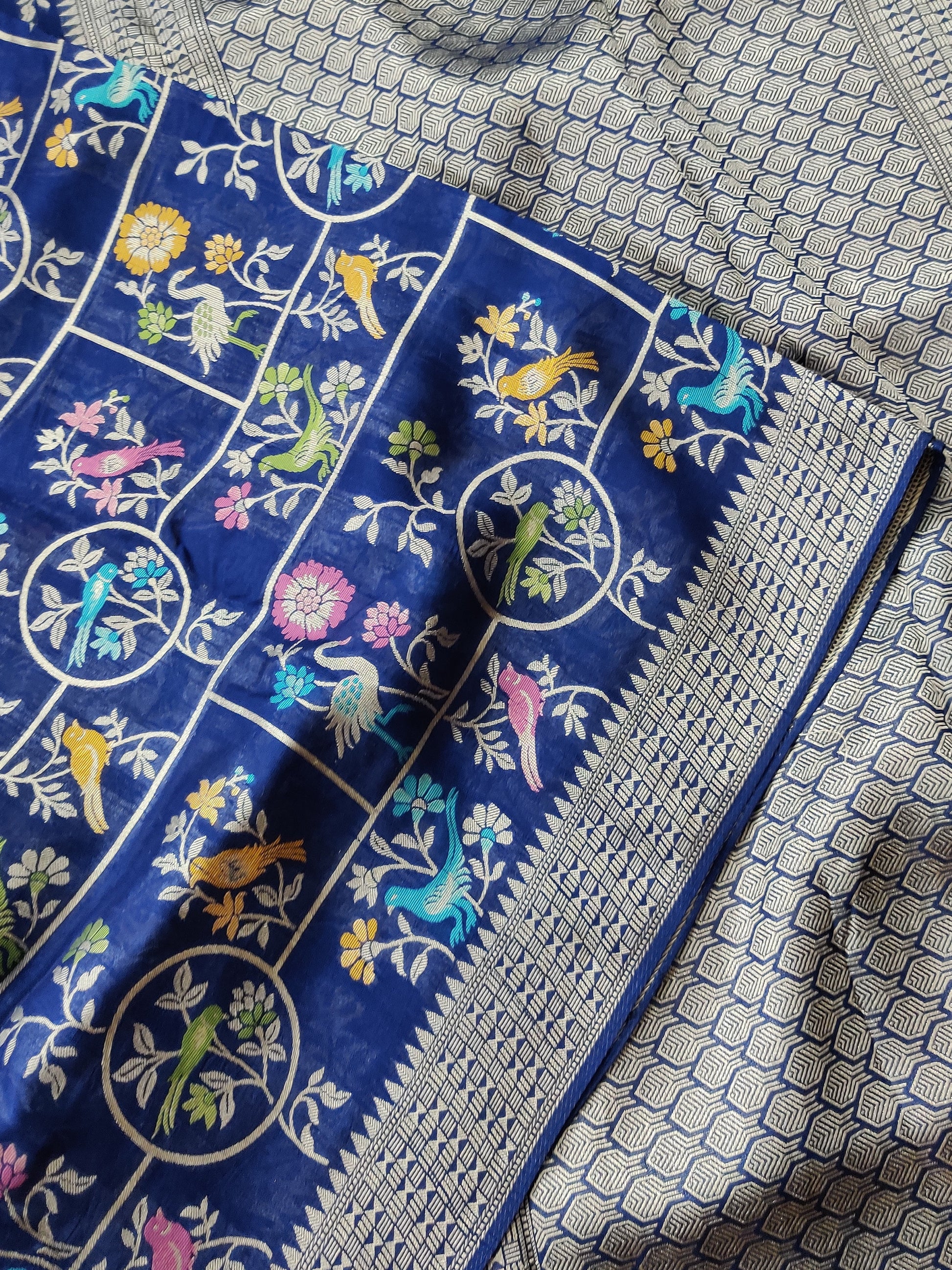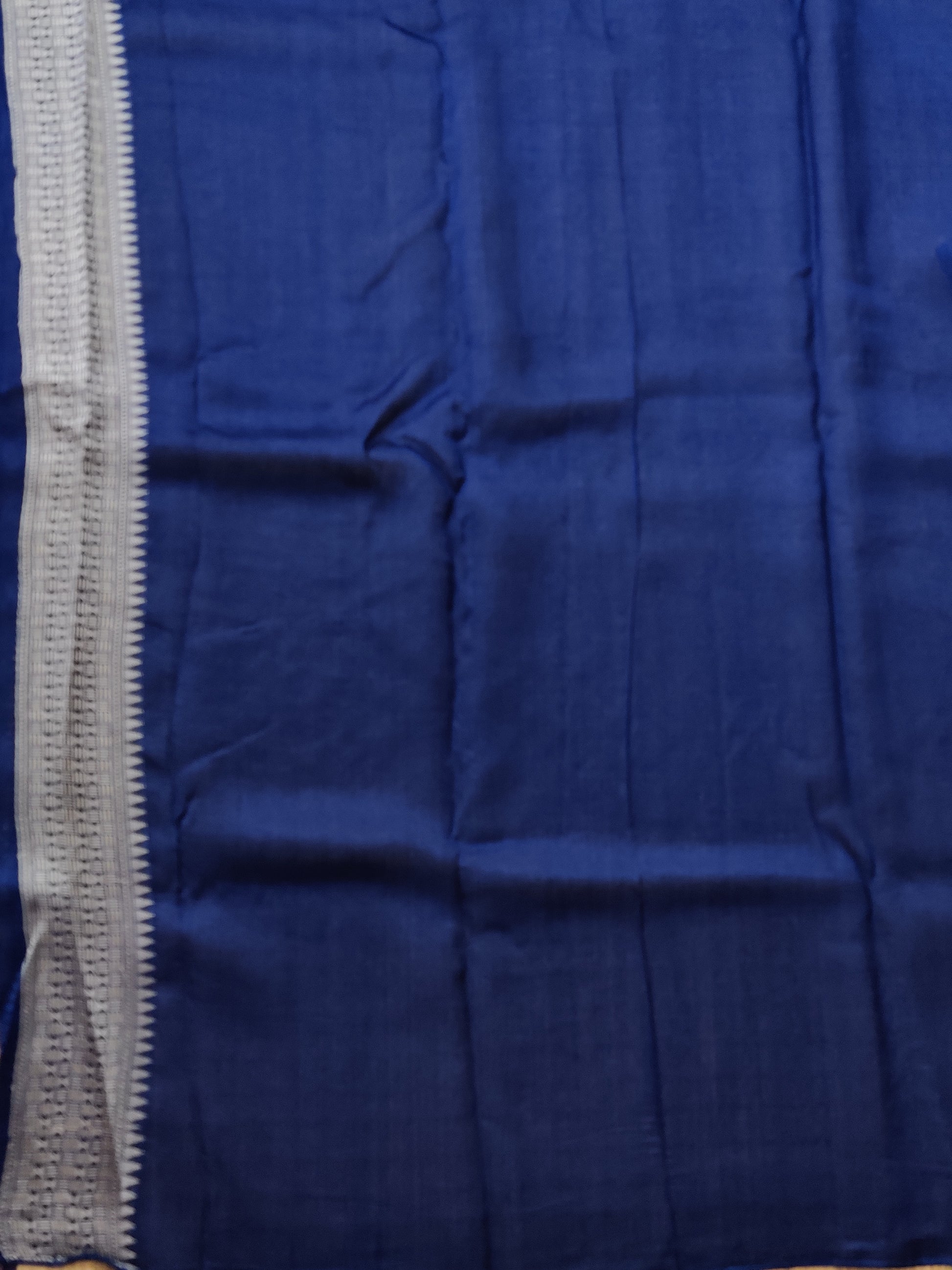 This semi tussar georgette saree in elegant blue features a delicate meenakari thread-woven design across its body, complemented by a silver thread border and pallu. Its lightweight fabric ensures comfort while maintaining a sophisticated look, ideal for festive and formal events. Paired with a plain blouse, the saree highlights intricate craftsmanship and timeless artistry, making it a refined choice for discerning wearers.