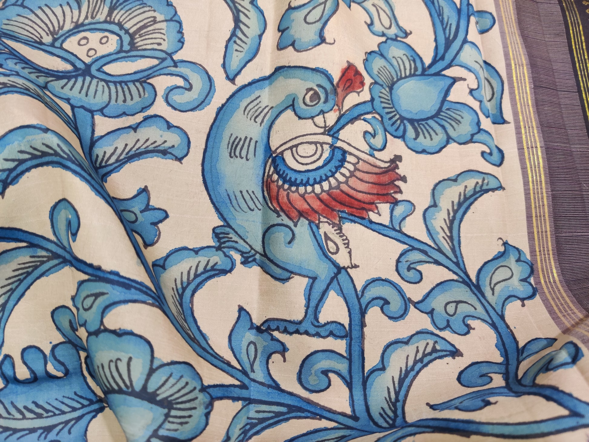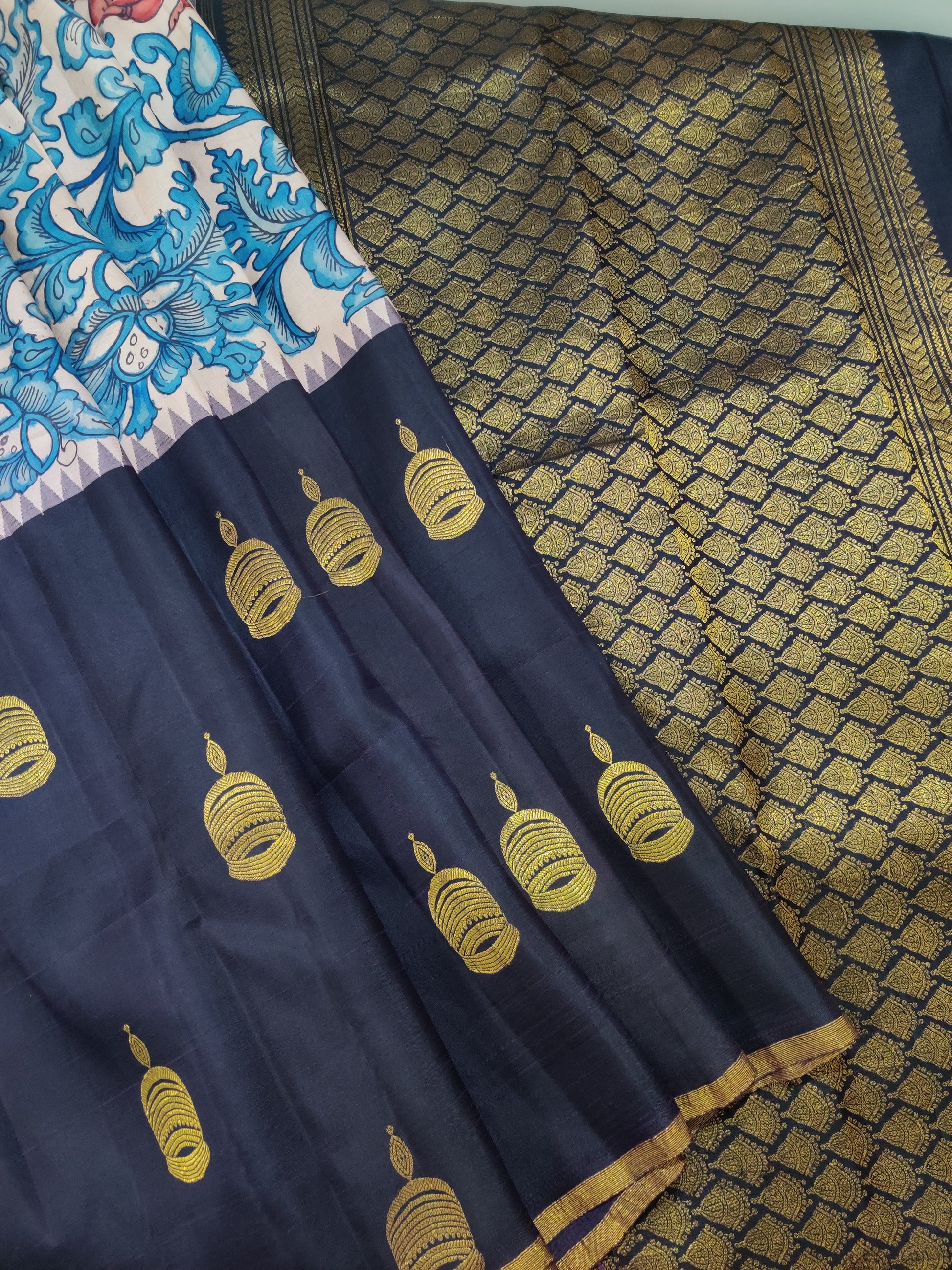 Elevate your traditional wardrobe with our Cream & Black Kanchivaram Silk Saree. This half/half saree features a beautiful hand-pen Kalamkari design, adorned with a black zari border and rich zari pallu. The accompanying plain blouse completes the elegant look. Experience the perfect blend of style and comfort with our saree.