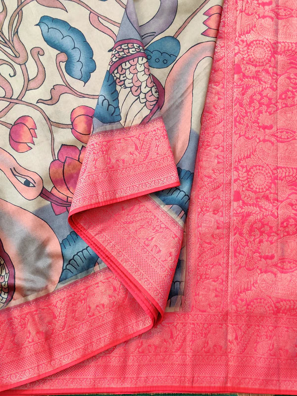 Light Yellow Colour Semi Banarasi Saree With Kalamkari Digital Print All Over Code : VB0220