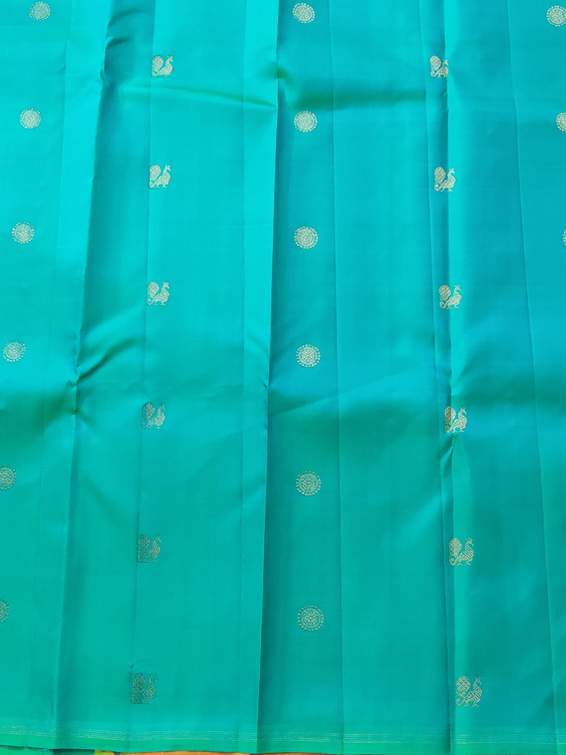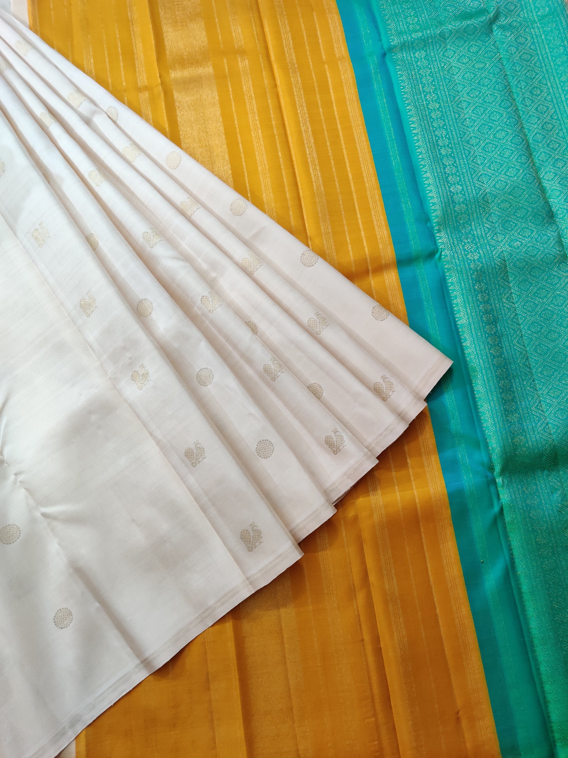 Cream Colour Borderless Kanchivaram Silk Saree With Zari Peacock Motif All Over : KA0290